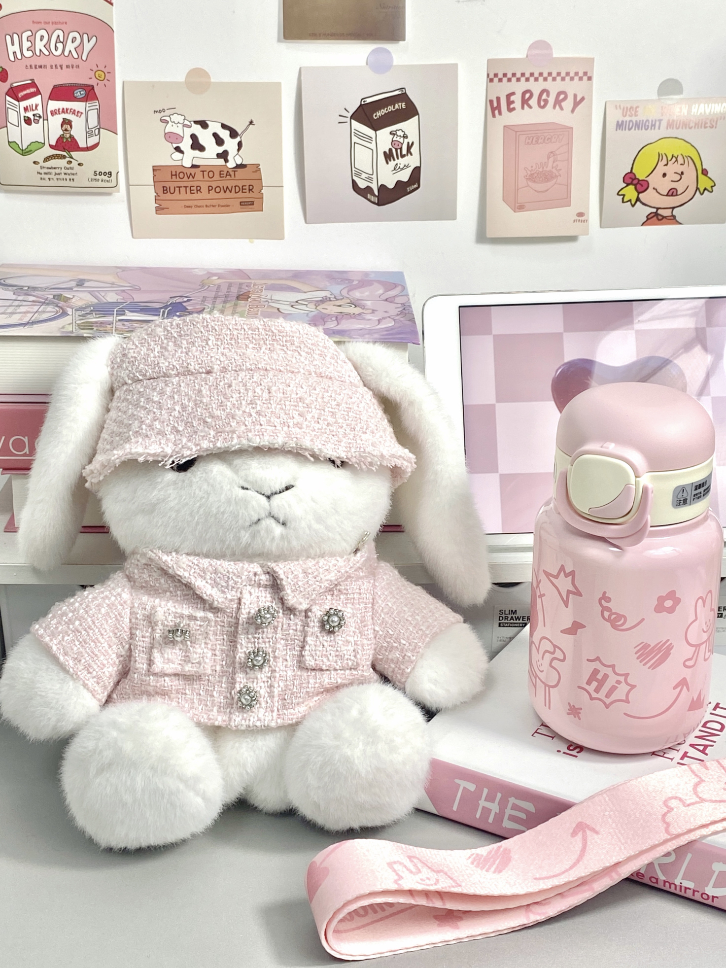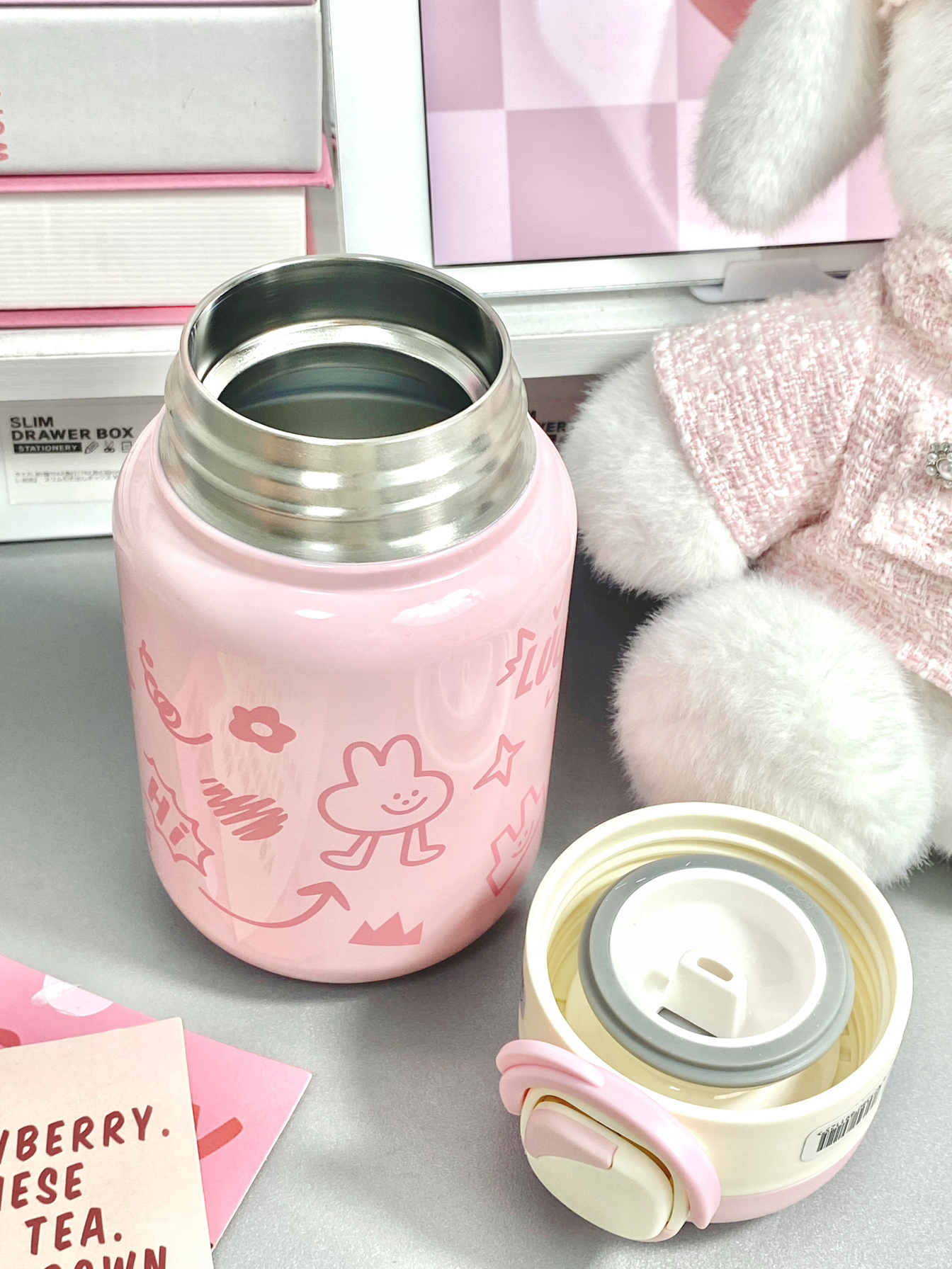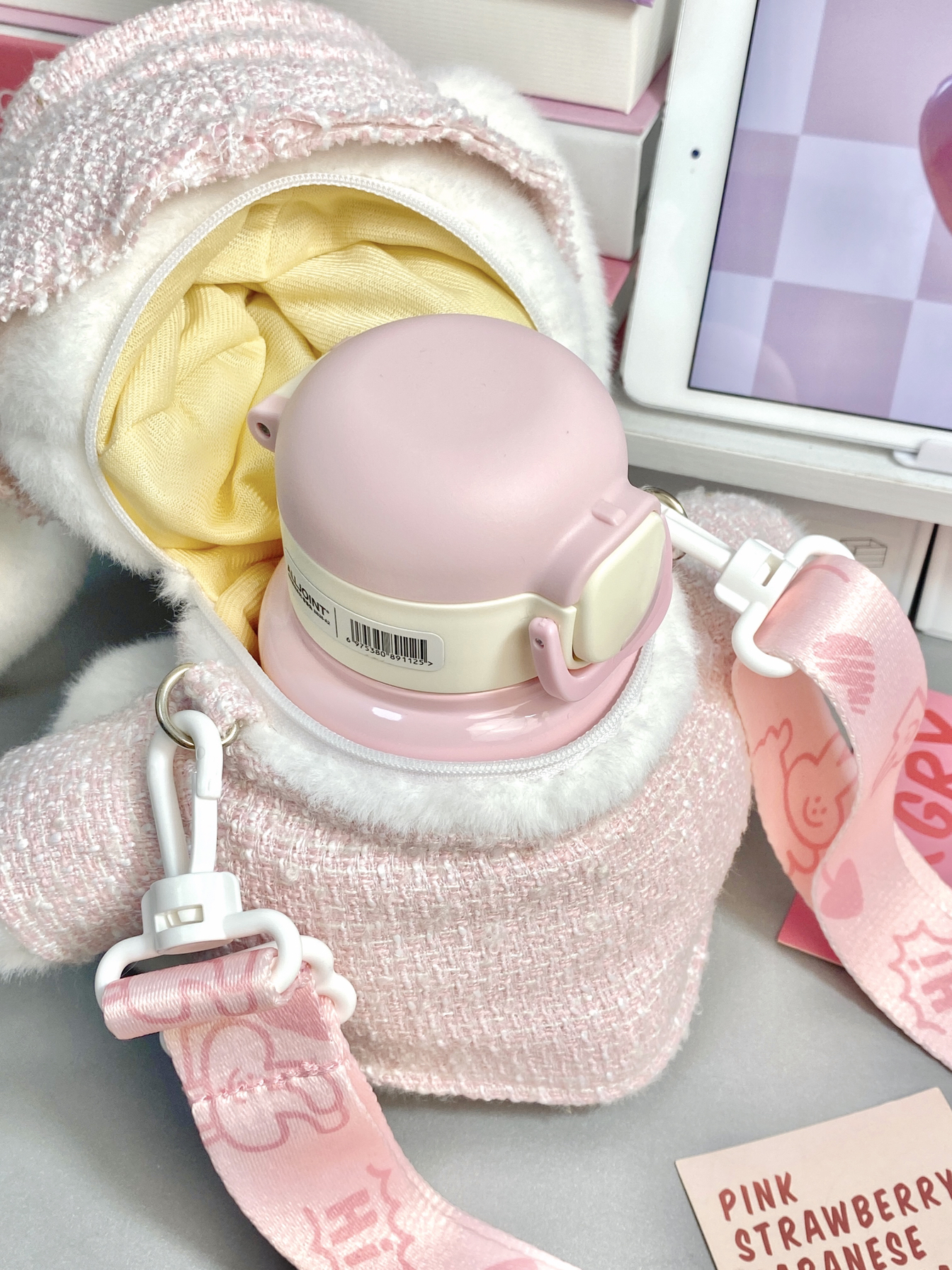 平常不爱喝水的本人 买了可爱水杯以后真的会经常喝水 粉嘟嘟的是公主用的吧~ 420ml的容量适合随身携带 而且是316不锈钢内胆 保温效果还不错 还配了小香风的兔兔玩偶和肩带 可以把水杯放进去 出门一整只背上就蛮方便哒~ 用来送女朋友送闺蜜都ok