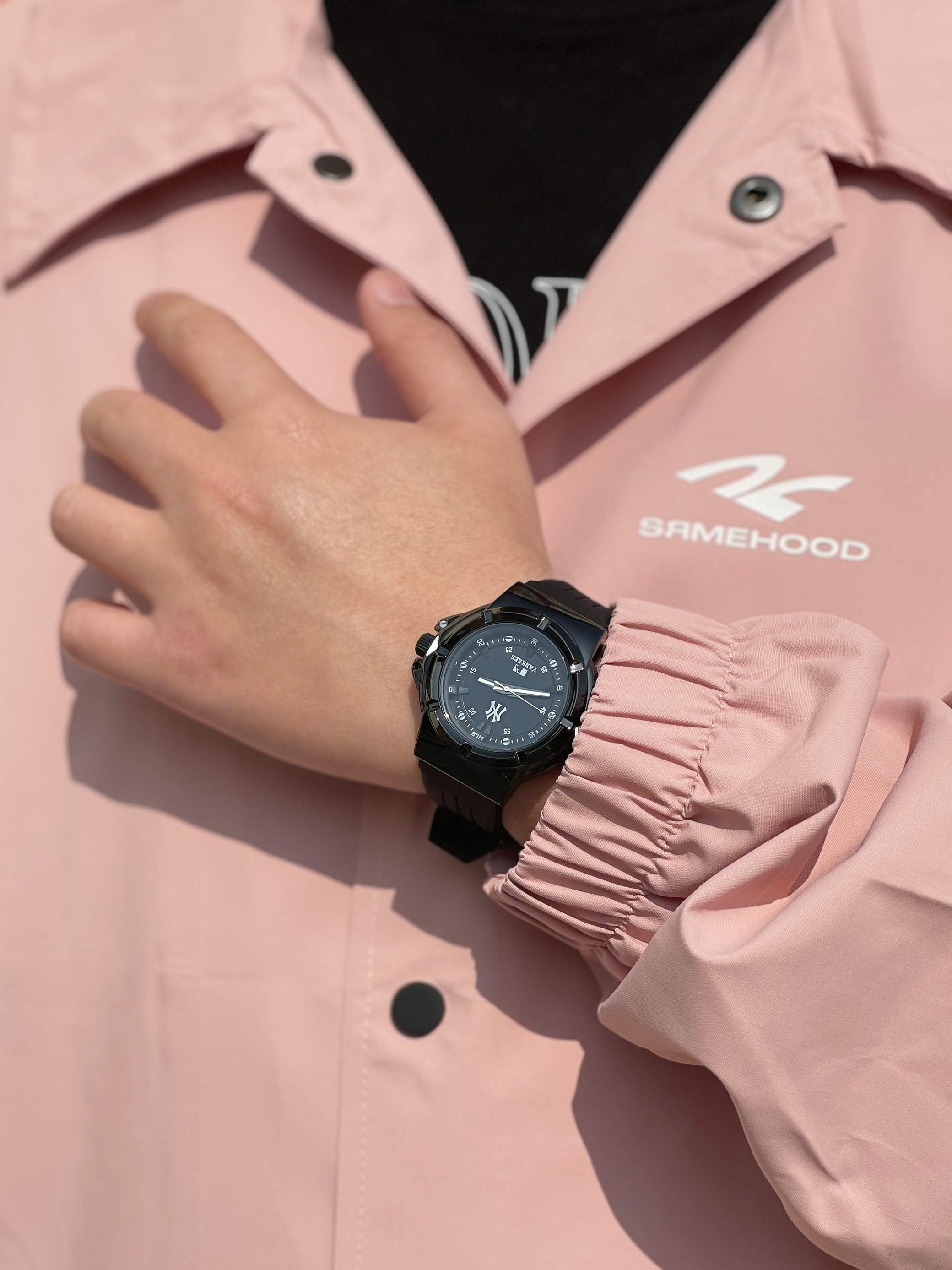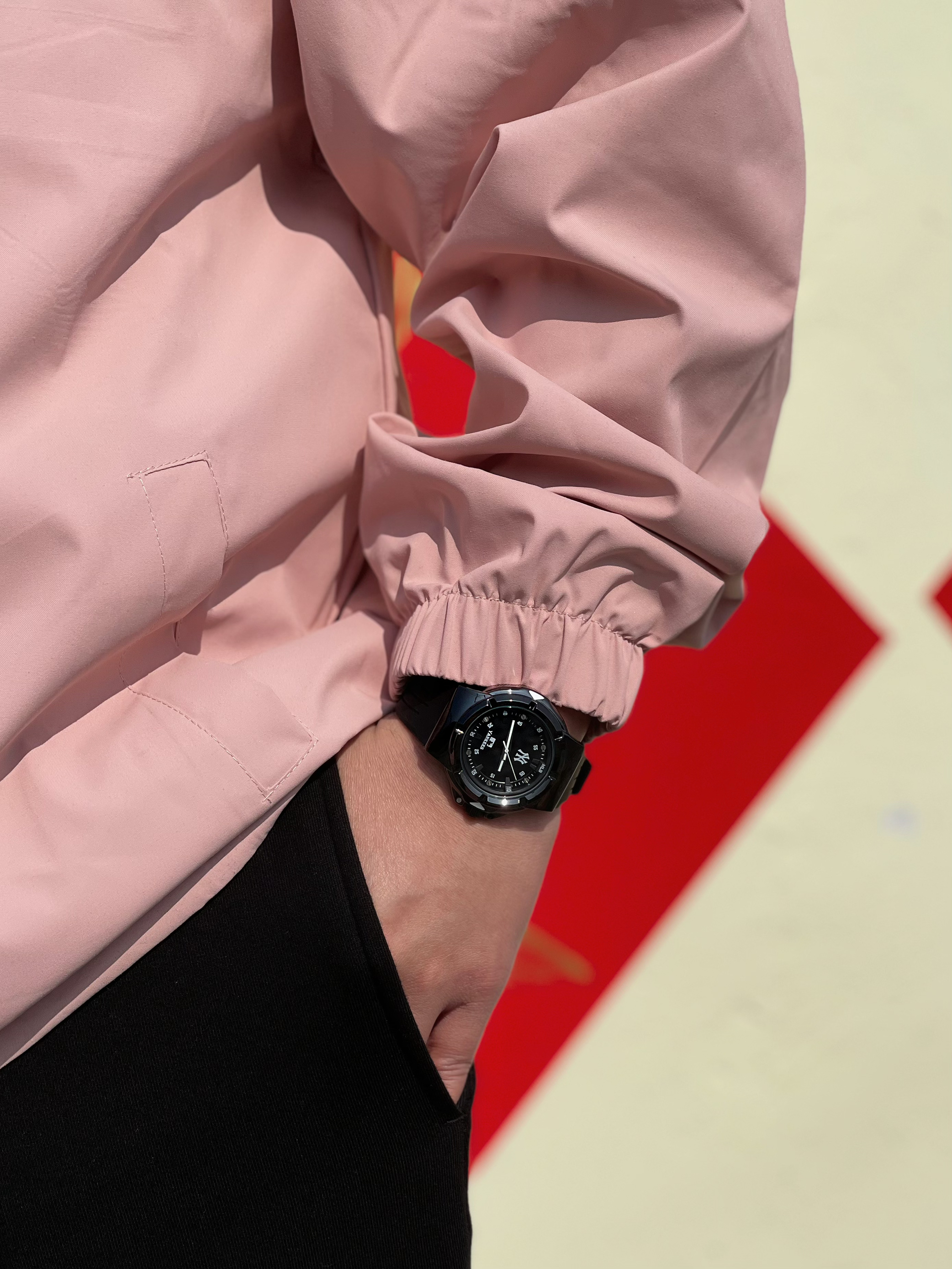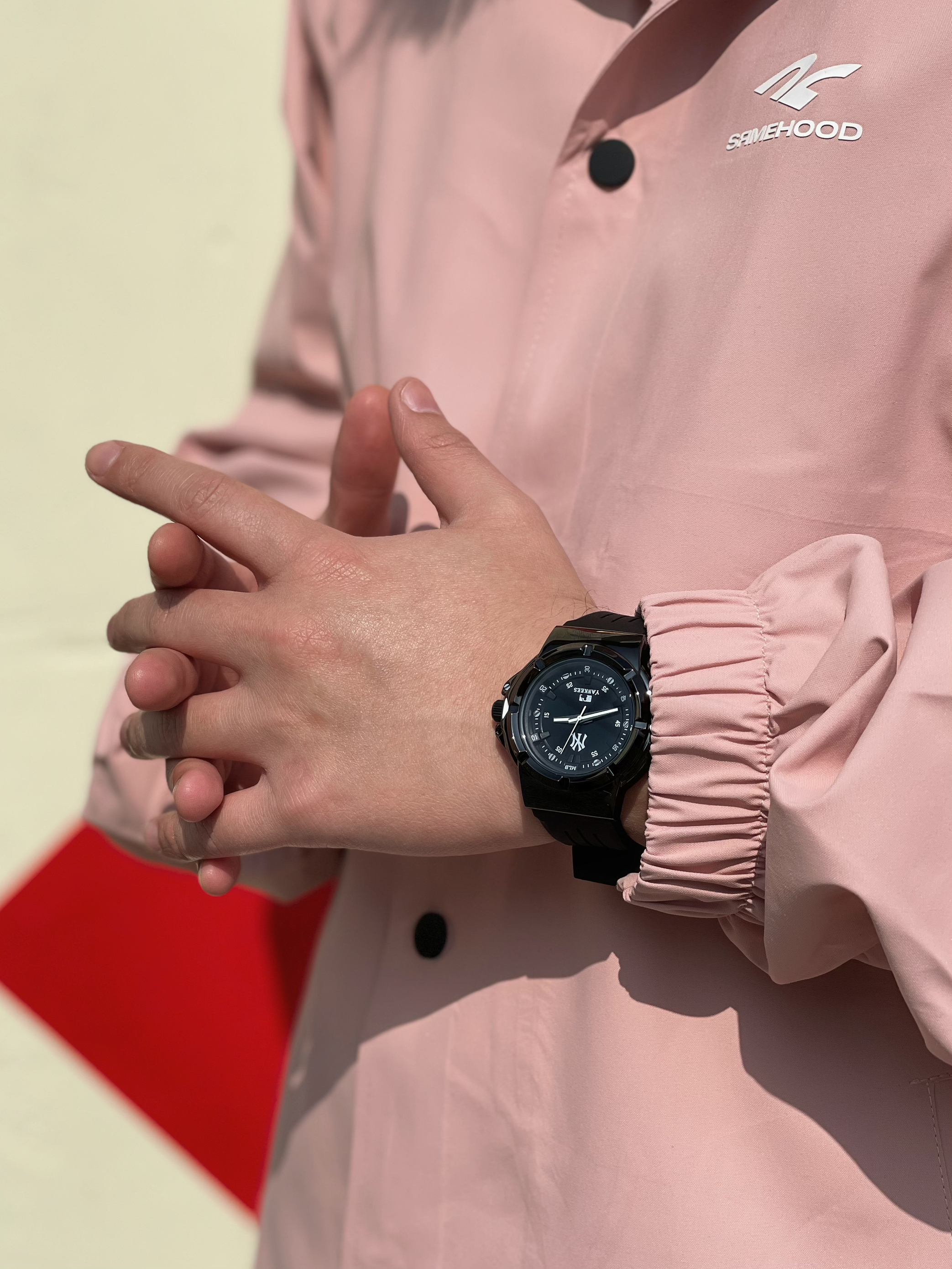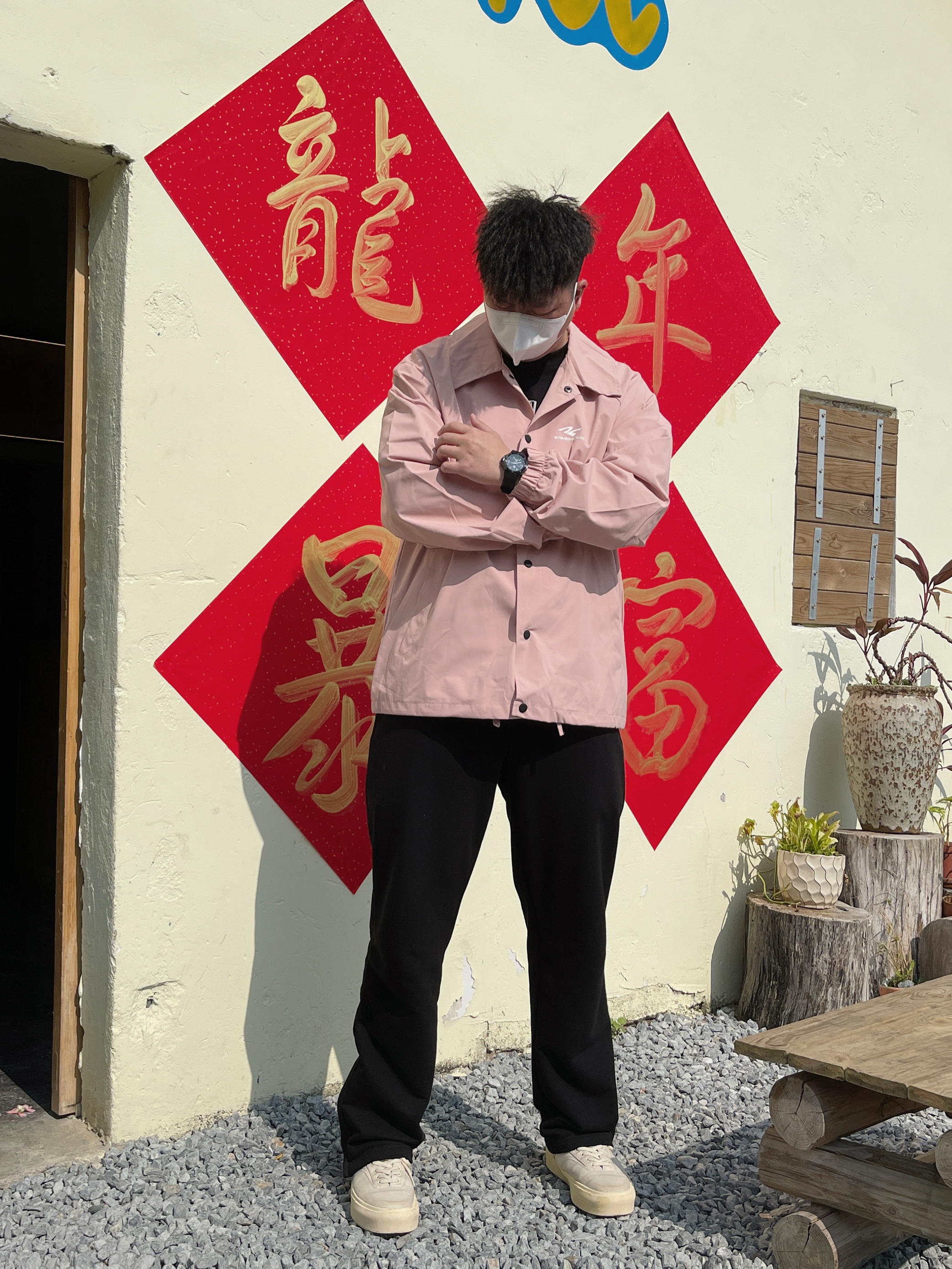 今日穿搭分享 上衣粉色夹克内搭黑色T恤 显嫩活力的粉色太好看 下身黑色直筒长裤 加长遮鞋的款式特显腿长 来双浅色休闲板鞋 自带一点增高 一米八直视感 穿搭的完成度还需要一块百搭的手表⌚️ 全黑的设计耐看且高级 硅胶表带舒适防滑 是男人饰品必不可少的单品之一🤌🏻 👔 : SRME 👖 : UZIS ⌚️ : MLB