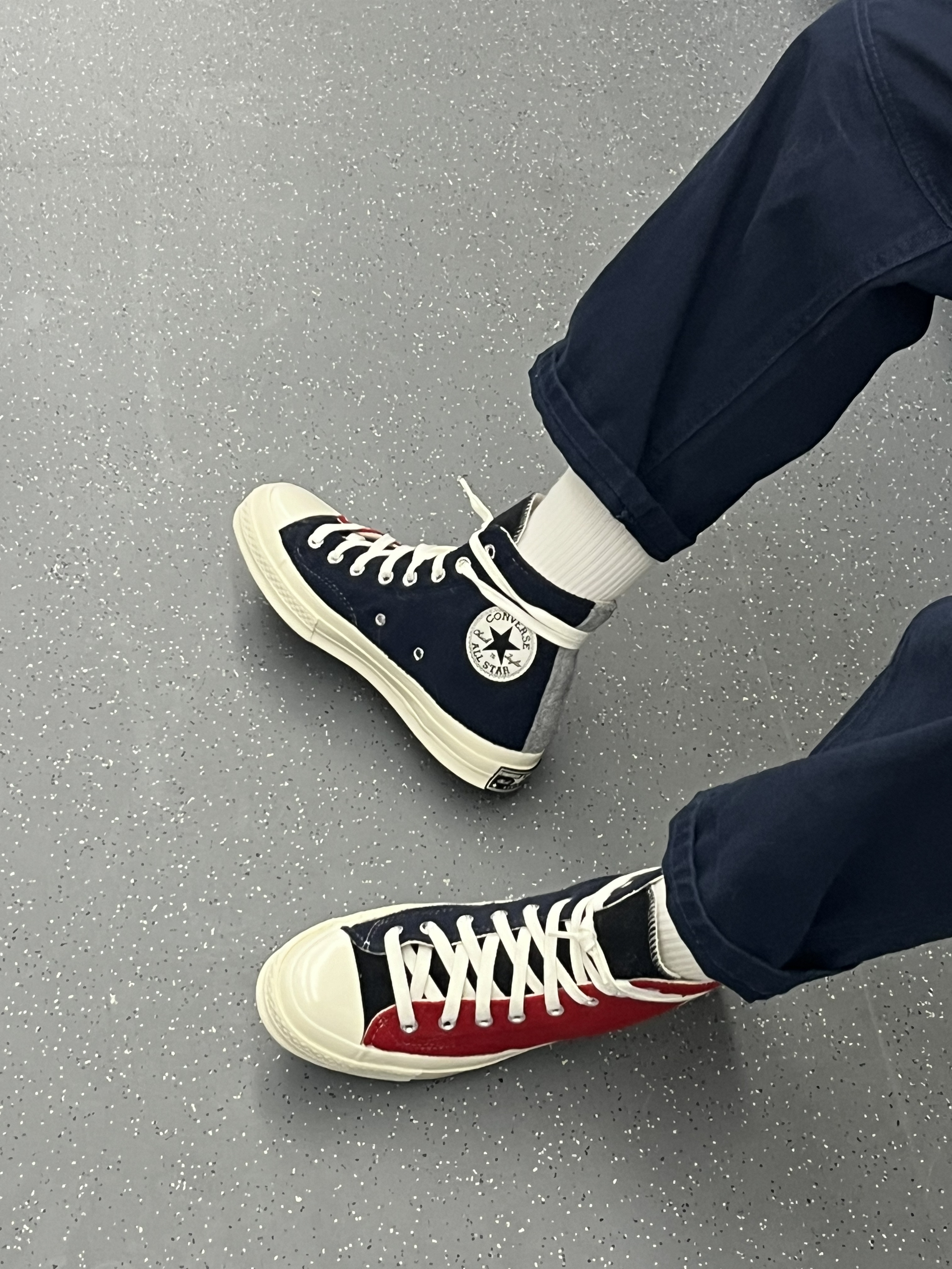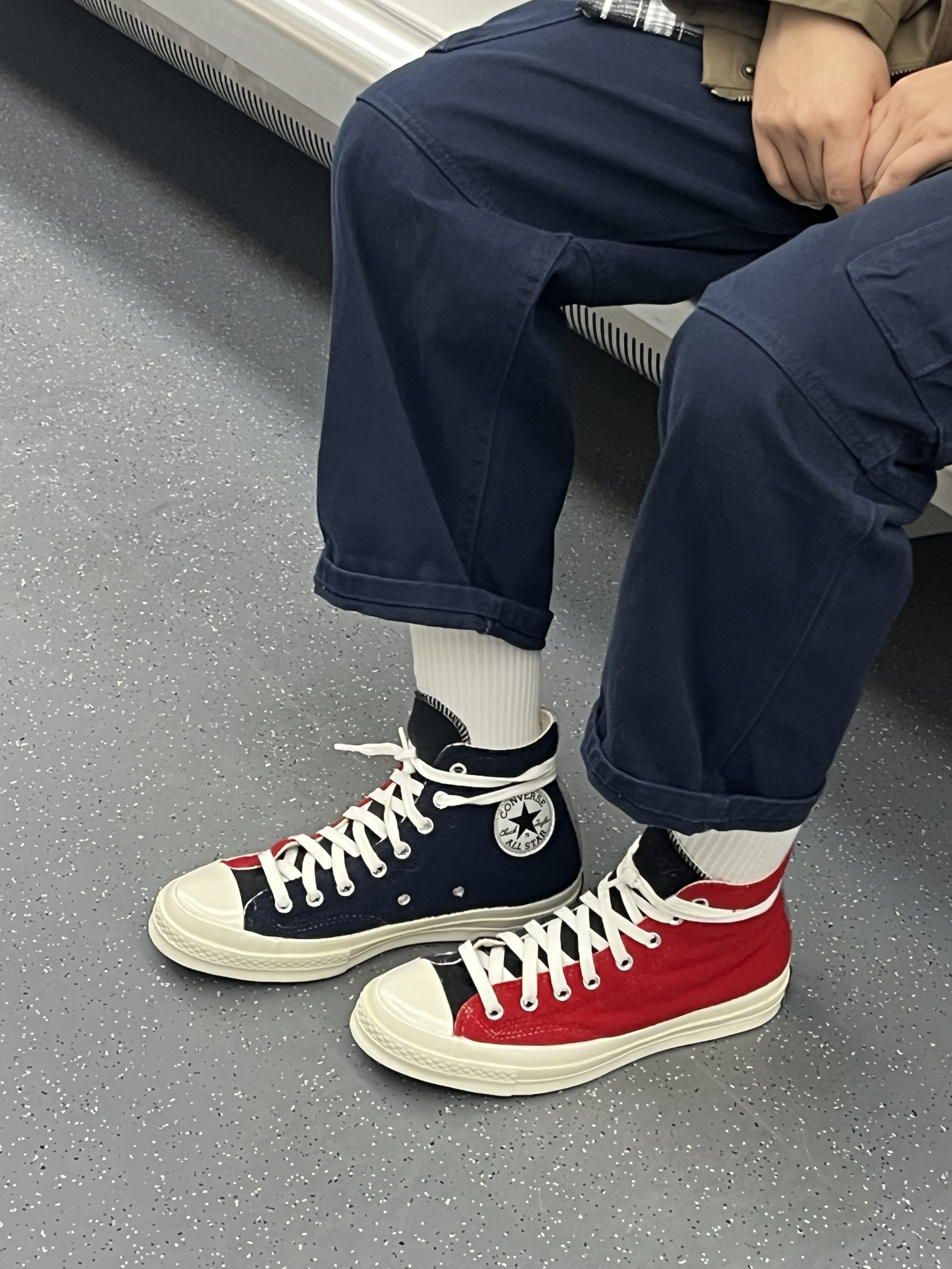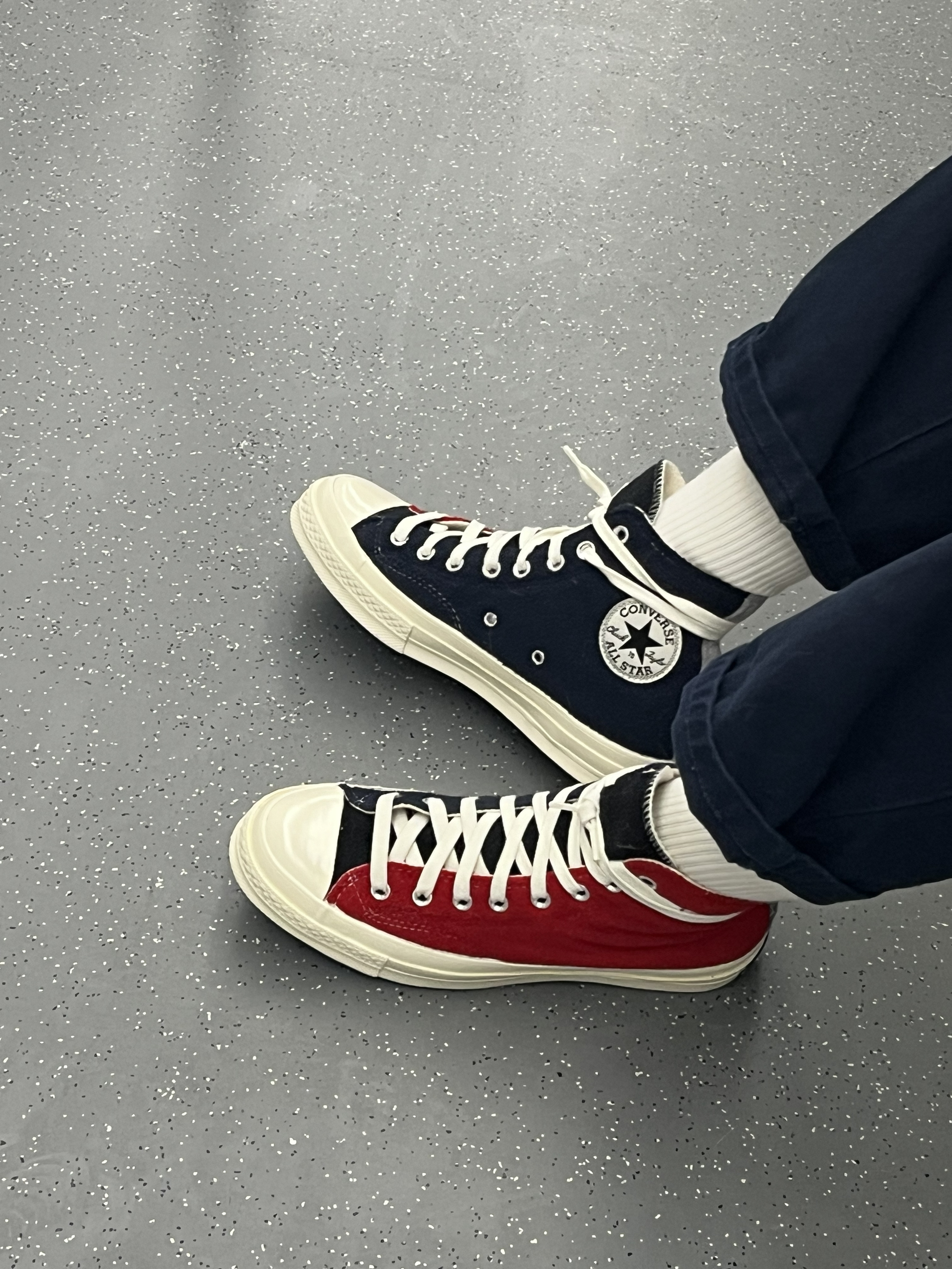 买到这双鞋匡威的红蓝鸳鸯配色 真是非常意料之外的惊喜 无意间在看到活动只要一张 没想到上脚还挺惊艳 1970s的鞋底比经典款稍软 踩上去很舒服 开学穿这双正合适!