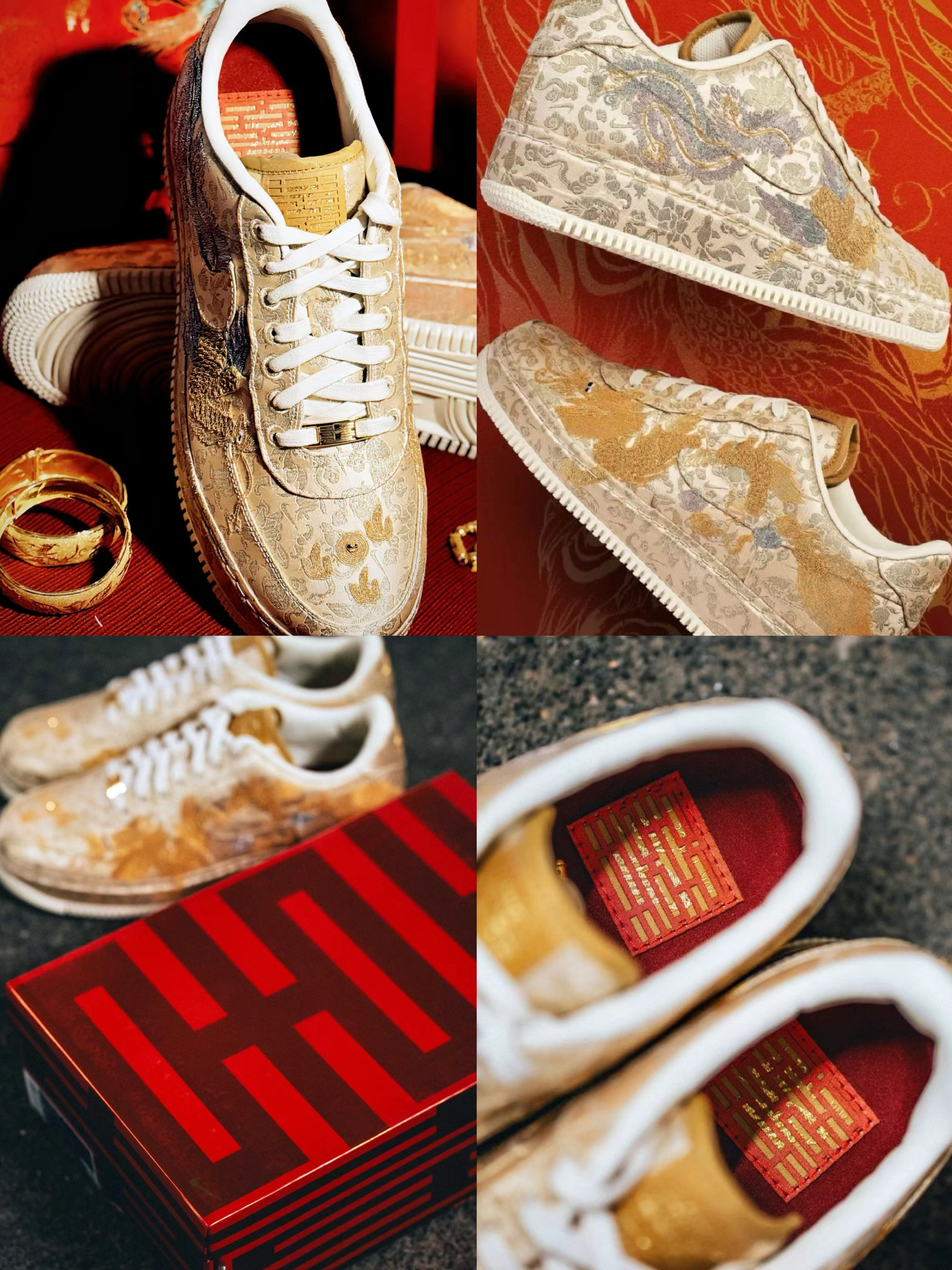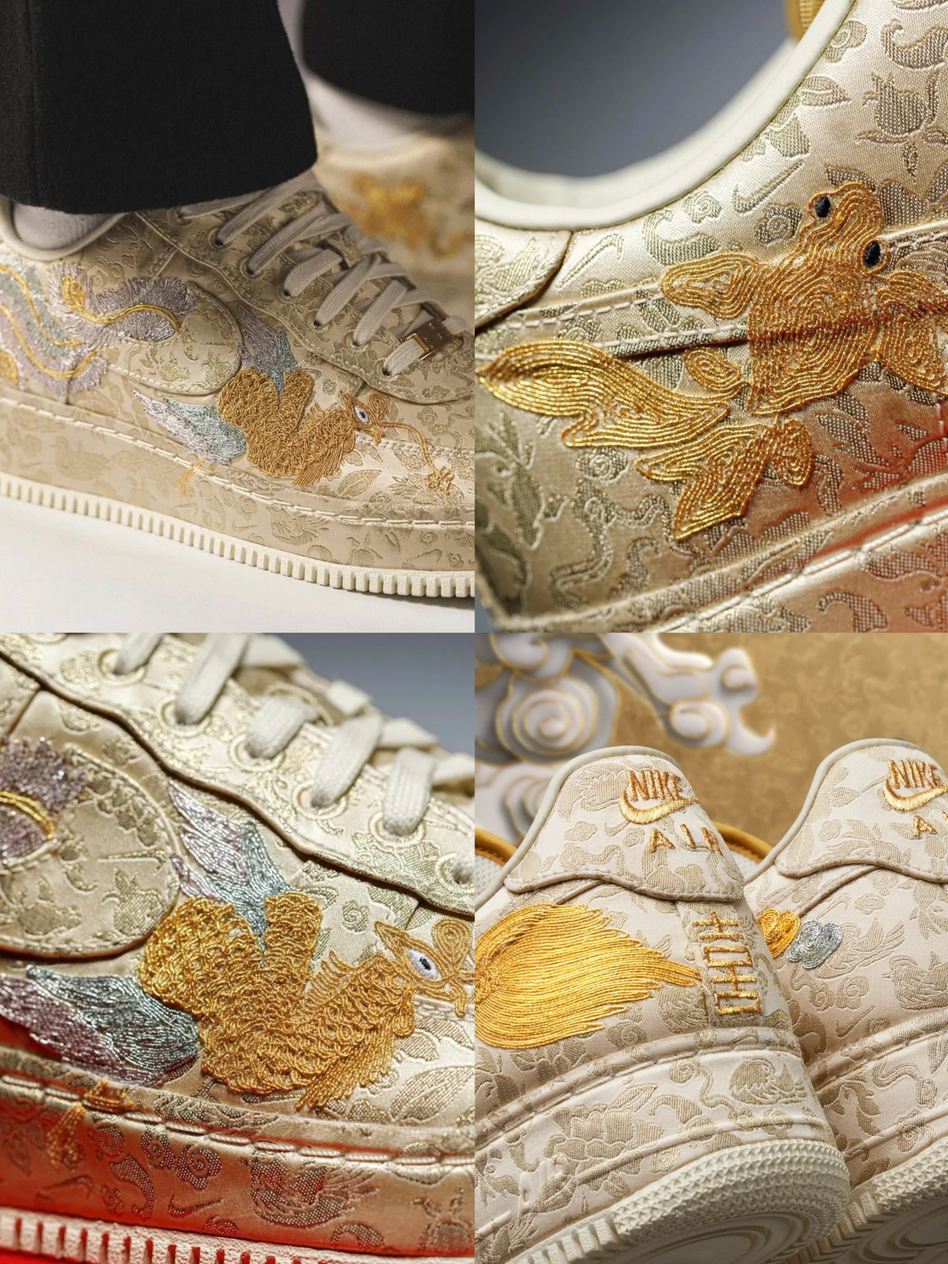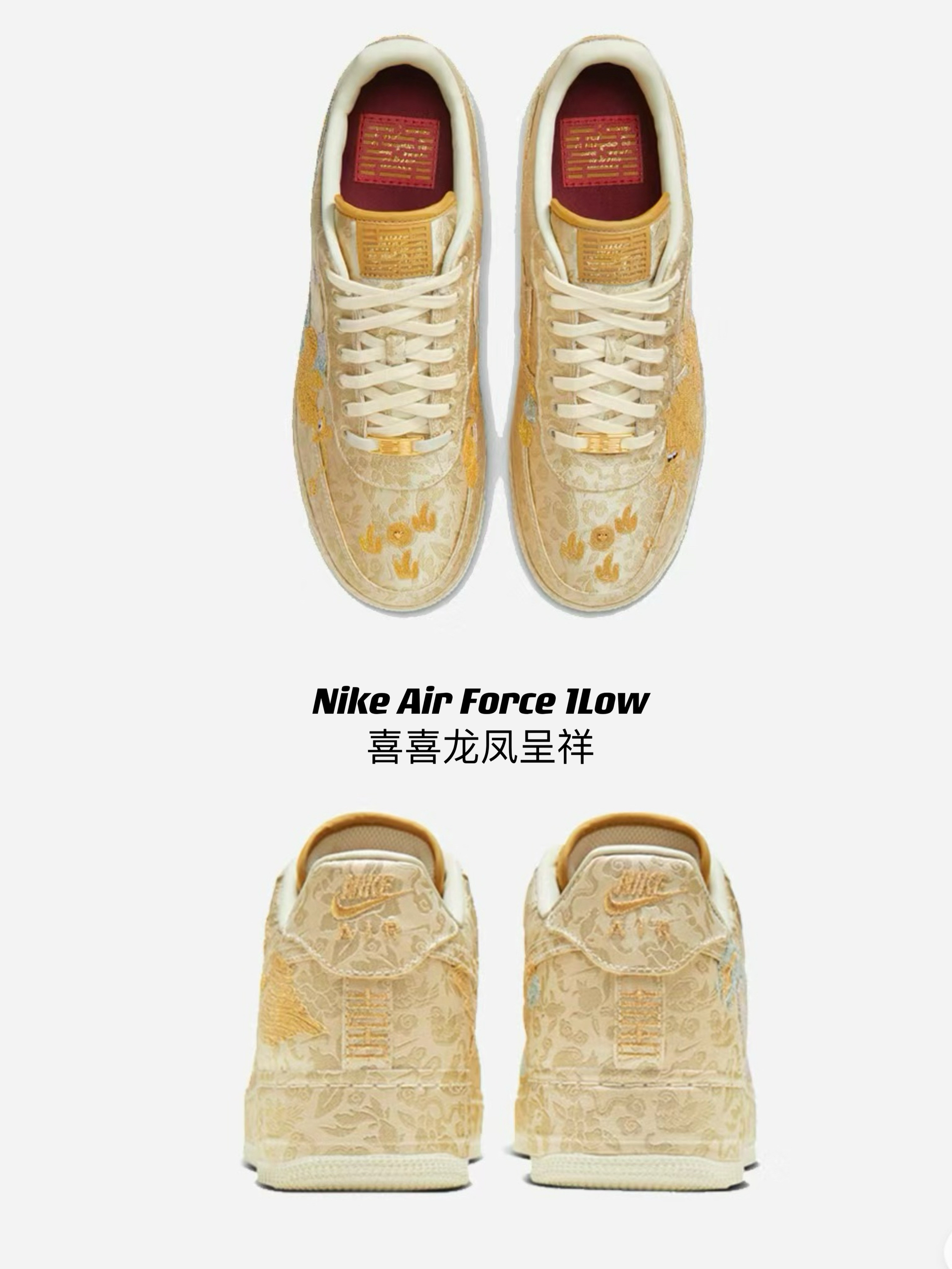超稀有!S级空军回归“龙凤呈祥” 龙年Nike Air Force 1Low“囍” 龙凤呈祥接好运!细节满满特质红色鞋盒 你爱了吗?反正我爱了 作为龙年的贺岁版本 Nike Air Force1「喜喜」 结合金色的腾龙、凤凰刺绣来呈现 寄寓「龙凤呈祥」的好兆头 细看设计,会发现鞋身上刺绣还包含了鸳鸯、金鱼 等图案搭配上金箔的配色算是给新年诠释很到位的作品。非常具有农历新年的特色材质细节也十分奢华。