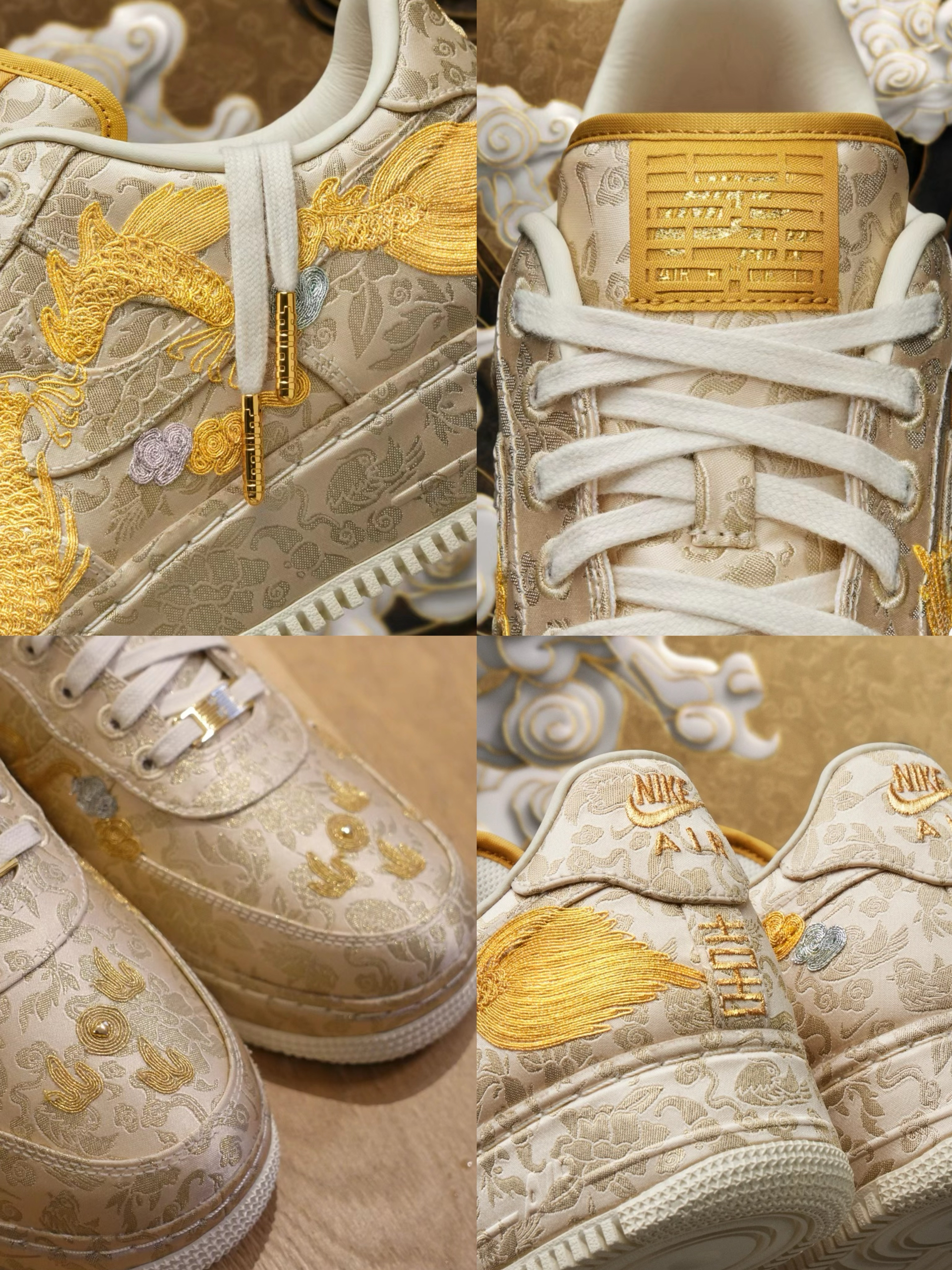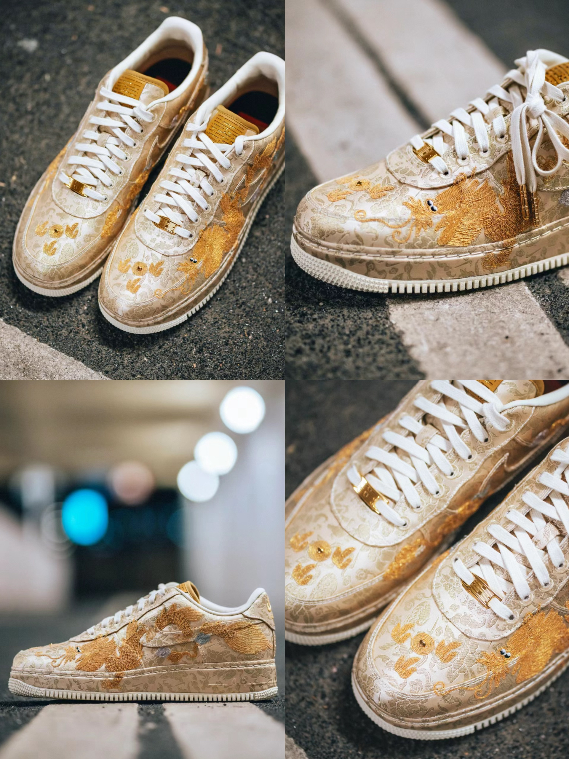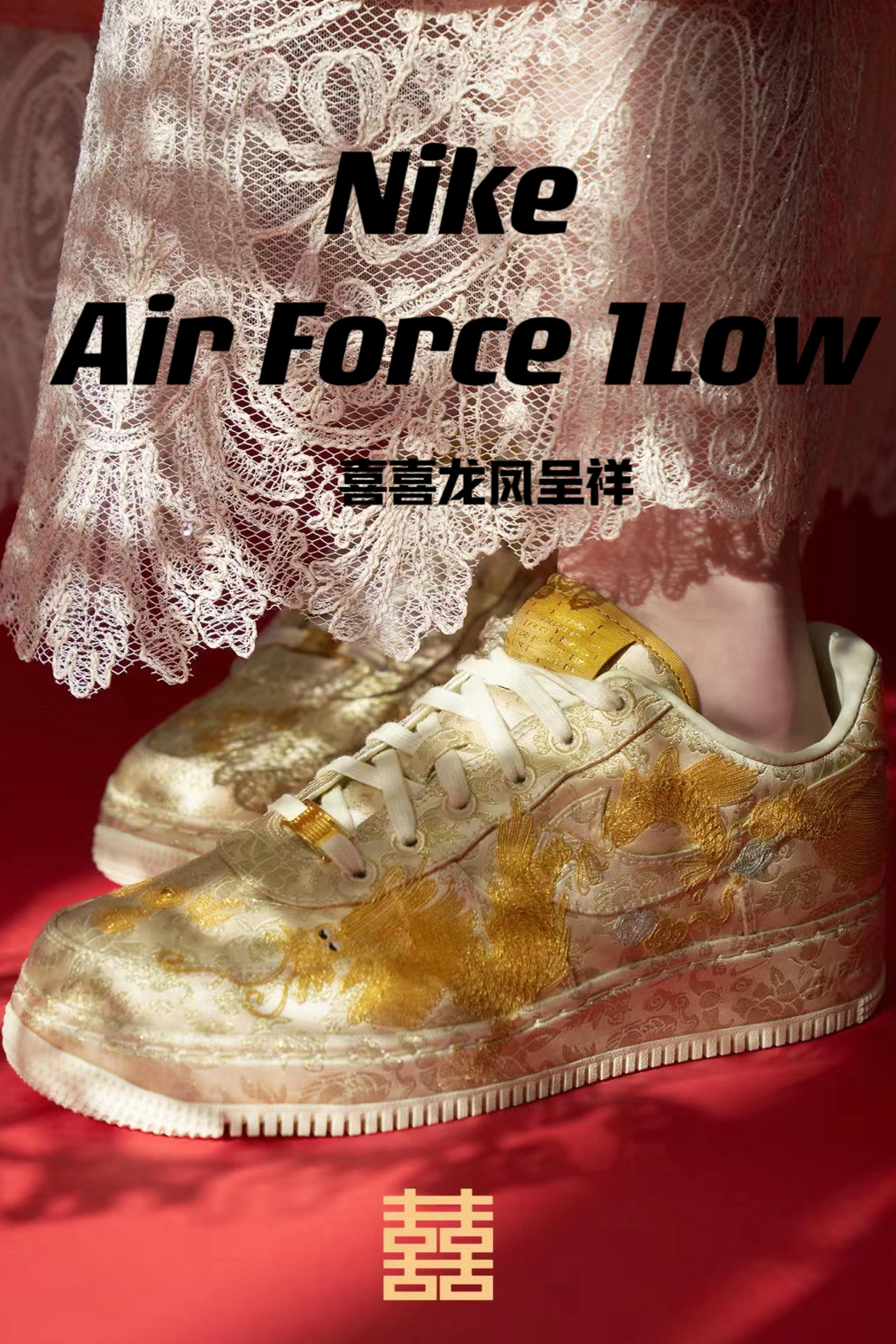 超稀有!S级空军回归“龙凤呈祥” 龙年Nike Air Force 1Low“囍” 龙凤呈祥接好运!细节满满特质红色鞋盒 你爱了吗?反正我爱了 作为龙年的贺岁版本 Nike Air Force1「喜喜」 结合金色的腾龙、凤凰刺绣来呈现 寄寓「龙凤呈祥」的好兆头 细看设计,会发现鞋身上刺绣还包含了鸳鸯、金鱼 等图案搭配上金箔的配色算是给新年诠释很到位的作品。非常具有农历新年的特色材质细节也十分奢华。