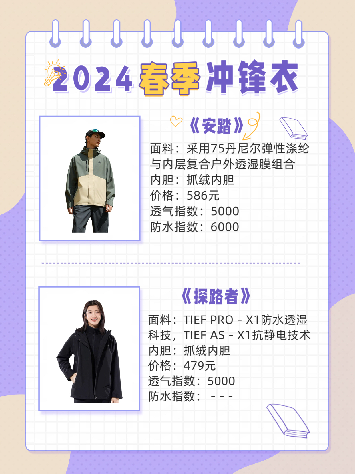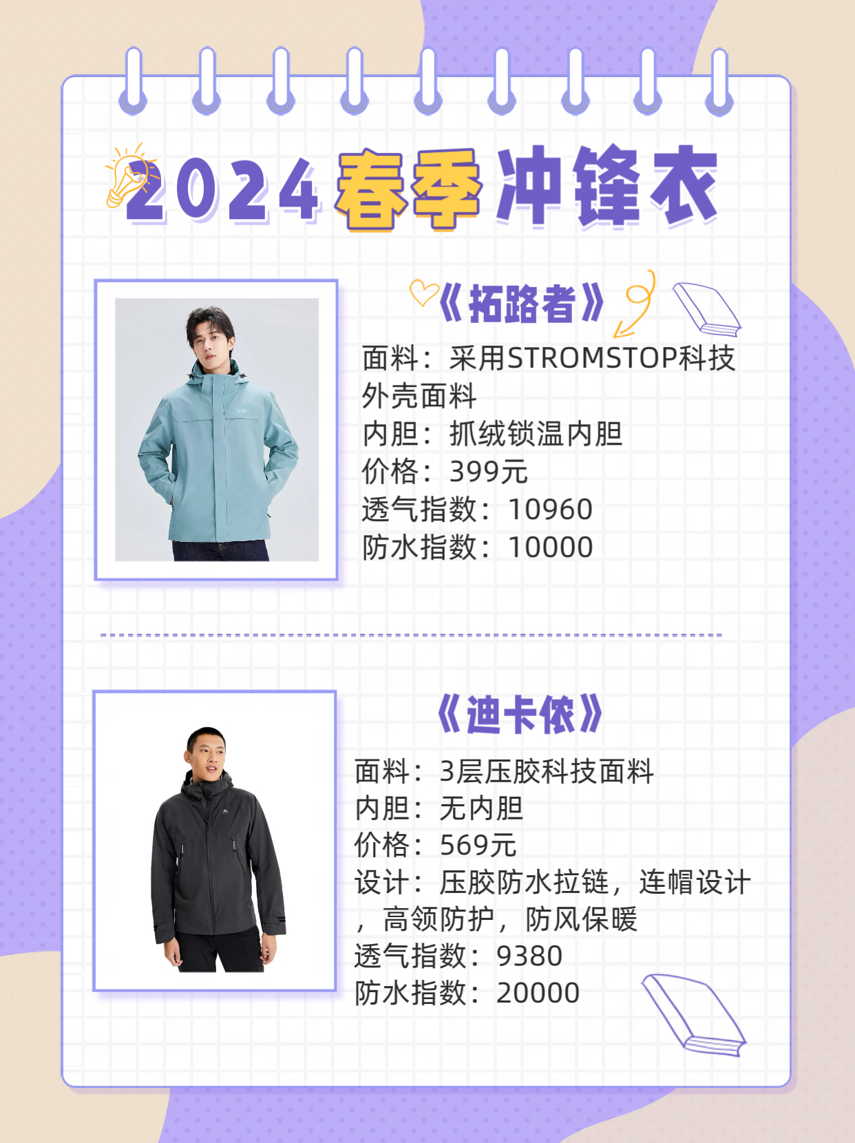 随着2024年春季的到来,冲锋衣市场又迎来了一波新品。以下是六款热门冲锋衣的详细对比,帮助您在购买时做出更明智的选择。 1.拓路者 面料:采用STROMSTOP科技外壳面料 内胆:抓绒锁温内胆 价格:399元 透气指数:10960 防水指数:10000 优势:价格亲民,透气性能良好。 2.迪卡侬 面料:3层压胶科技面料 内胆:无内胆 价格:569元 设计:压胶防水拉链,连帽设计,防风保暖,高领防护...