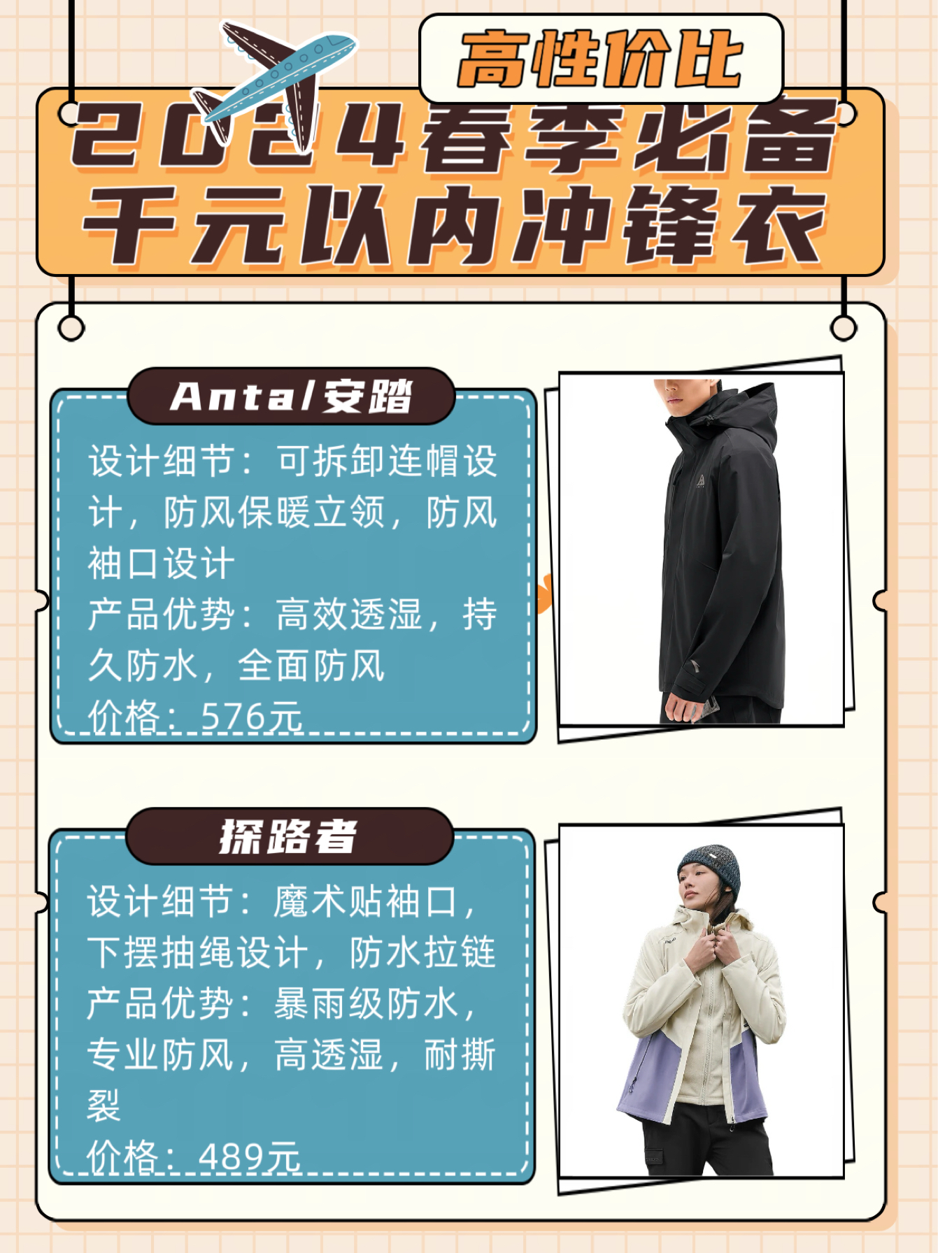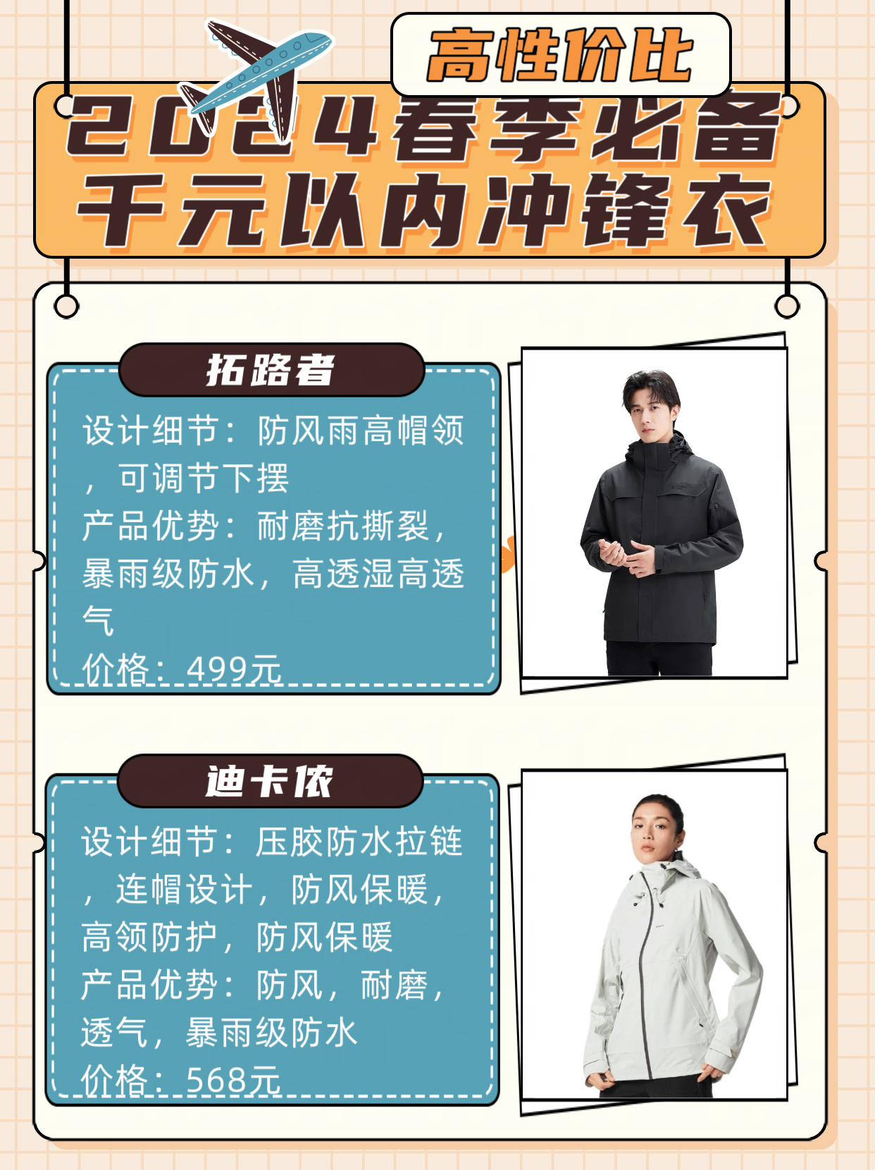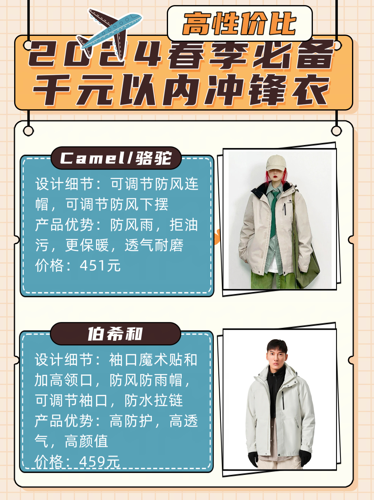 🌸春天来啦,是时候准备一件新的冲锋衣去迎接户外活动的挑战啦!这次我为大家带来了6款2024春季必备、千元以内的超高性价比冲锋衣,快来看看吧!👀 1️⃣ Camel/骆驼 🐫 设计细节:可调节防风连帽,可调节防风下摆,贴心设计,适应各种天气! 产品优势:防风雨、拒油污、更保暖、透气耐磨,让你的春天活动更舒适! 价格:仅需451元!💰 2️⃣ Pelliot/伯希和 🦅 设计细节:袖口魔术贴和加高领...
