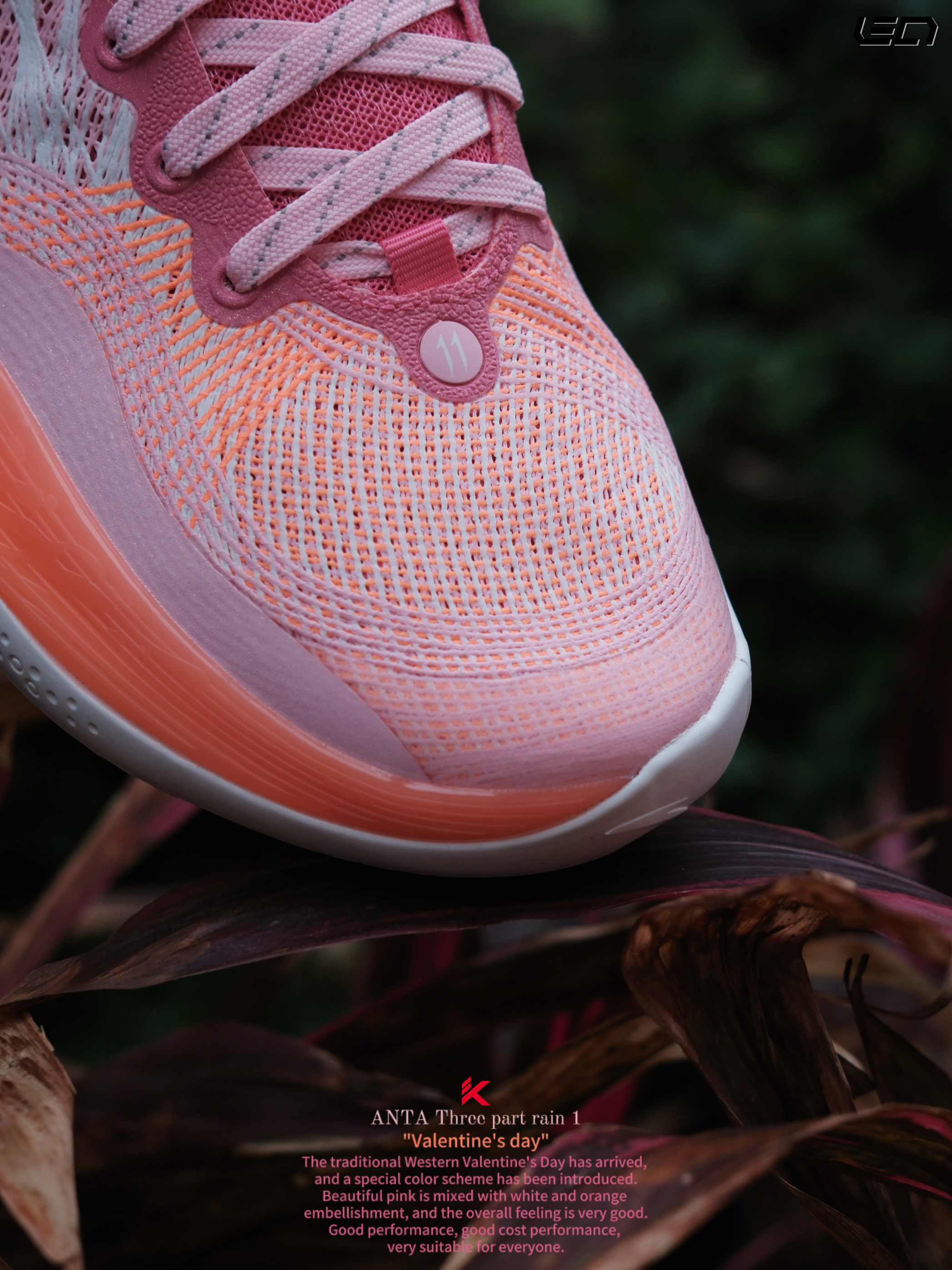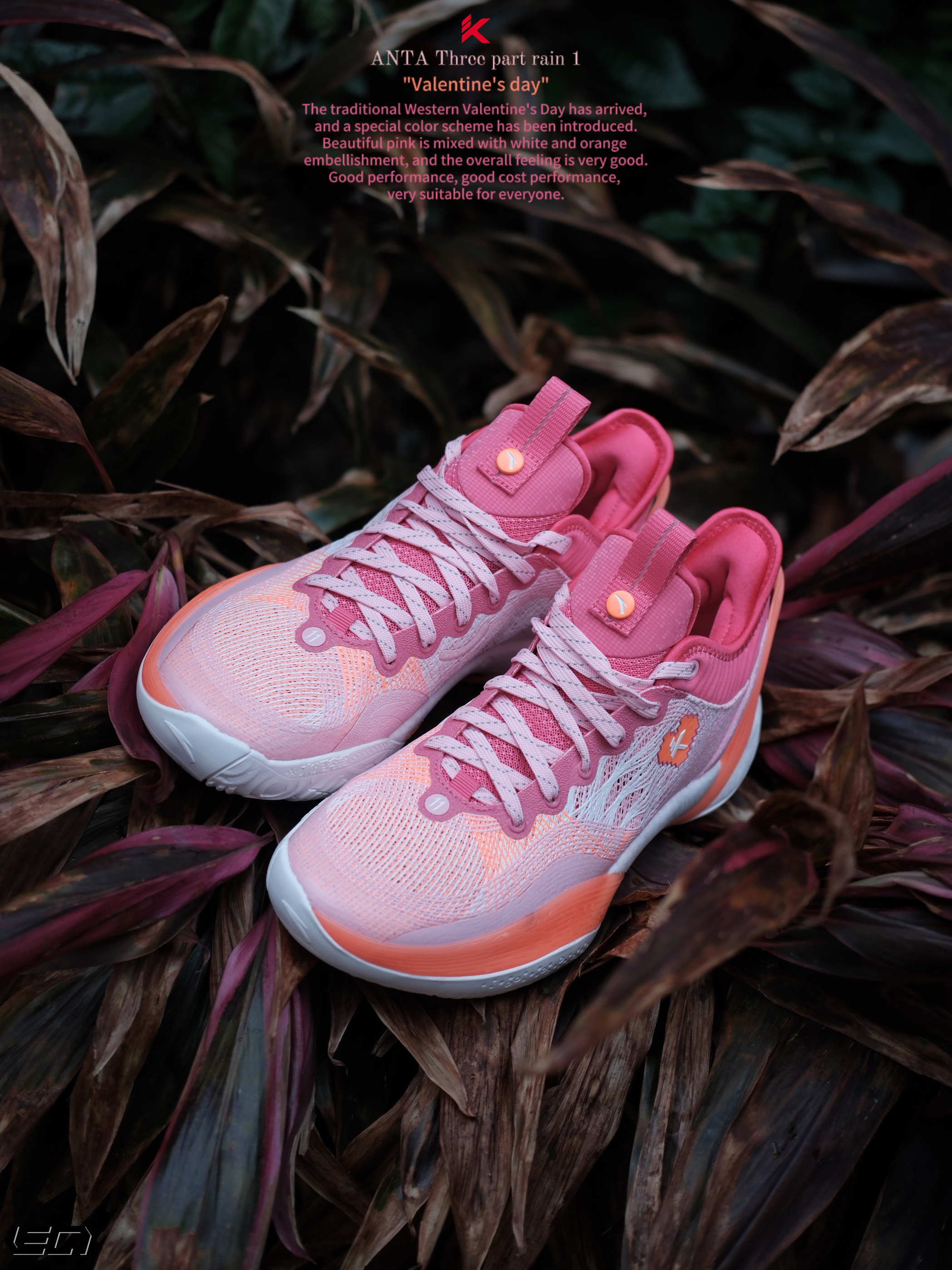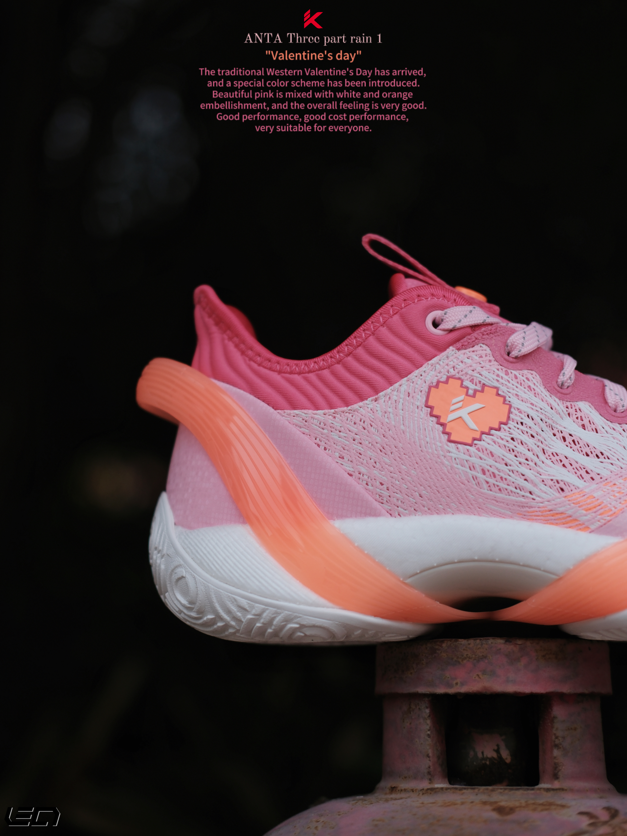 - 只能说这双安踏 三分雨“情人节”配色,真是今年新鞋的标准啦😎好看的高人气配色搭配不错的性能,打球穿是真的挺好看❗ 用了情人节的主题配色粉色搭配了橙色及白色点缀细节,斜侧的“三分雨Logo”也做了情人节的特殊爱心❤️设计,很有意思。 而且这次也做了女款GS码,女孩子也可以穿起来了😎 -