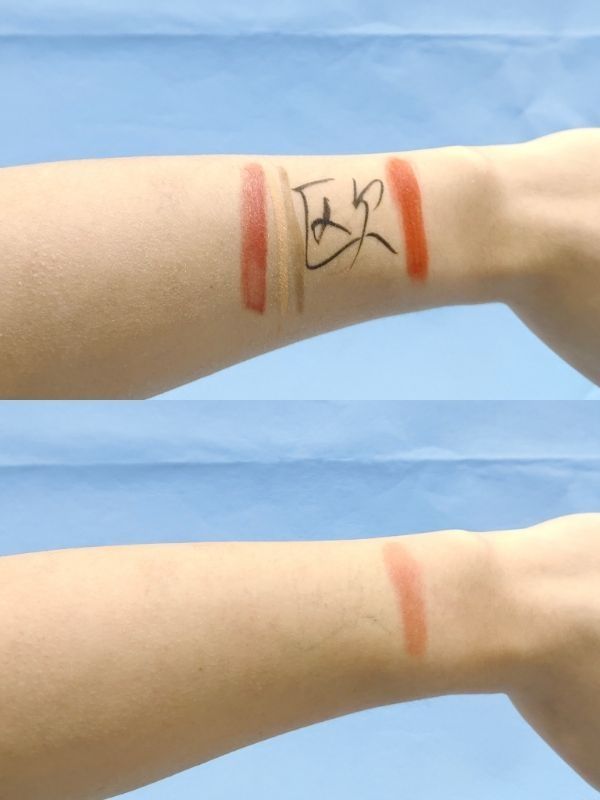 💫彩妆清洁:再看彩妆清洗测试,在手上涂上口红眉笔眼线等彩妆,洗面奶搓出泡沫揉搓清洗彩妆,最后用清水冲洗干净,可以看到清洁力中等偏上,只有少量口红残留。