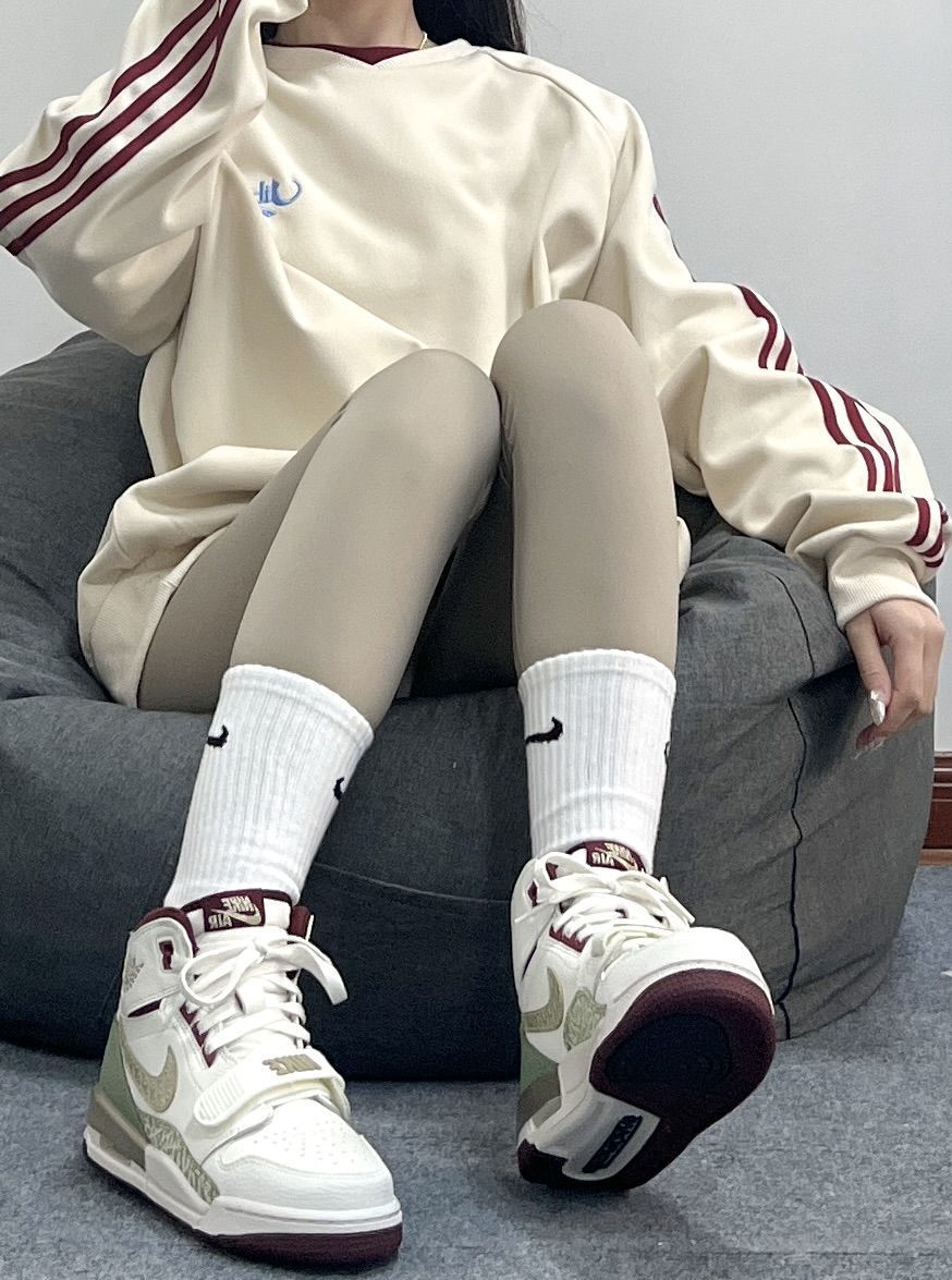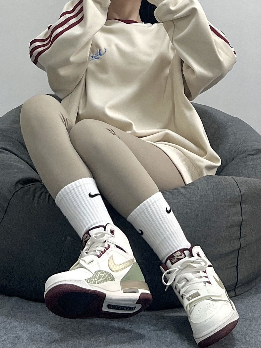 这一套低饱和穿搭 也太适合穿AJ312龙年限定啦! 高帮的鞋型依旧也好显腿长~ 白青色的配色搭配尊嘟好好看 卫衣➕瑜伽裤➕AJ312简直了!!!
