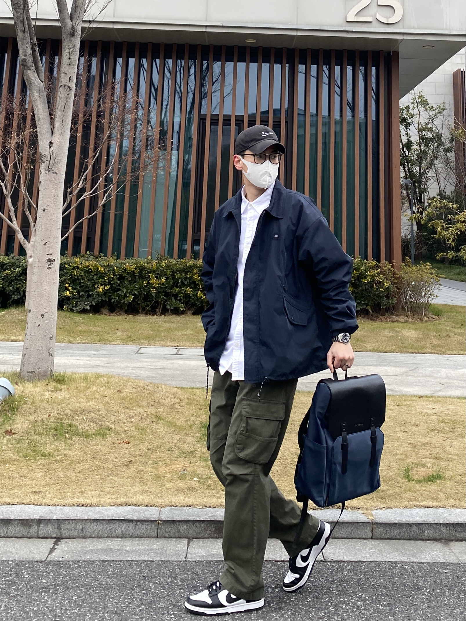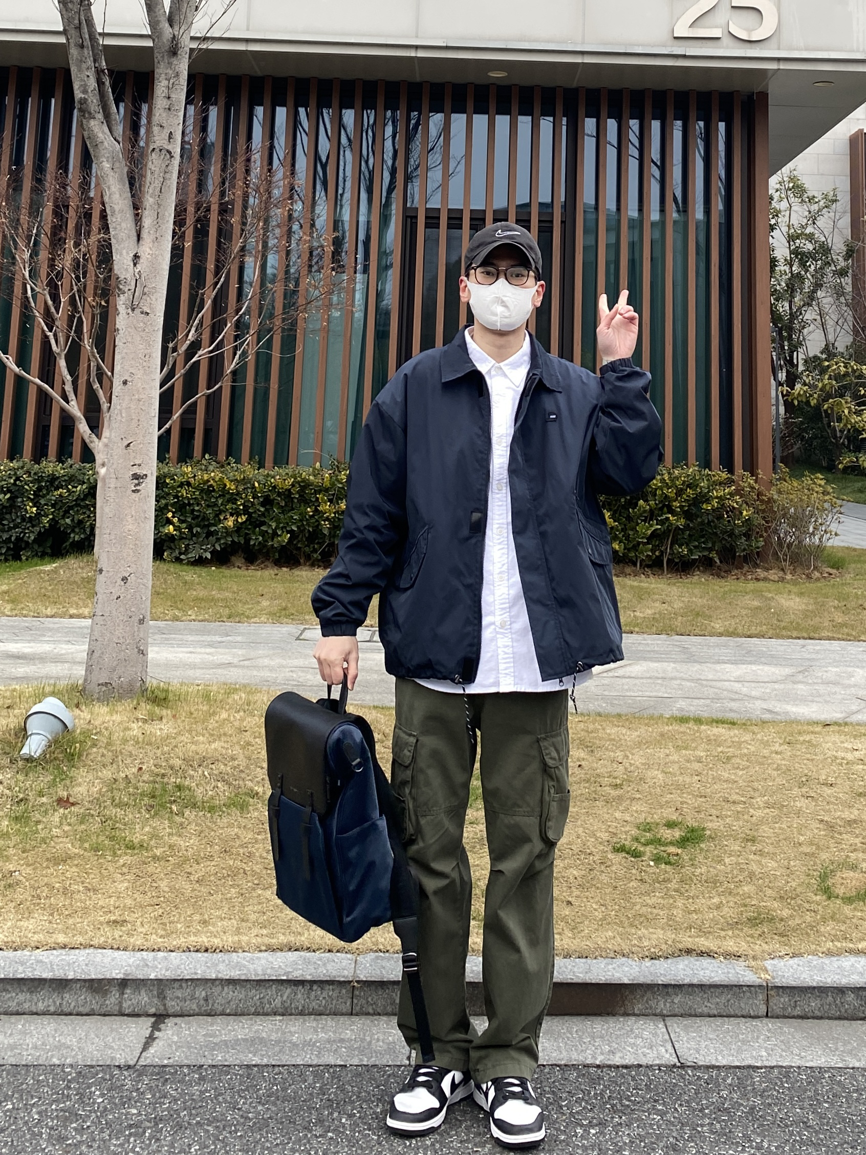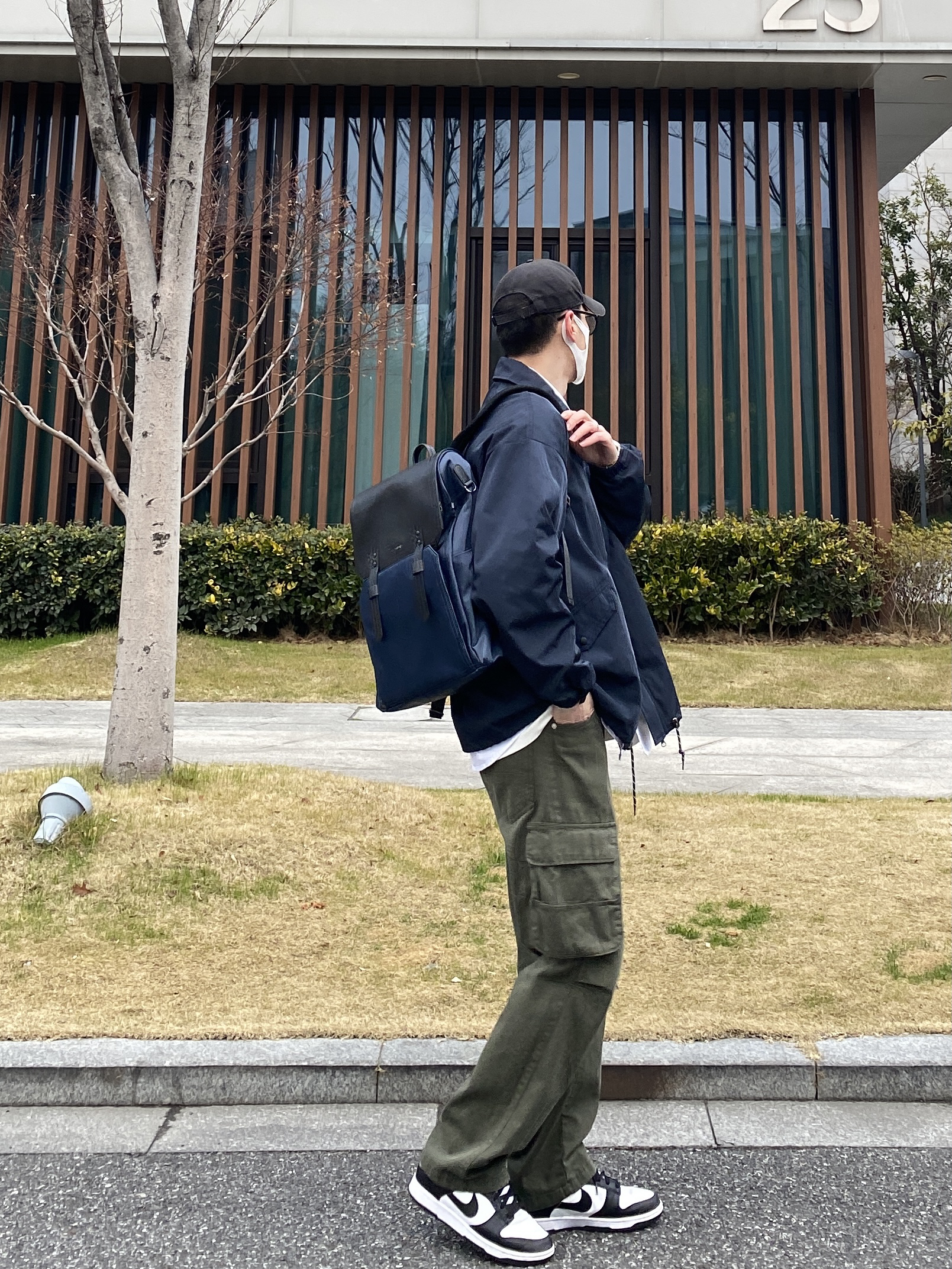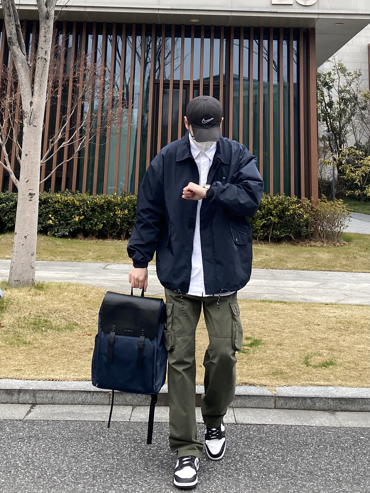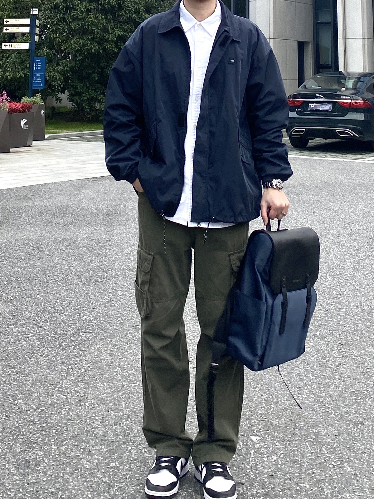 今天这套先用少年感十足的纯白色口袋衬衫做内搭 - 裤子选择不挑腿型的军绿色直筒做旧多口袋工装裤 - 鞋子上脚简约百搭的黑白熊猫dunk - 接着套上藏青色宽松阔版轻机能教练夹克 - 最后背上高级感十足的拼色翻盖双肩包 - OK!出门看看搭配效果吧🙋♂️ - 今日穿搭 衣服裤子:NICE LILI 鞋子:NIKE DUNK黑白 背包:SAMSONITE新秀丽