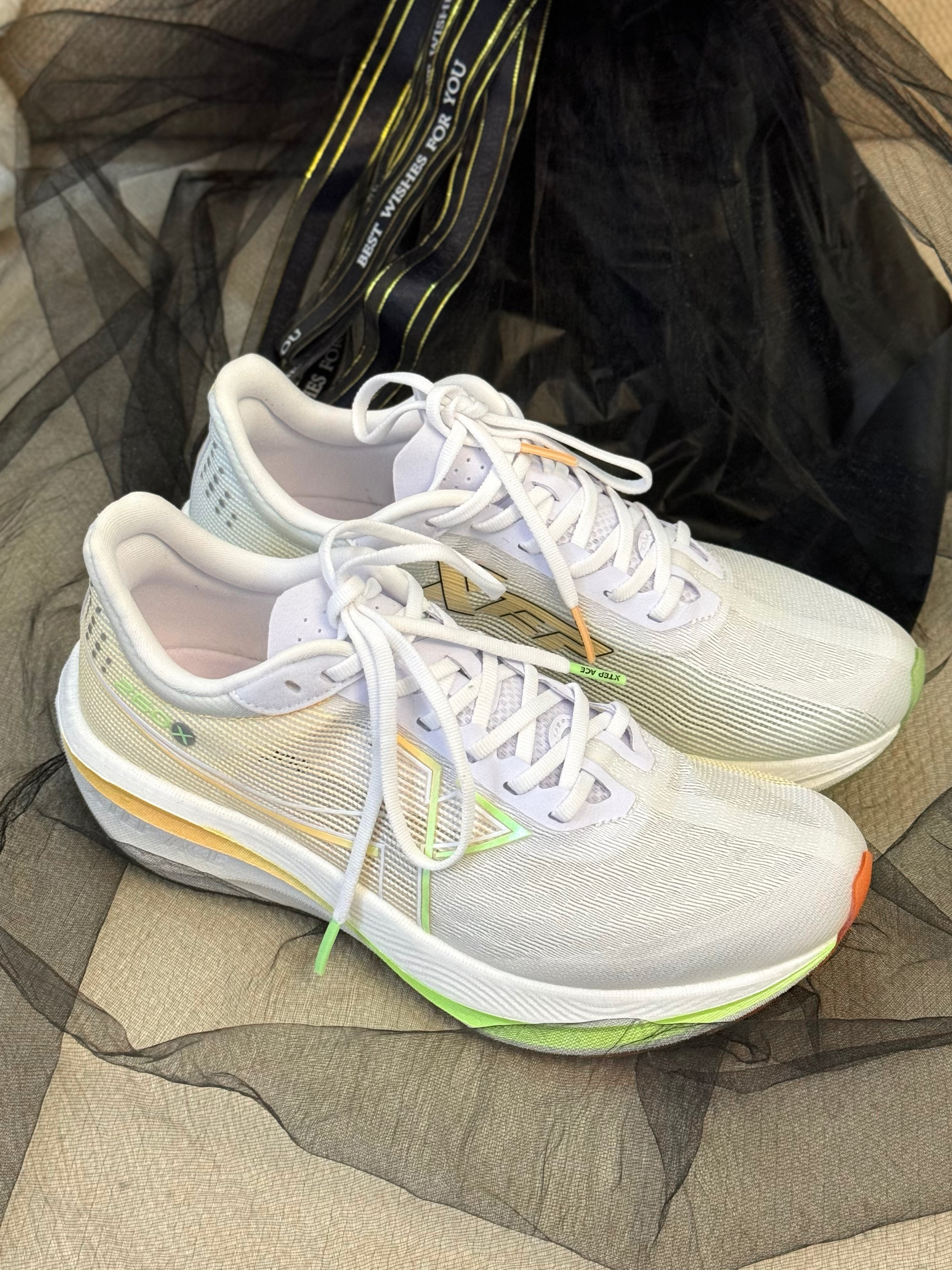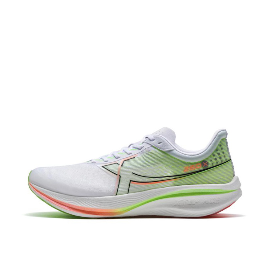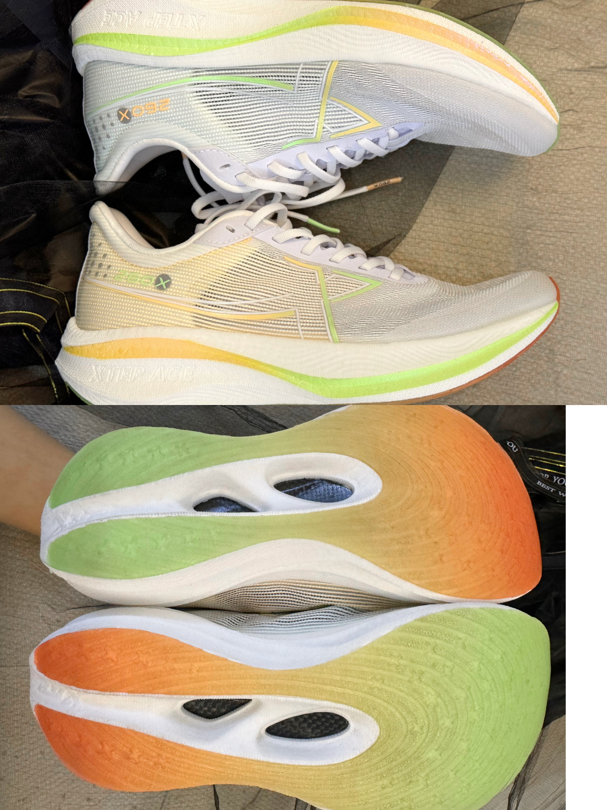 最近对跑步兴致特别大 准备好挑战马拉松了 那当然要挑选一双专业的跑鞋了 穿上特步 260X 碳板竞速跑鞋,轻装上阵,先来跑一跑体验一下 这双跑鞋颜值超高,配色很赞,白色为主调 橙绿为辅,左右脚又做了鸳鸯色设计。 网纱透气鞋面不闷脚 主打轻量化设计,跑起来很轻盈, 无论是日常跑步还是马拉松挑战都是个不错的选择~