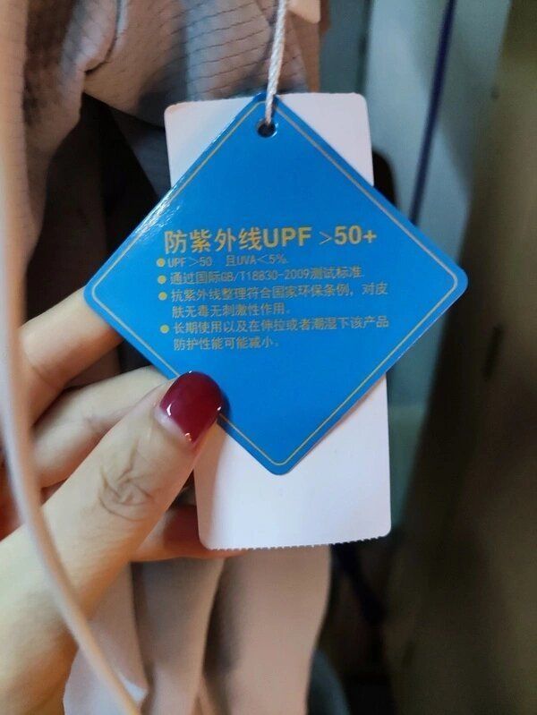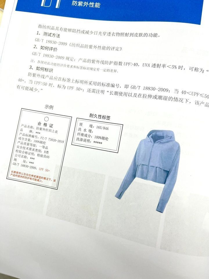 这是最直观简单有效的方法,建议优先选择吊牌上标注了国家标准GB/T 18830 《纺织品 防紫外线性能的评定》或者行业标准FZ/T 74007《户外防晒皮肤衣》的防晒服,执行了上述标准的防晒衣,防晒性能是有保障的。