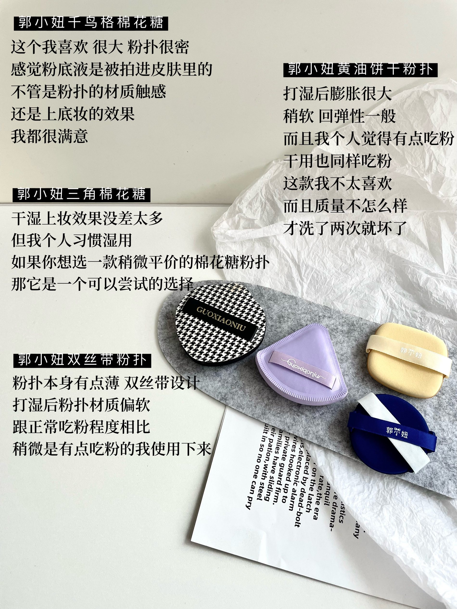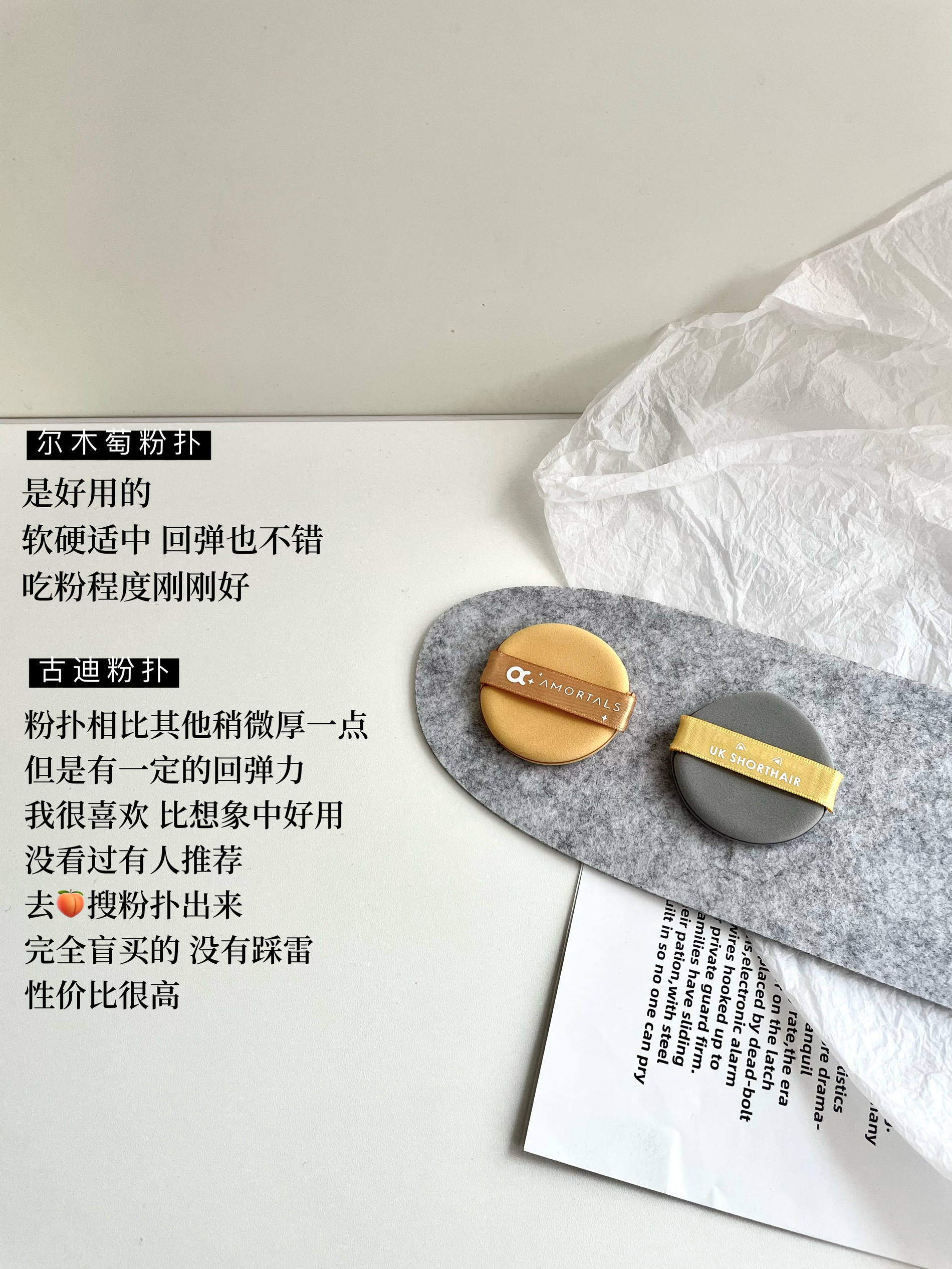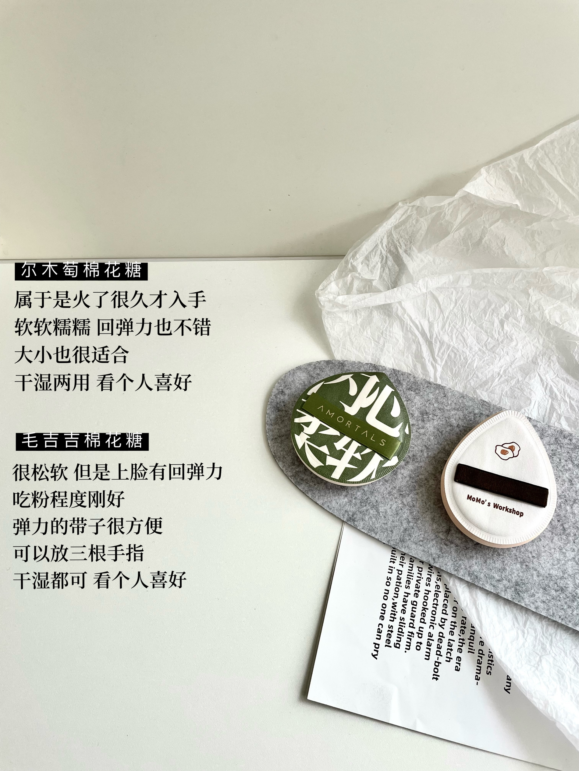 本篇笔记关联了AMORTALS/尔木萄 100分棉花糖加分气垫粉扑 超软不吃粉干湿两用服帖加厚 【XL】超大号、毛吉吉 棉花糖芝士空气粉扑 咖色水滴+白色水滴、郭小妞 千鸟格松紧带超柔软薄粉扑 粉扑等商品,为用户提供真实的使用体验和购买参考。