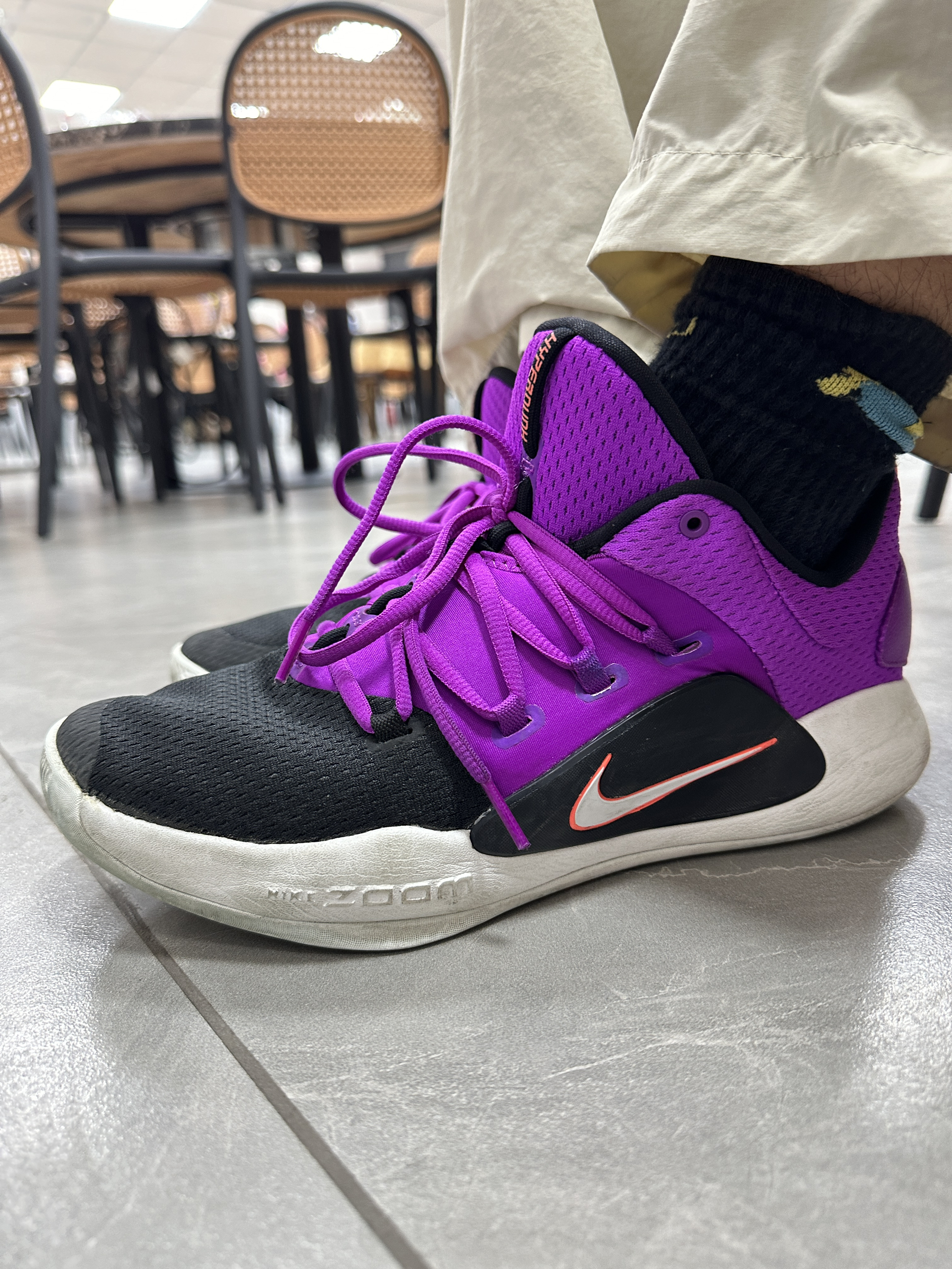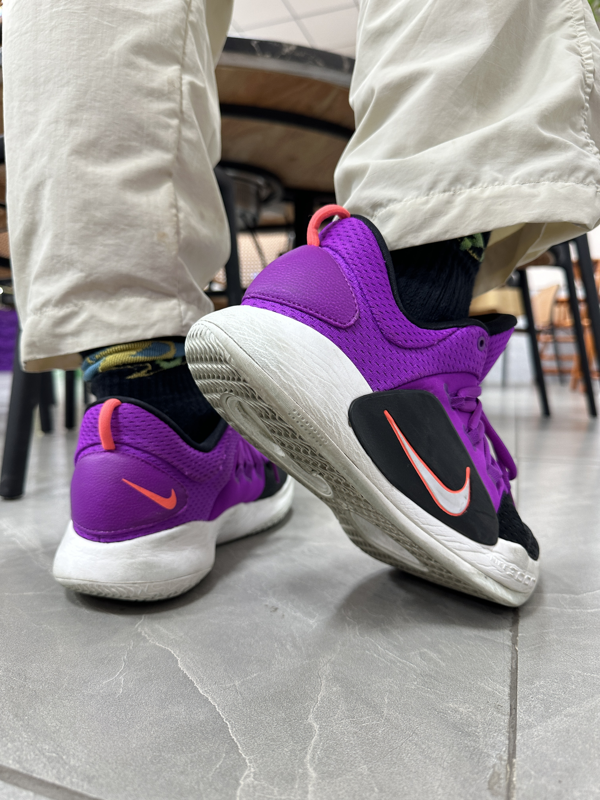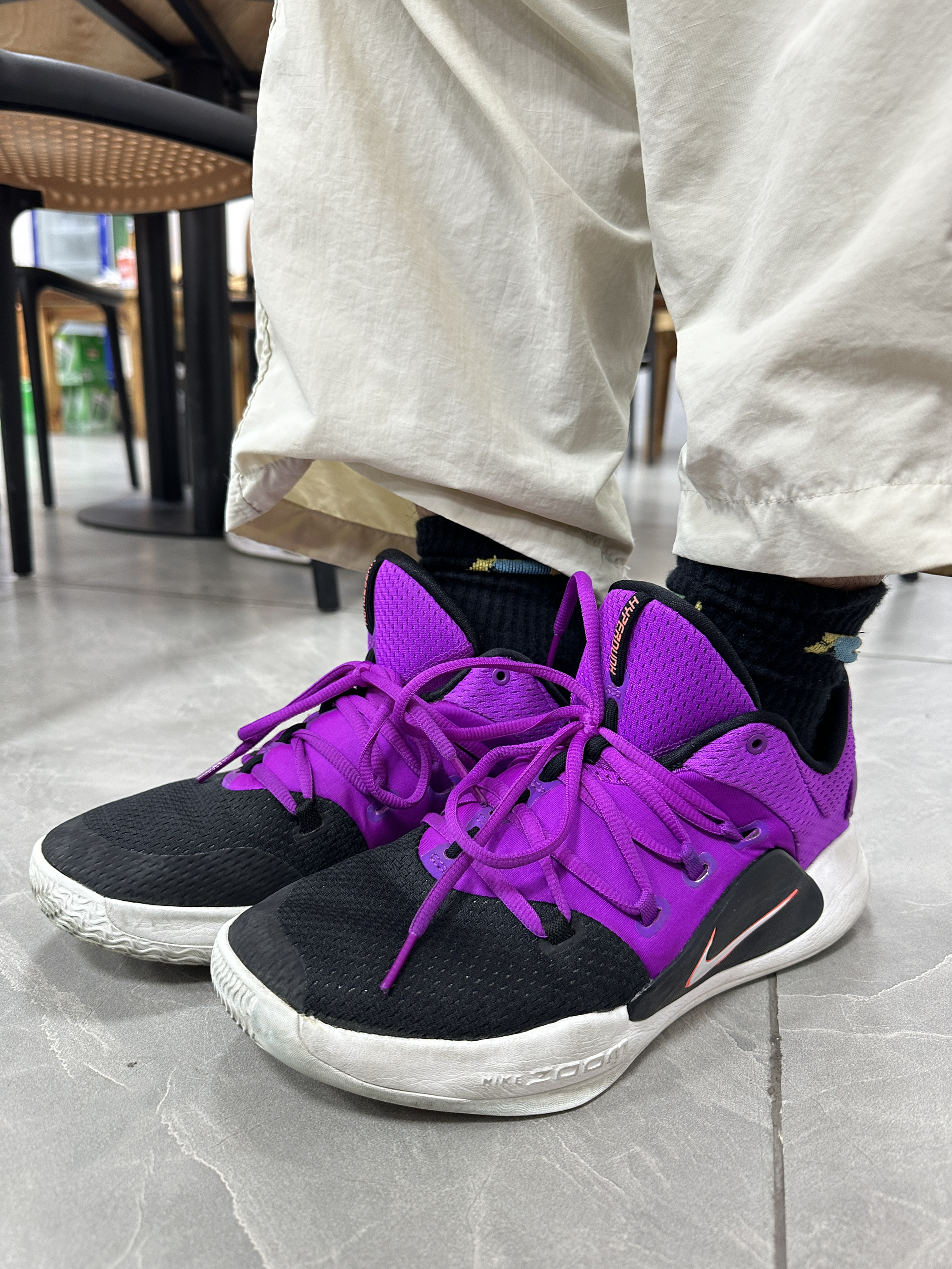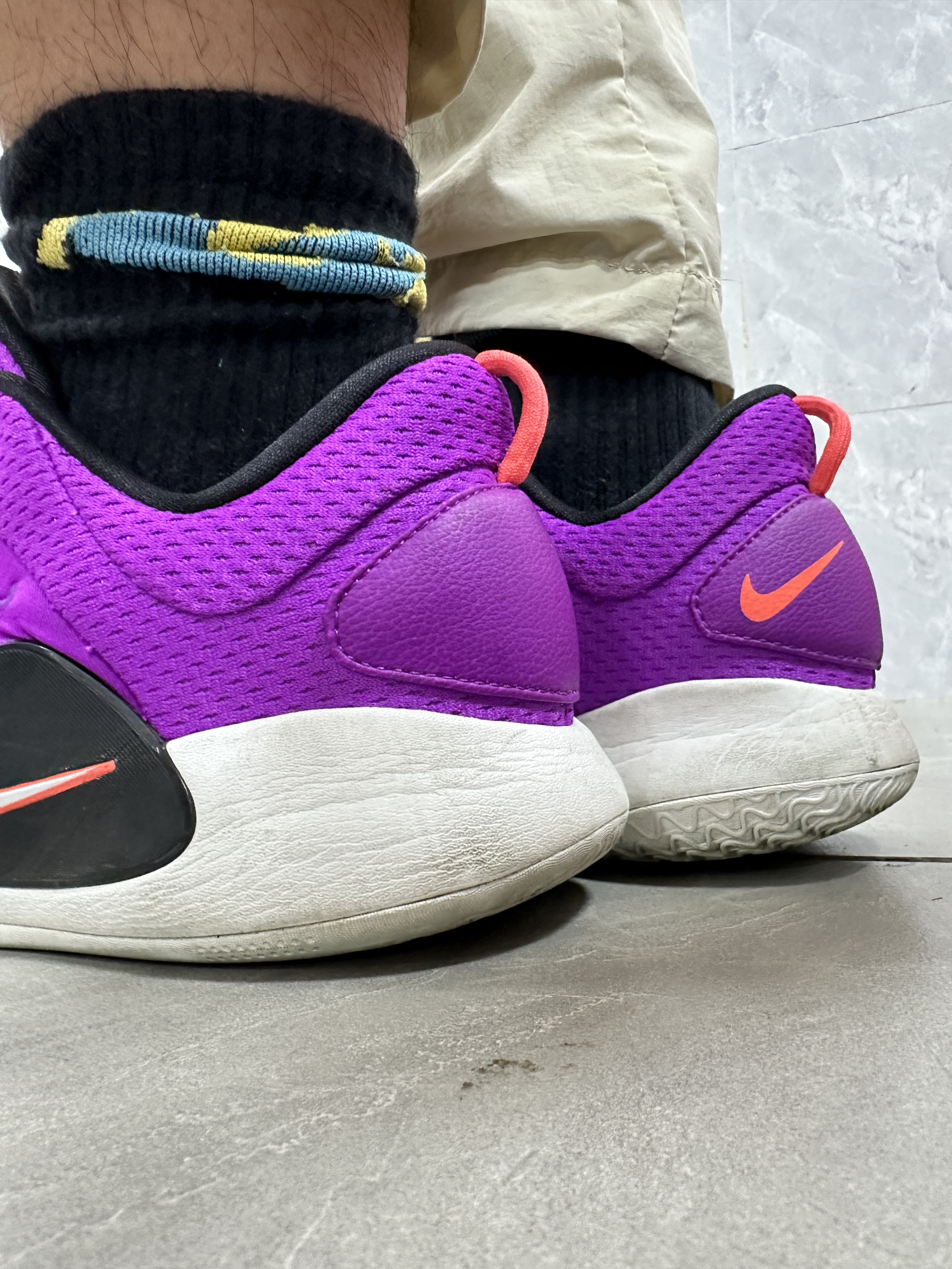 本人鞋码42 身高174 体重60kg 😈版型外饰 HD系列的十年纪念鞋,黑紫的配色有一种自带的高级感!鞋面基本上都是网布设计,鞋面很流畅很、轻盈。鞋侧的耐克大勾子增加了鞋子整体的层次感;鞋后跟往外凸出,这样可以避免内置磨脚后跟 ☁️缓震效果 经过多次实战测试,它在跳投和落地的时候明显能感觉到鞋底的回弹反馈,脚底不会震的太难受;鞋底采用前后分离式Zoom,前掌扇形和后掌马蹄形,这让脚更...