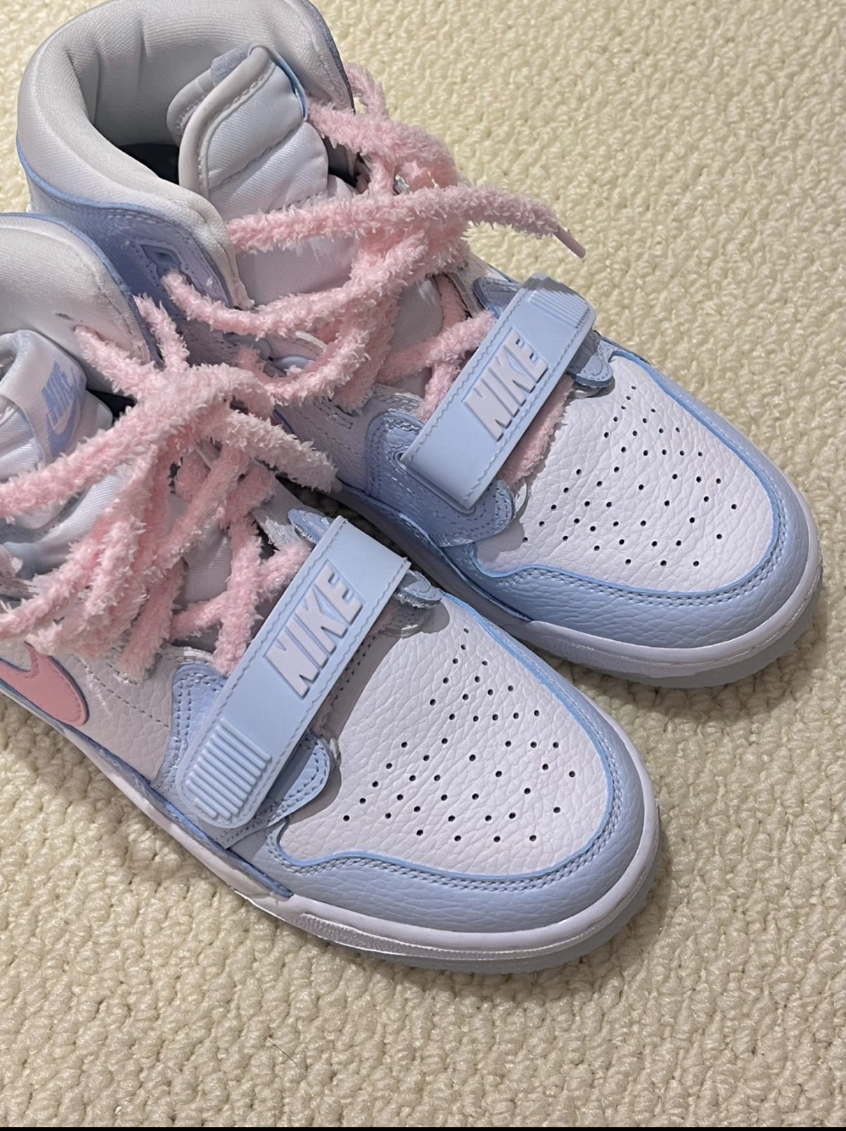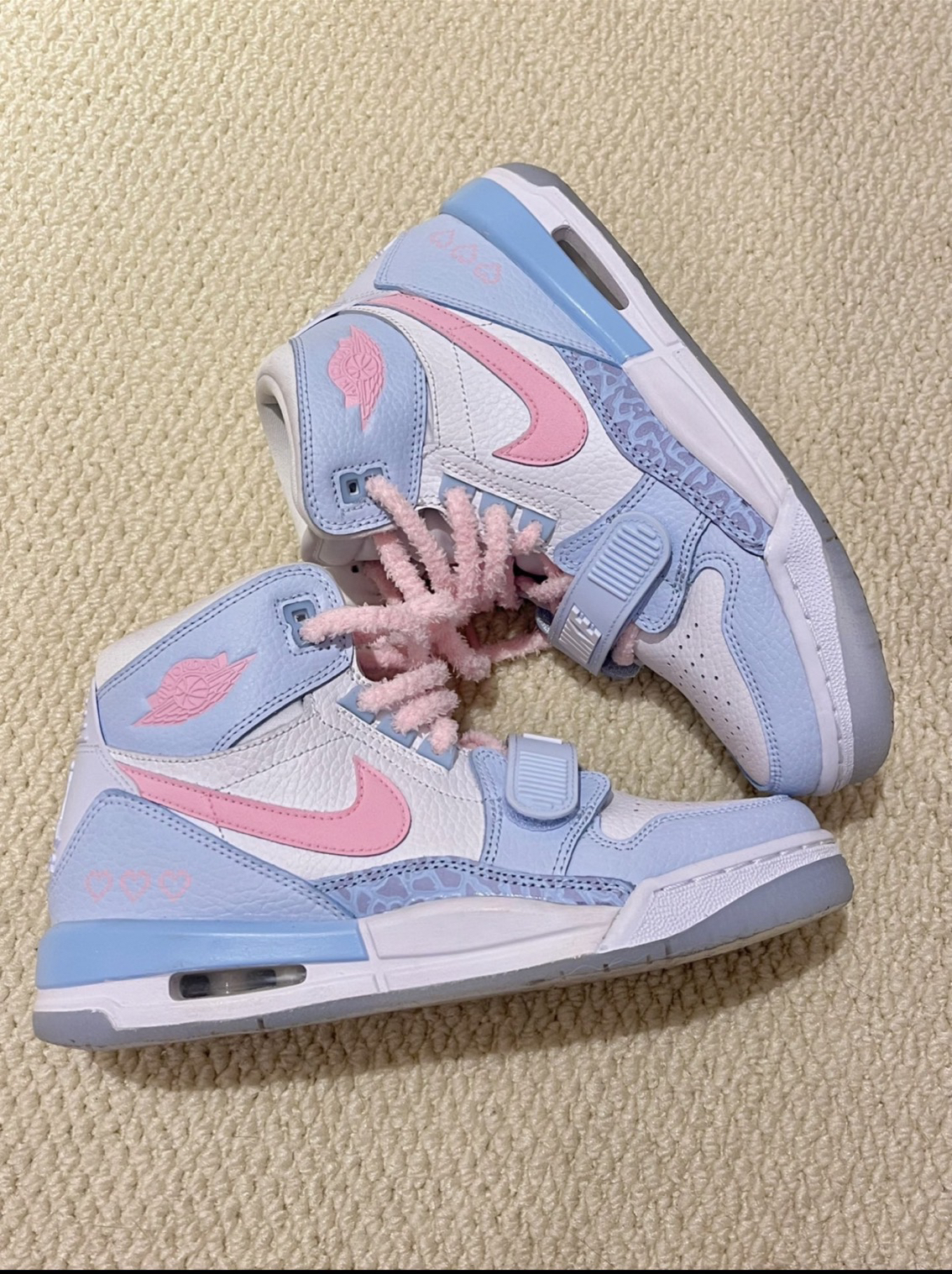 这双球鞋非常有少女感 糖果色系的配色我真的很喜欢这么好看的配色必须是定制款 毛绒绒的鞋带不仅少女感十足还很有秋冬的氛围呢鞋侧像素爱心是我最喜欢的细节处 穿上好看的球鞋出门拍照心情都变得很好呢今天当一回球鞋女孩~
