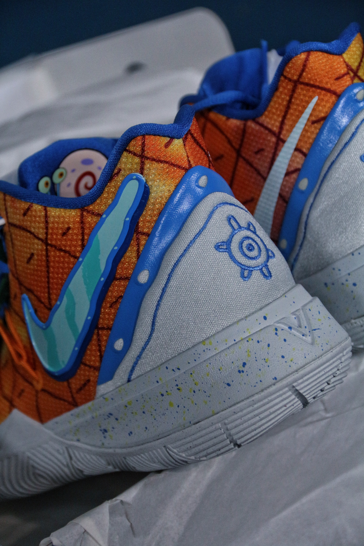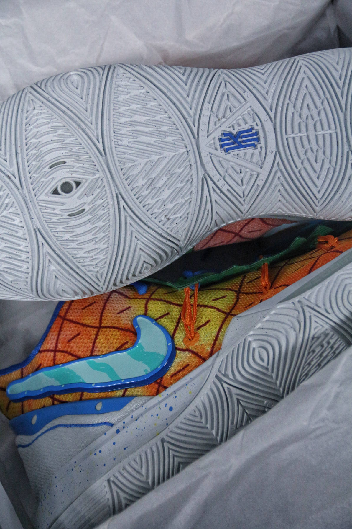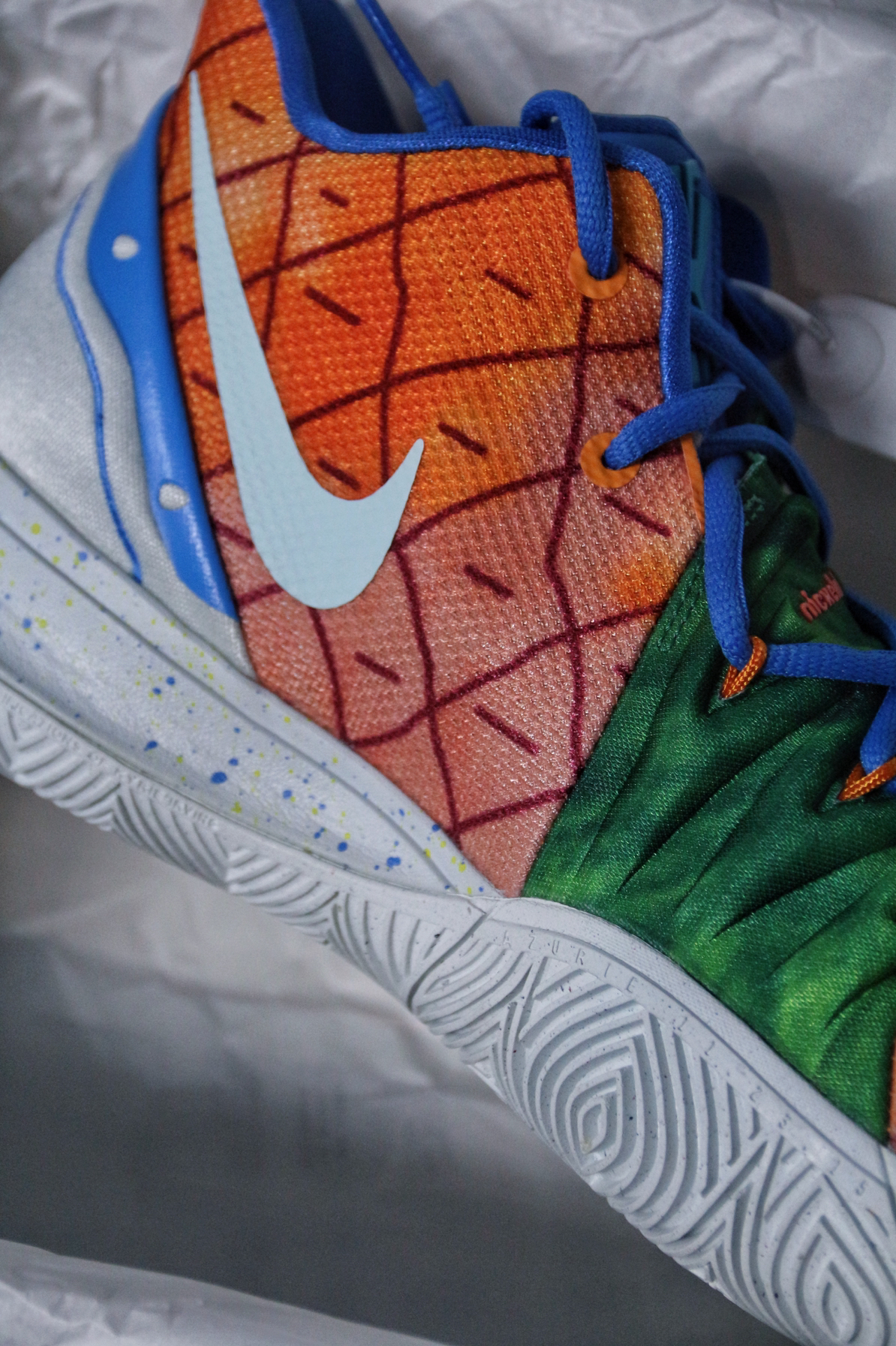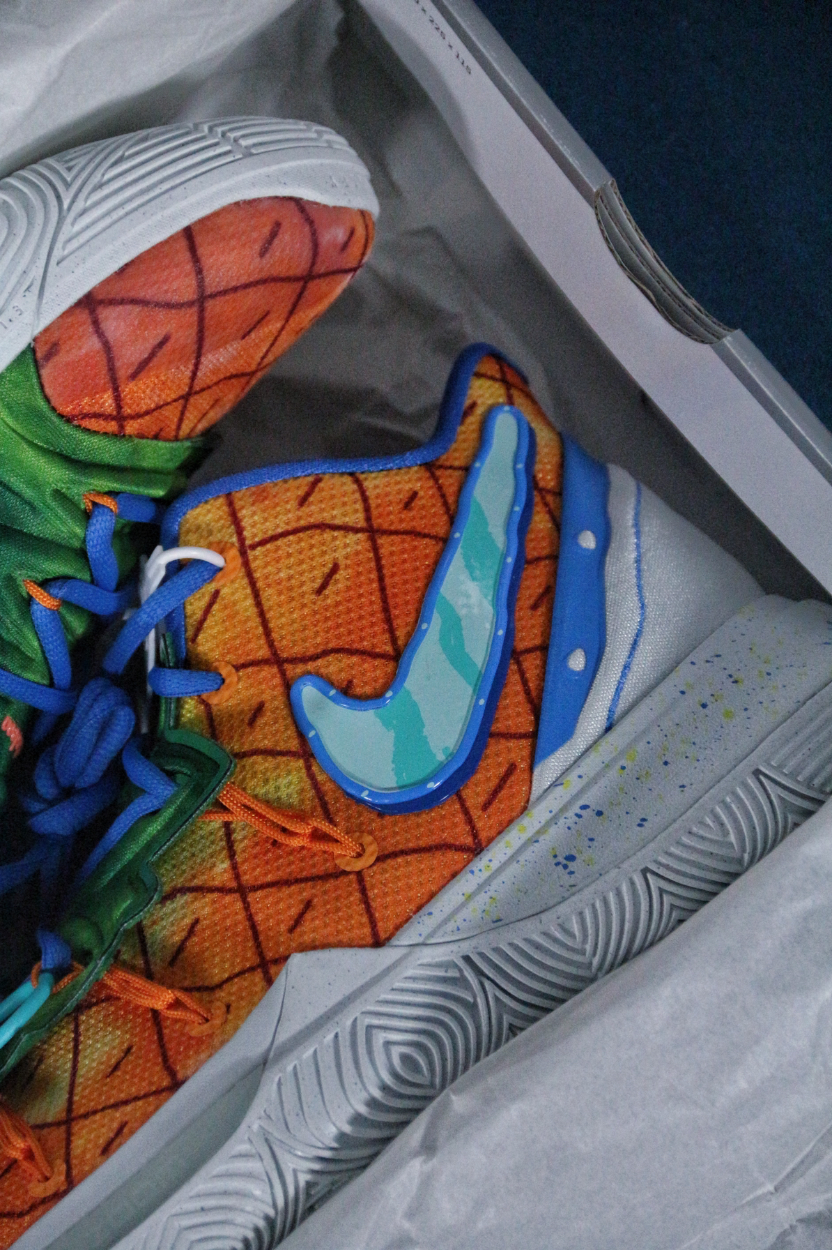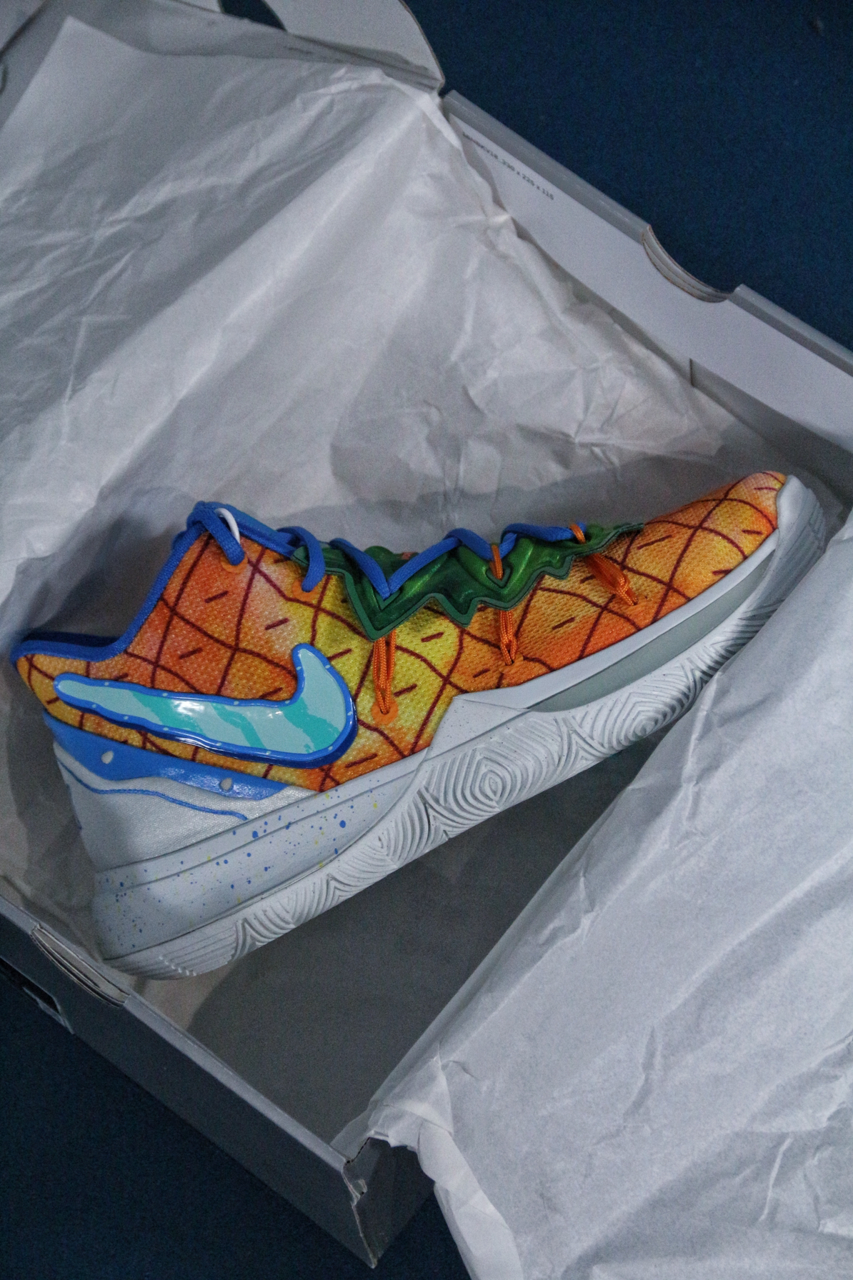 现在依稀记得这双球鞋发售的情况🤔 最低价格应该是到过700左右✅ 当时选择了PG3放弃了这双“菠萝屋”🍍 毕竟在那个阶段购买球鞋,大部分时间只能二选一 所以,这双球鞋就成为了一个遗憾😑 今年当我收齐这个系列欧文5代的其他配色时 拿下“菠萝屋”也势在必行🙋 这双球鞋的灵感来源于动画片海绵宝宝中 海绵宝宝的住所🤖 鞋身、鞋舌以及后跟都有细节设计 耐克确实太会做配色了💯 欧文5代中底的抗扭确实存在...