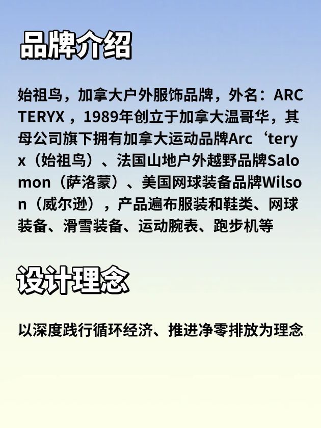 始祖鸟,加拿大户外服饰品牌,外名:ARCTERYX ,1989年创立于加拿大温哥华,其母公司旗下拥有加拿大运动品牌Arc‘teryx(始祖鸟)、法国山地户外越野品牌Salomon(萨洛蒙)、美国网球装备品牌Wilson(威尔逊),产品遍布服装和鞋类、网球装备、滑雪装备、运动腕表、跑步机等。