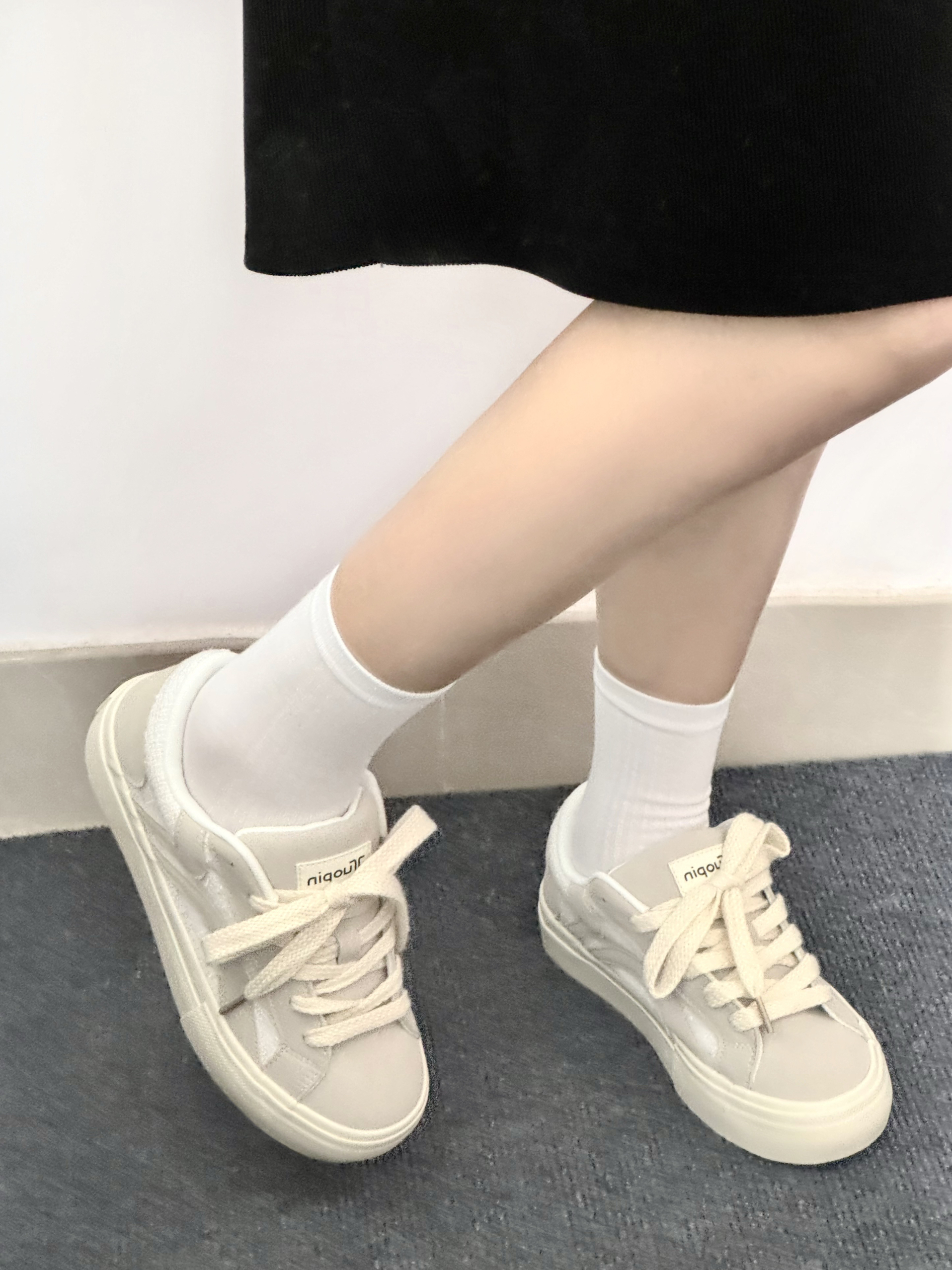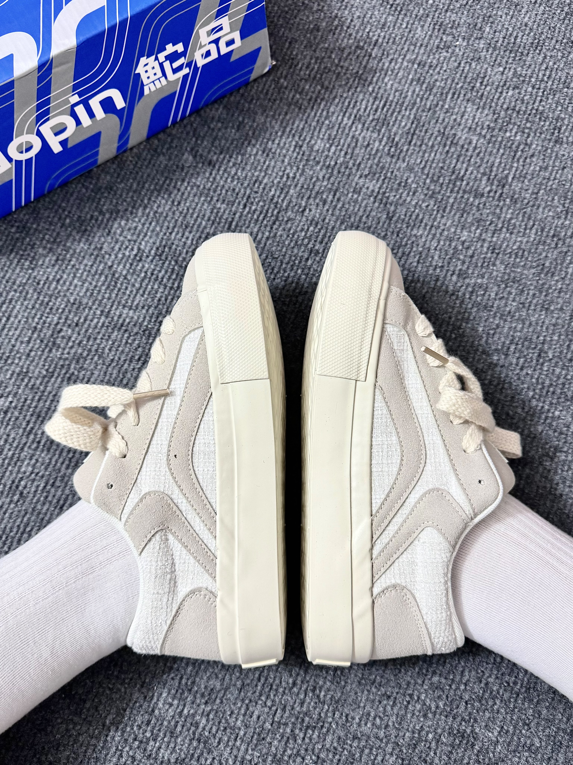 设计师快出来!板鞋也有小香风了? 白灰配色的鞋子真的看不腻 侧面的小香风拼接设计越看越喜欢呢 上jio还显小 而且软fufu~ 新学期就穿它上学去噜~