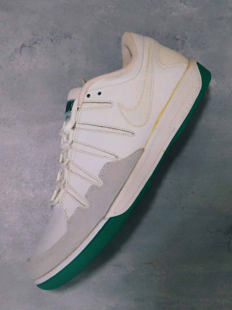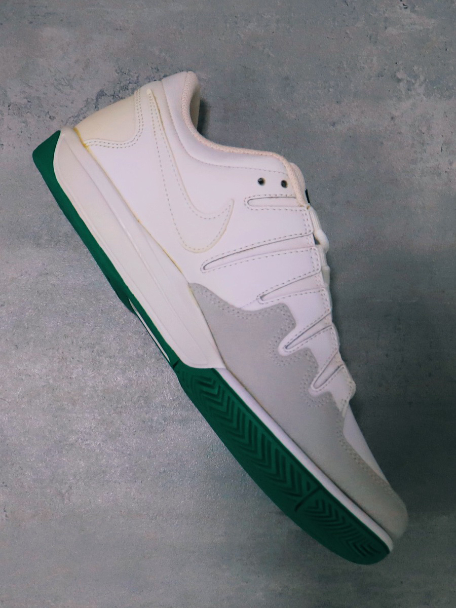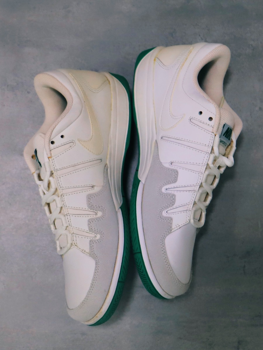 这双老鞋不知道还有人记得吗👀费德勒——耐克签名系列的网球鞋🤍 白灰配色我个人认为是这中最好看的色调啦‼ 鞋身很有做旧的风格感,鞋底更是做的墨绿色底,跟鞋身形成了很好的撞色!不得不说这个绿色真的是加的恰到好处啊! 同时也更有复古的感觉🍃 鞋身的脚感特别的轻盈~打球的时候感觉很舒适!! 而且整体包裹性很不错~咱就是说真的太会挖宝了我👀 鞋带的设计也是简简单单很耐看~ 尺码我是正码上脚的!很合适