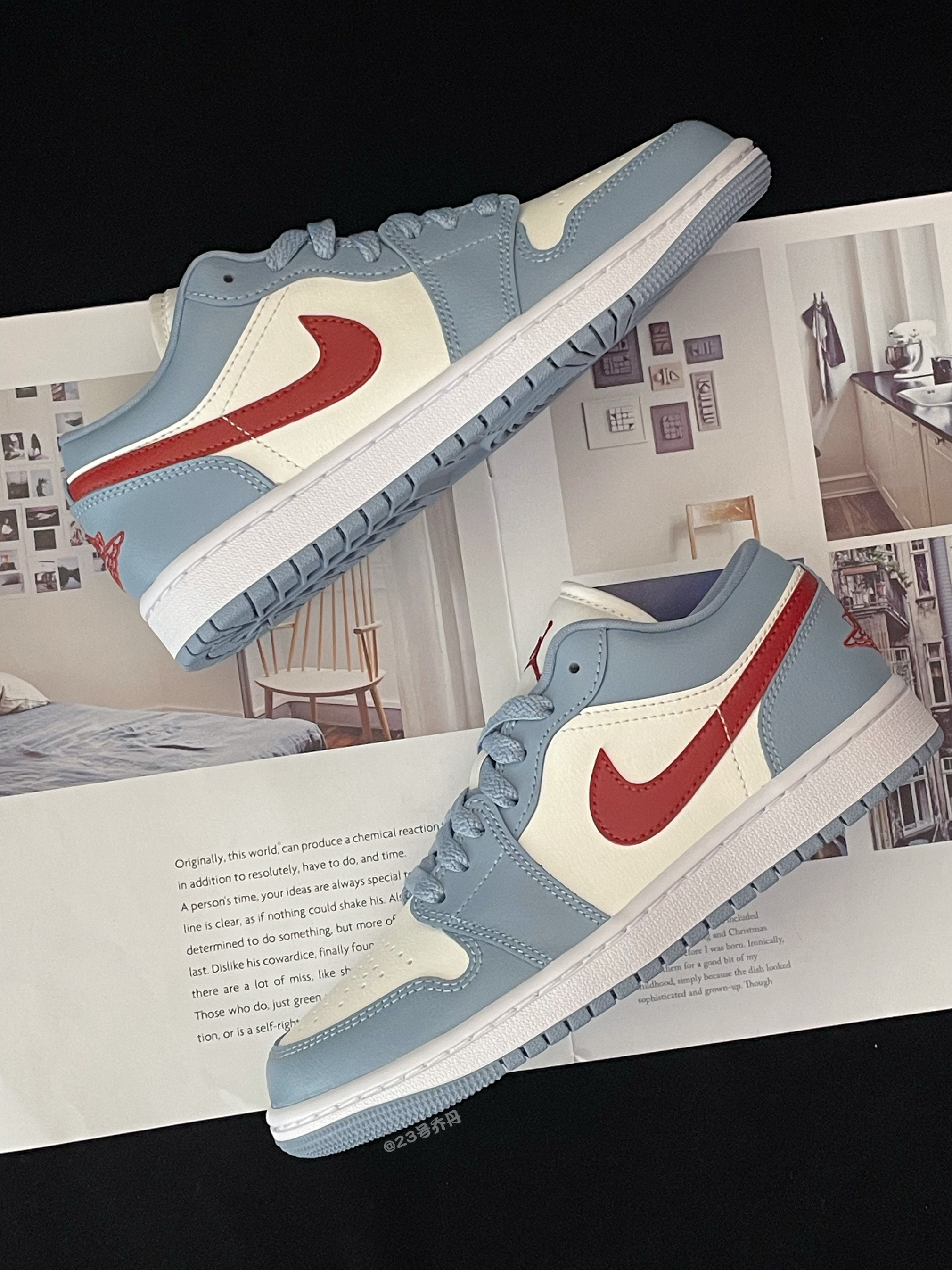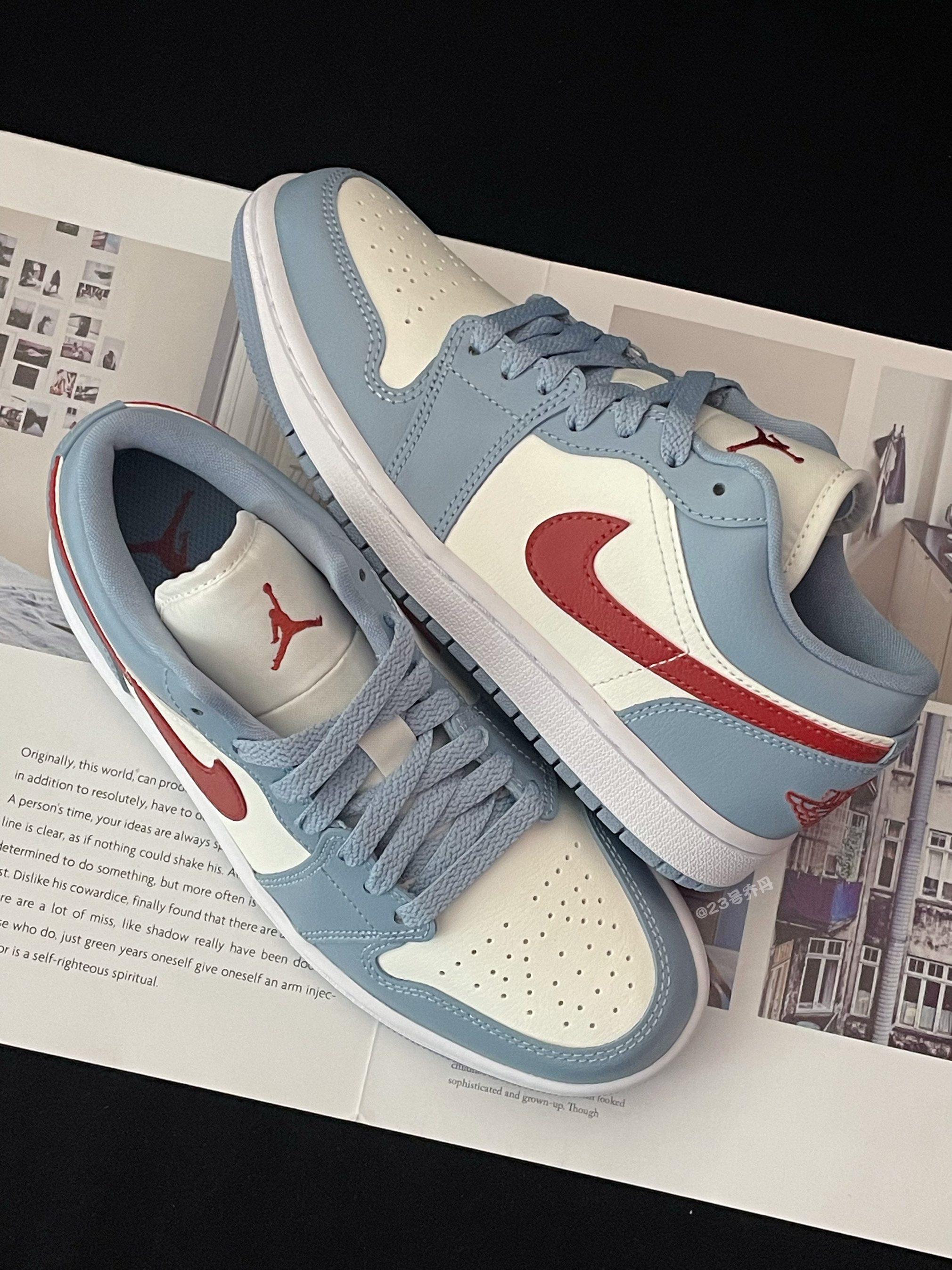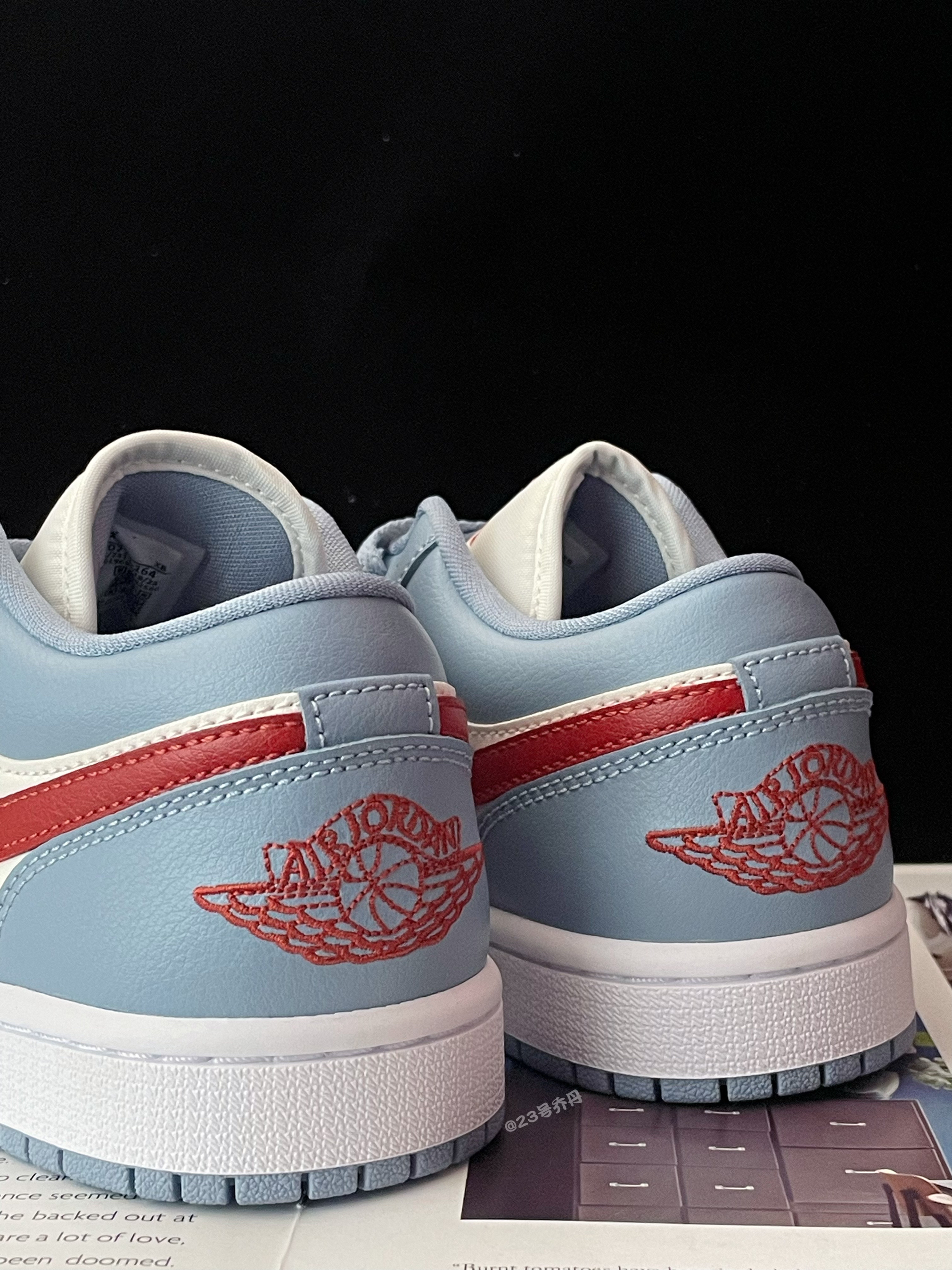 今天给大家分享这双近期发售的 Nike Air Jordan 1 Low『白蓝红』板鞋👟 整双鞋采用了白色/雾霾蓝/红色等搭配 鞋面选用了易于打理的光面皮革材质 鞋头密集的透气孔保证了良好的透气性 鞋舌/鞋尾均设计有品牌Logo刺绣图案 白色中底一定的增高效果可修饰腿型 最后由雾霾蓝多纹路的橡胶大底收尾 整体来说这是一双颜值挺不错的小板鞋👟 配色清爽而有活力 适合日常休闲或通勤搭配 ⚠️尺码方面建...
