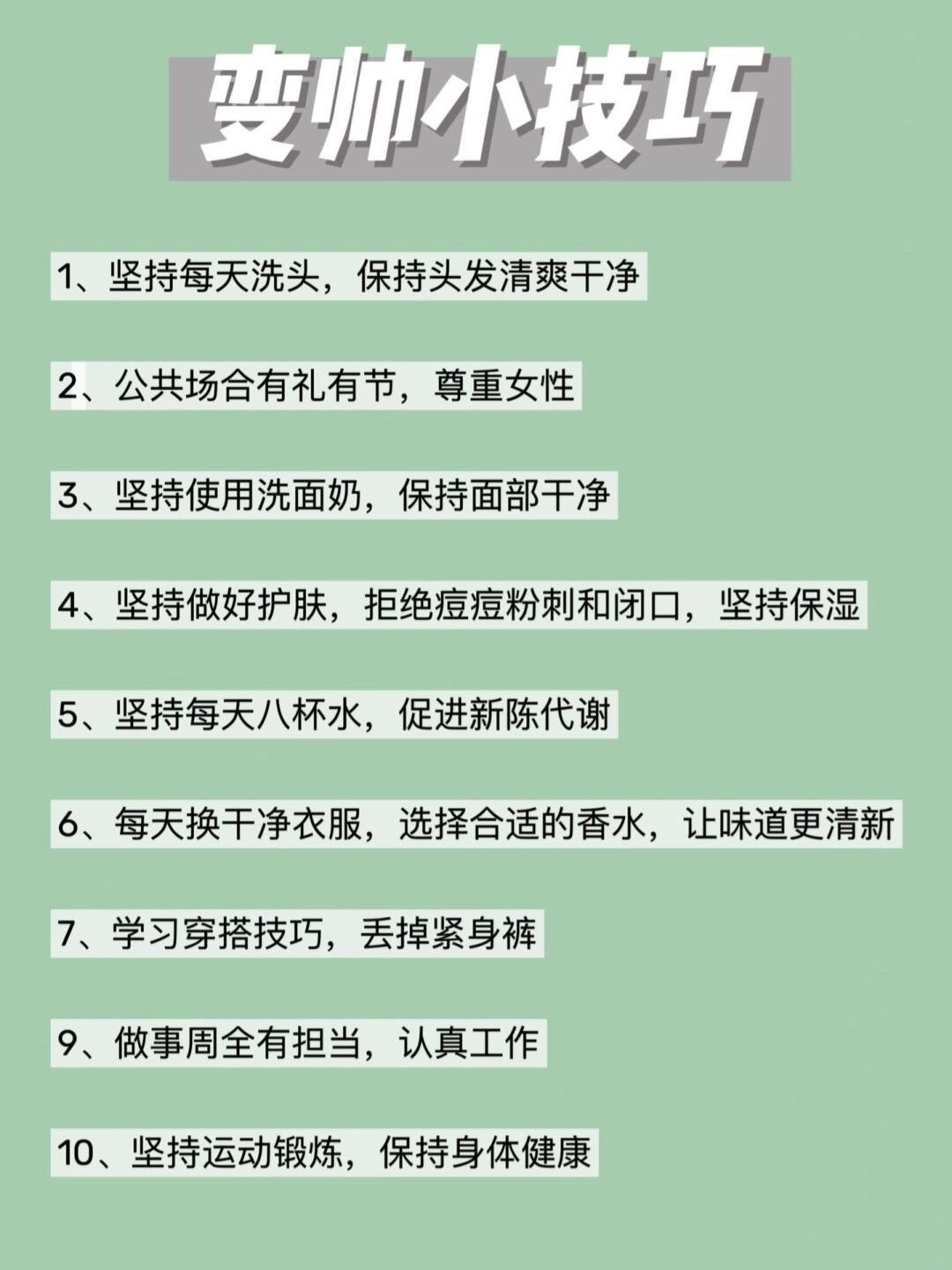 清爽干净是变帅的前提! 学会穿搭是变帅的基础! 学会护肤是变帅的进阶! 有礼有节是变帅的表现! 赶紧学起来一起变帅吧!