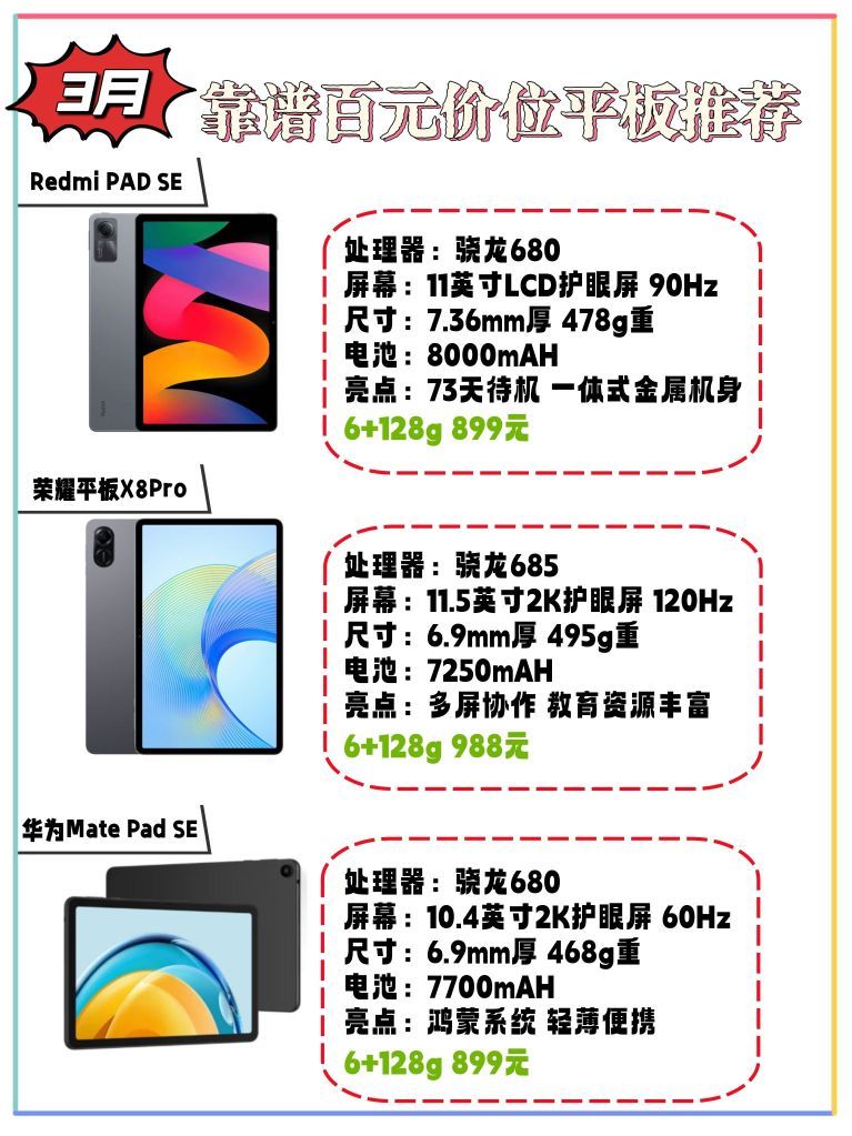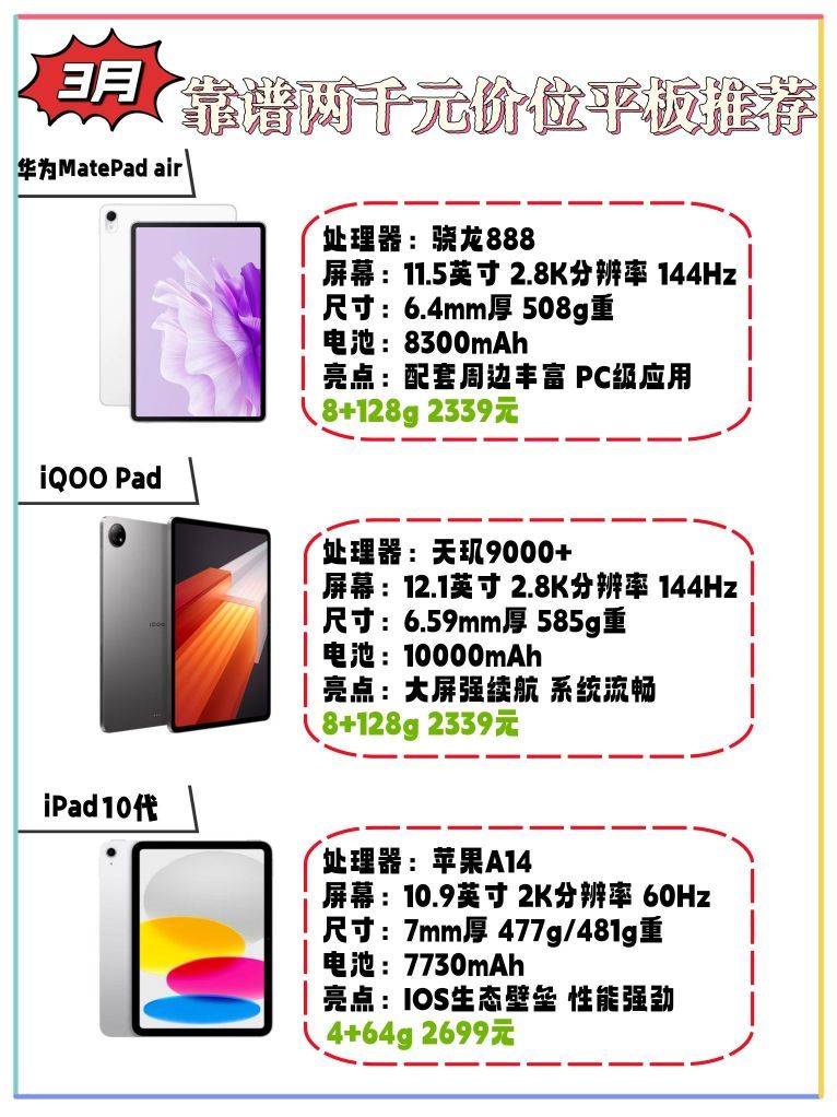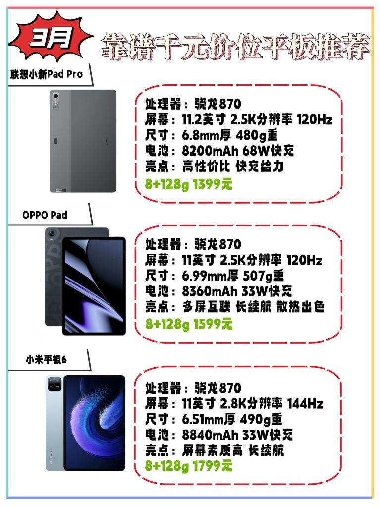 “买前生产力,买后爱奇艺。”这句调侃相信大家都听过,但我在推荐各个价位的平板电脑之前还是想问大家:你真的需要一台平板电脑吗? 跟买手机截然相反,买平板前应当先了解自己的需求再决定买什么价位的产品。 1、看视频上网课,可以只买千元以内的平板,优先考虑屏幕素质好的就行。 2、商务办公需要多屏协同,可以选择两千元以内的平板,优先考虑和自己手机、电脑同品牌的平板。 3、重度游戏需求,可以选择三千元左右...