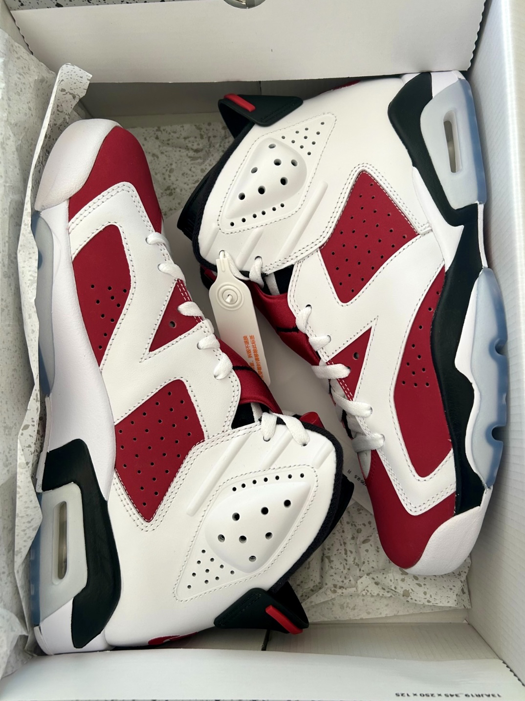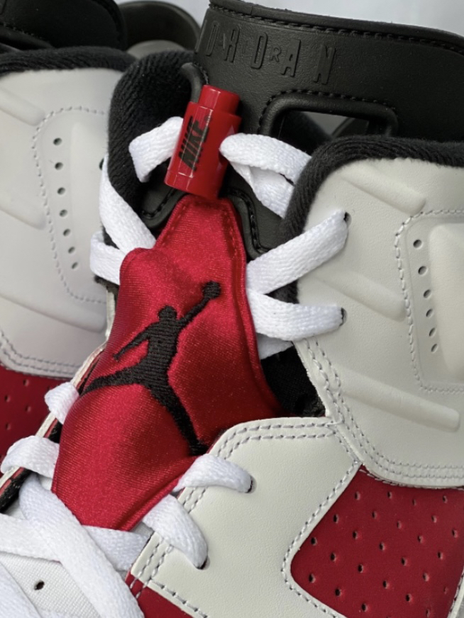 这双Air Jordan 6 retro "carmine "胭脂也太好看了🥰 经典胭脂红配色,咨淡蓝色水晶底好好看线 🌟鞋带处胭脂色绒布,飞人10go刺绣 🌟鞋带扣抽拉式设计,不用系鞋带 🌟胭脂红部分采用磨砂牛皮革,白色部分采用光面皮革,质感无敌出 🌟后跟Nike 1ogo刺绣,真的巨好看!! 🌟发售价1399,现在炒卖价不算很高 也是老OG配色了,情怀满满