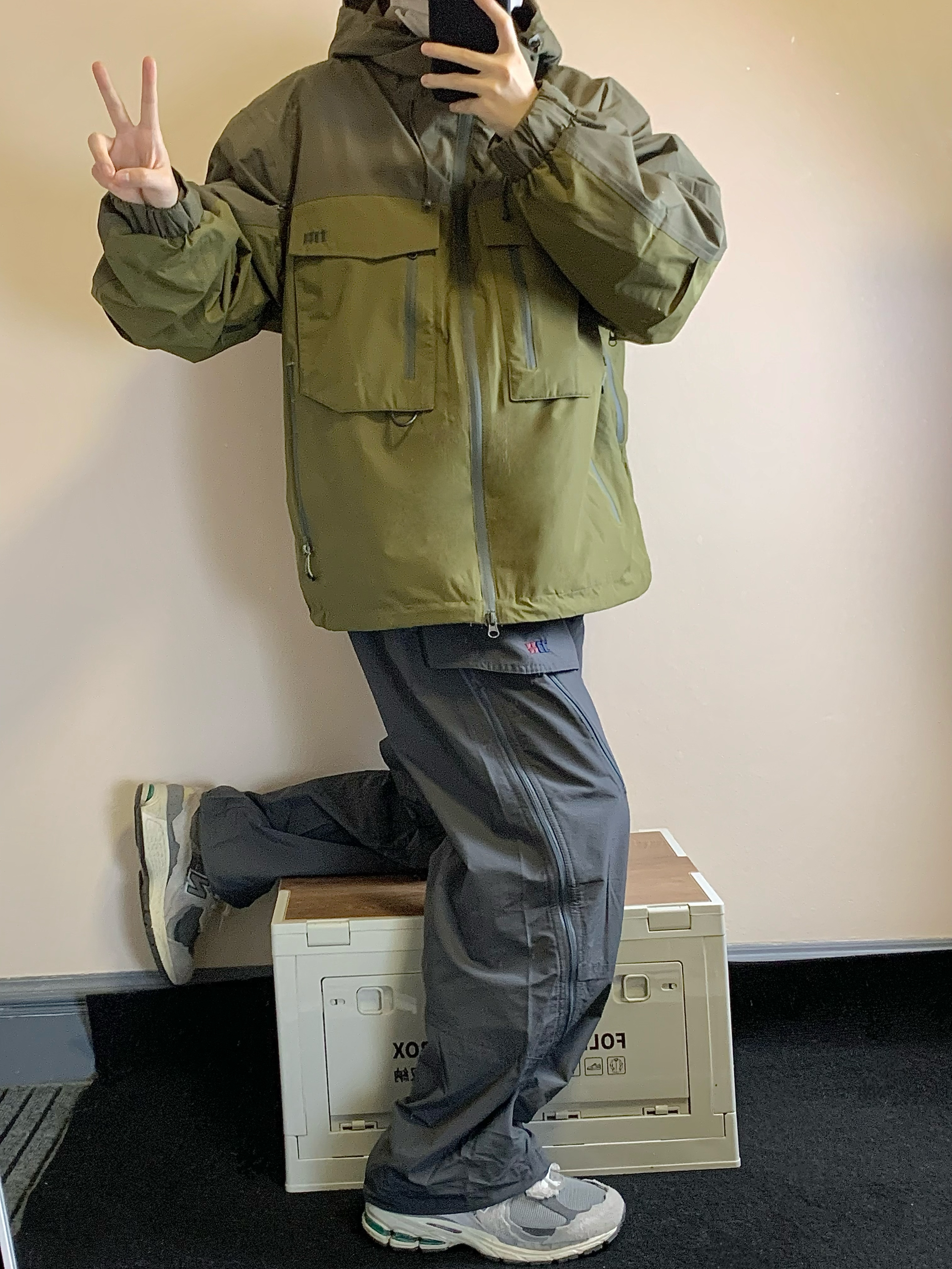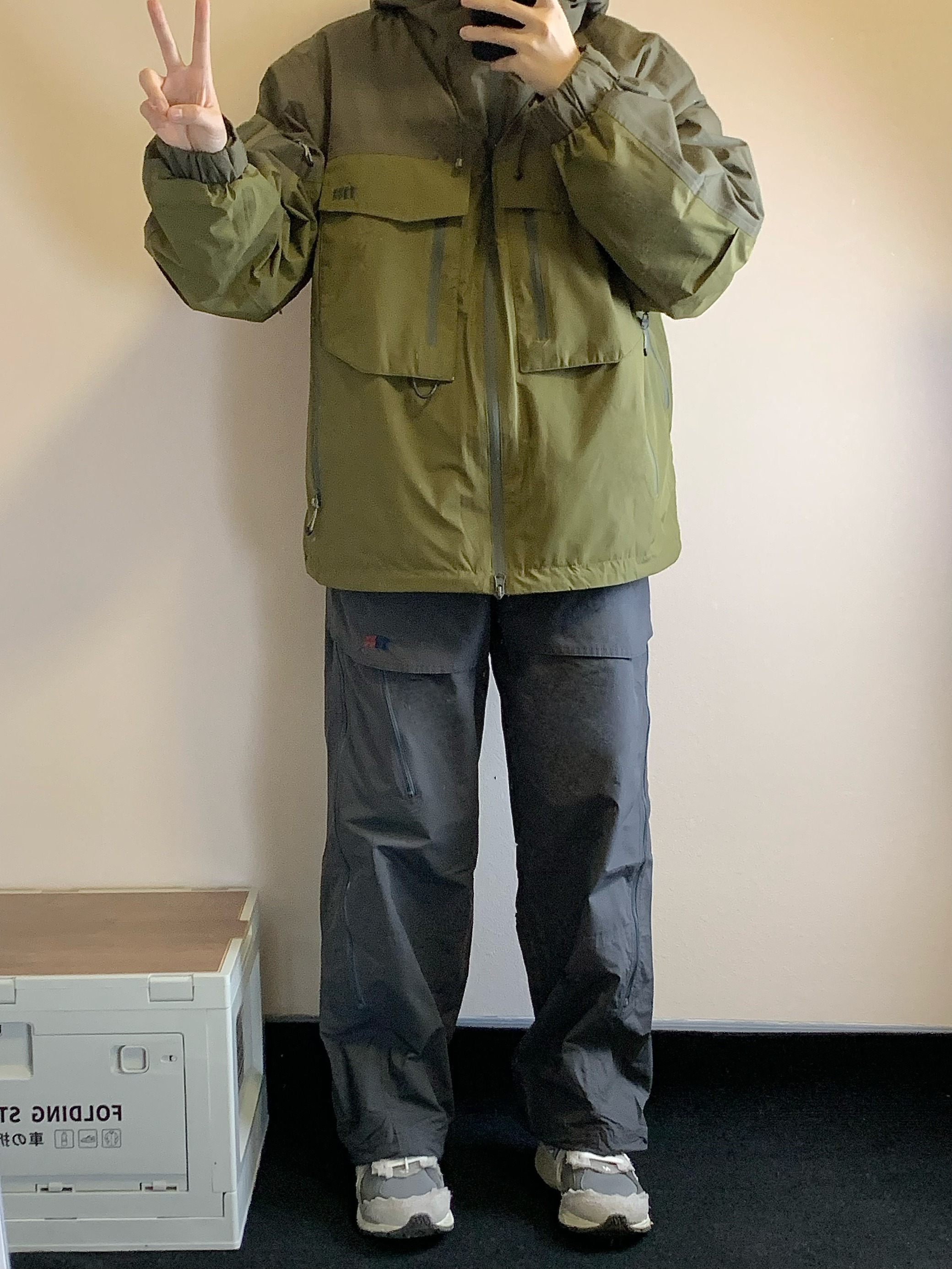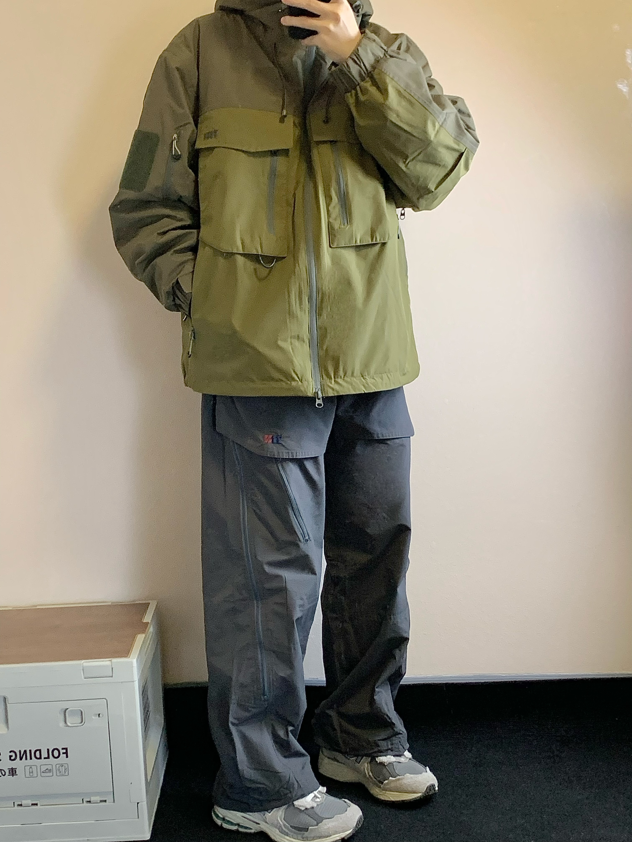 上衣是古苔绿色的冲锋衣 三合一设计 内里是一件羽绒内胆 800蓬的90白鸭绒填充 上身很暖和 单穿也好看 下装是灰色的骑行裤 有很多处拉链设计 谁穿谁帅 开学就穿这一身! 👔:NOTHOMME 👖:NOTHOMME 👟:NB2002R