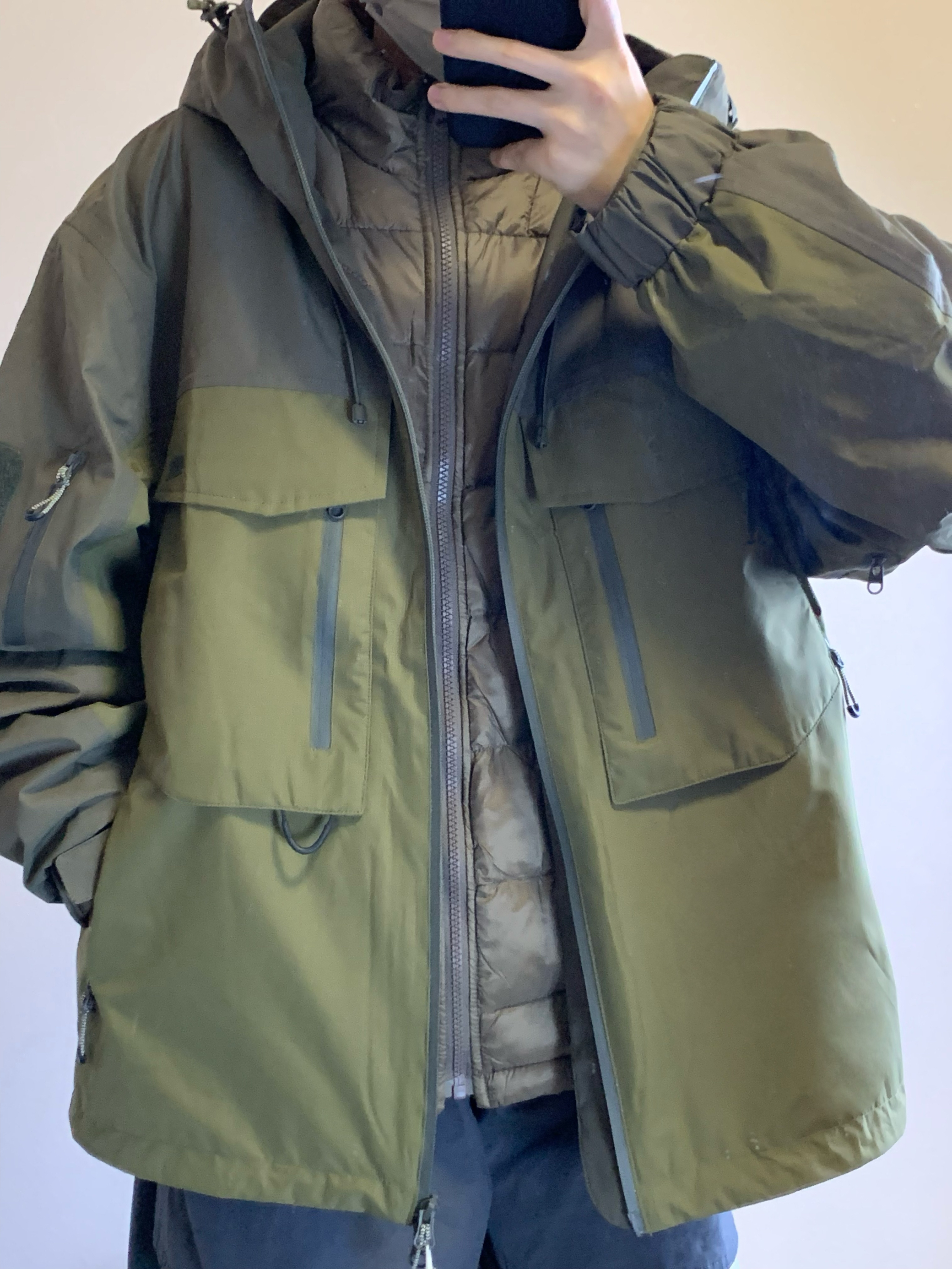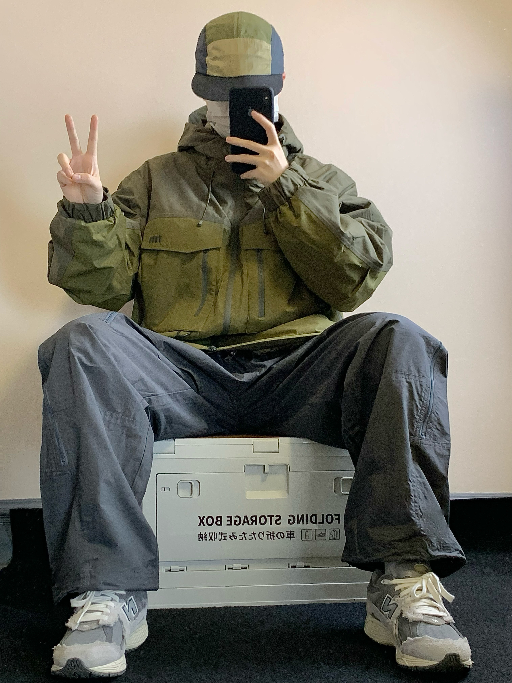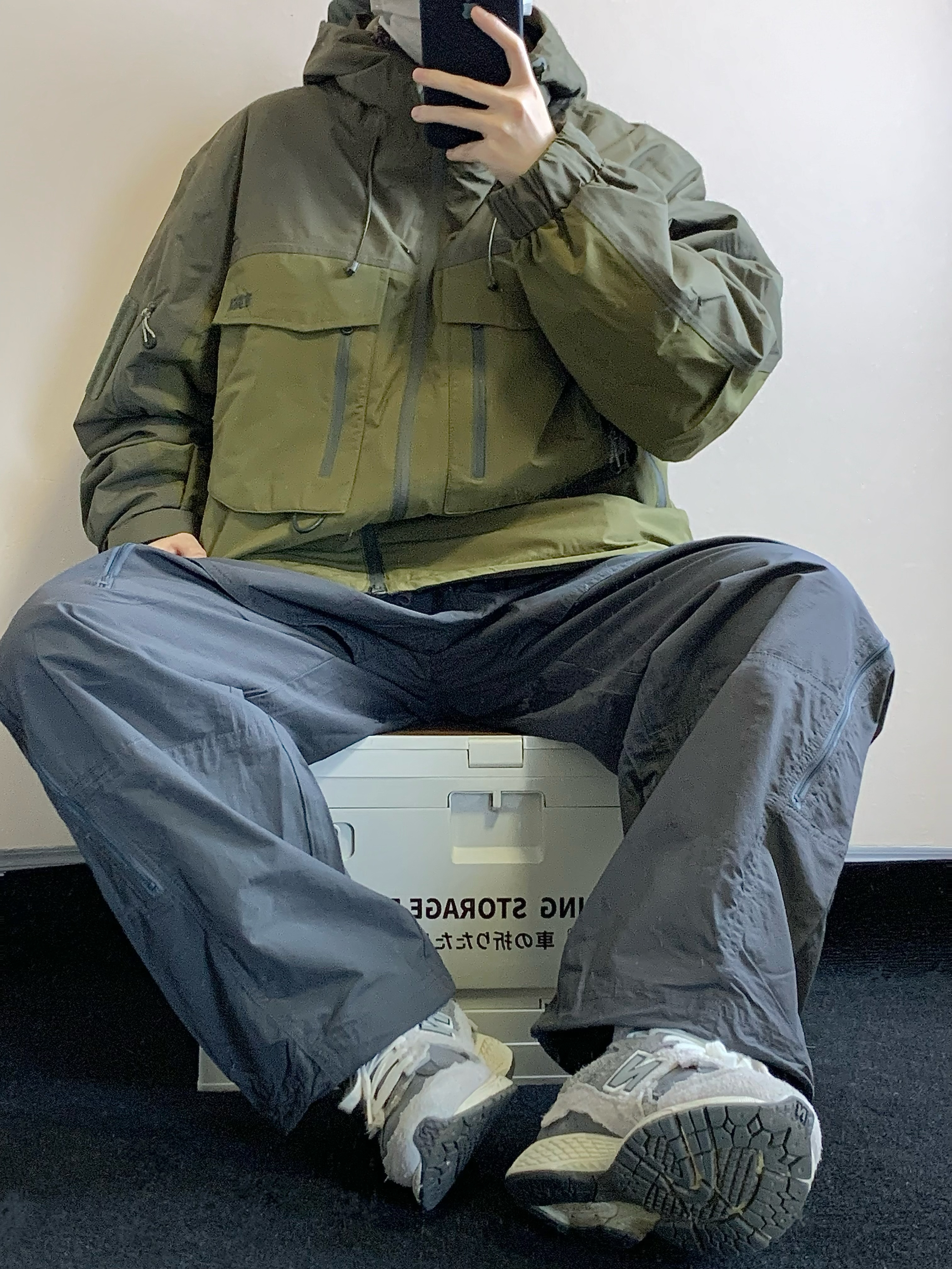 上衣是古苔绿色的冲锋衣 三合一设计 内里是一件羽绒内胆 800蓬的90白鸭绒填充 上身很暖和 单穿也好看 下装是灰色的骑行裤 有很多处拉链设计 谁穿谁帅 开学就穿这一身! 👔:NOTHOMME 👖:NOTHOMME 👟:NB2002R