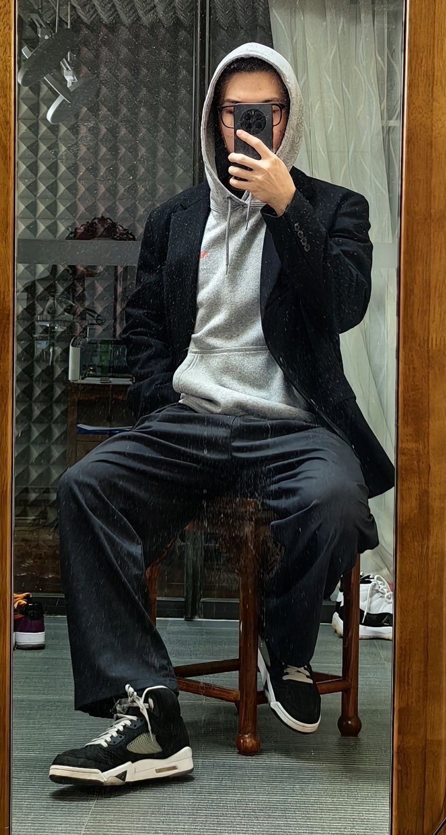 最近天气也在渐渐变暖,想必大家也开始思考开春了该怎么穿。 拿出我鞋柜里的AJ5就随便搭了一套。 奥利奥AJ5主色调是白色,灰色和黑色灰色的鞋带是我自己后来配上去的在衣服穿搭上也选择了灰和黑为主调然后裤子和外套选择了宽松款型的西装更加拥有质感。搭上奥利奥的AJ5显得沉稳且带有一点点奢侈的感觉