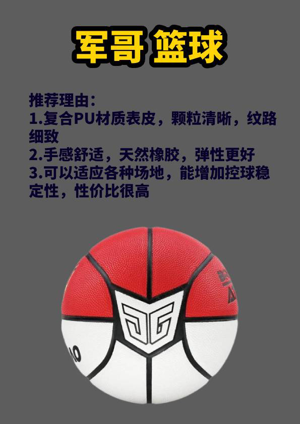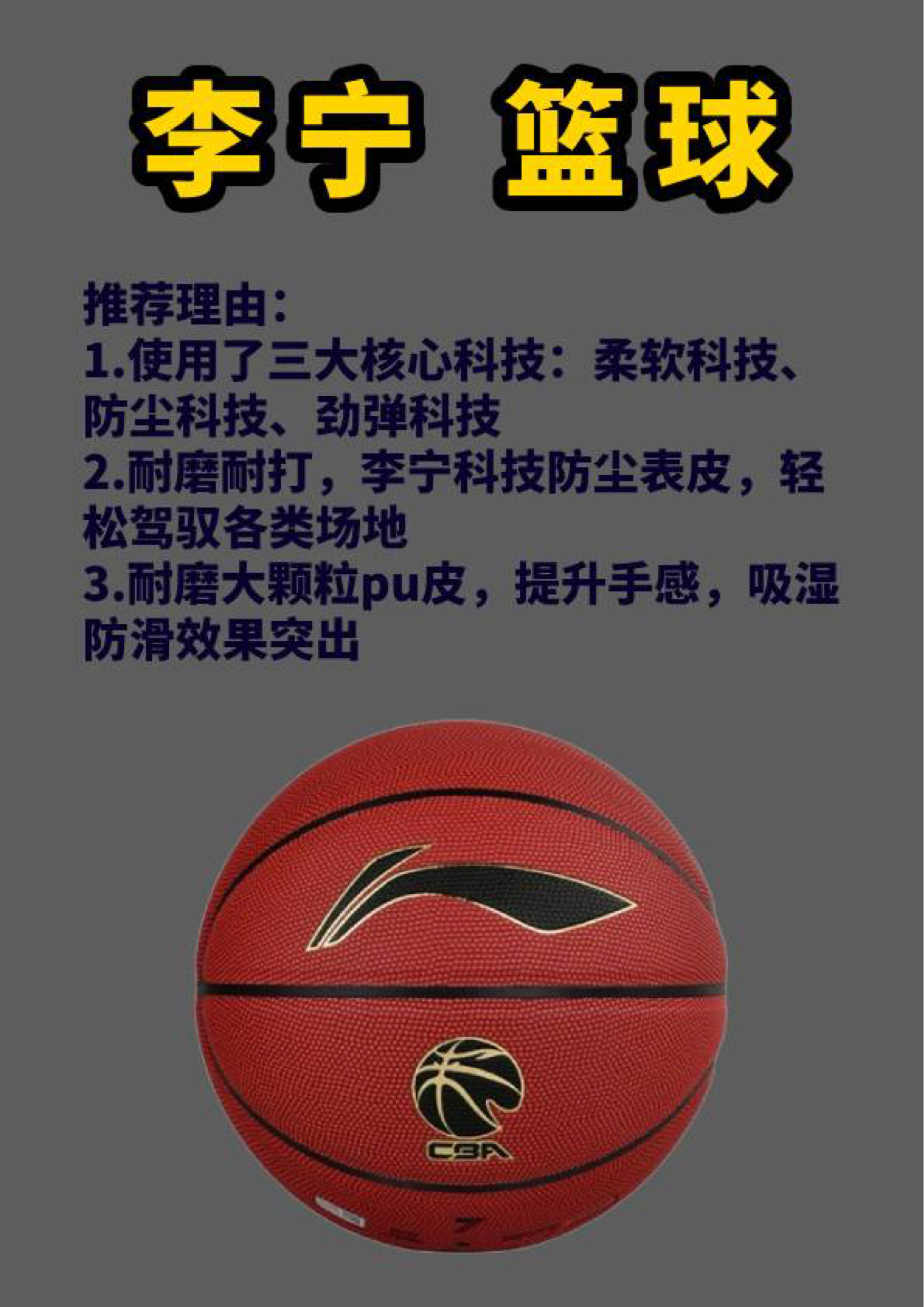 李宁篮球: 推荐理由: 1.使用了三大核心科技:柔软科技、防尘科技、劲弹科技 2.耐磨耐打,李宁科技防尘表皮,轻松驾驭各类场地 3.耐磨大颗粒pu皮,提升手感,吸湿防滑效果突出 安踏灵丹篮球: 推荐理由: 1.专业化的材质结构设计,每一层都有性能加持 2.高品质PU带来了细腻的手感,吸汗不打滑 3.异形纹路加深筋沟设计,提高操控手感,抓握感十足 准者篮球: 推荐理由: 1.红蓝色撞色设计,经典...