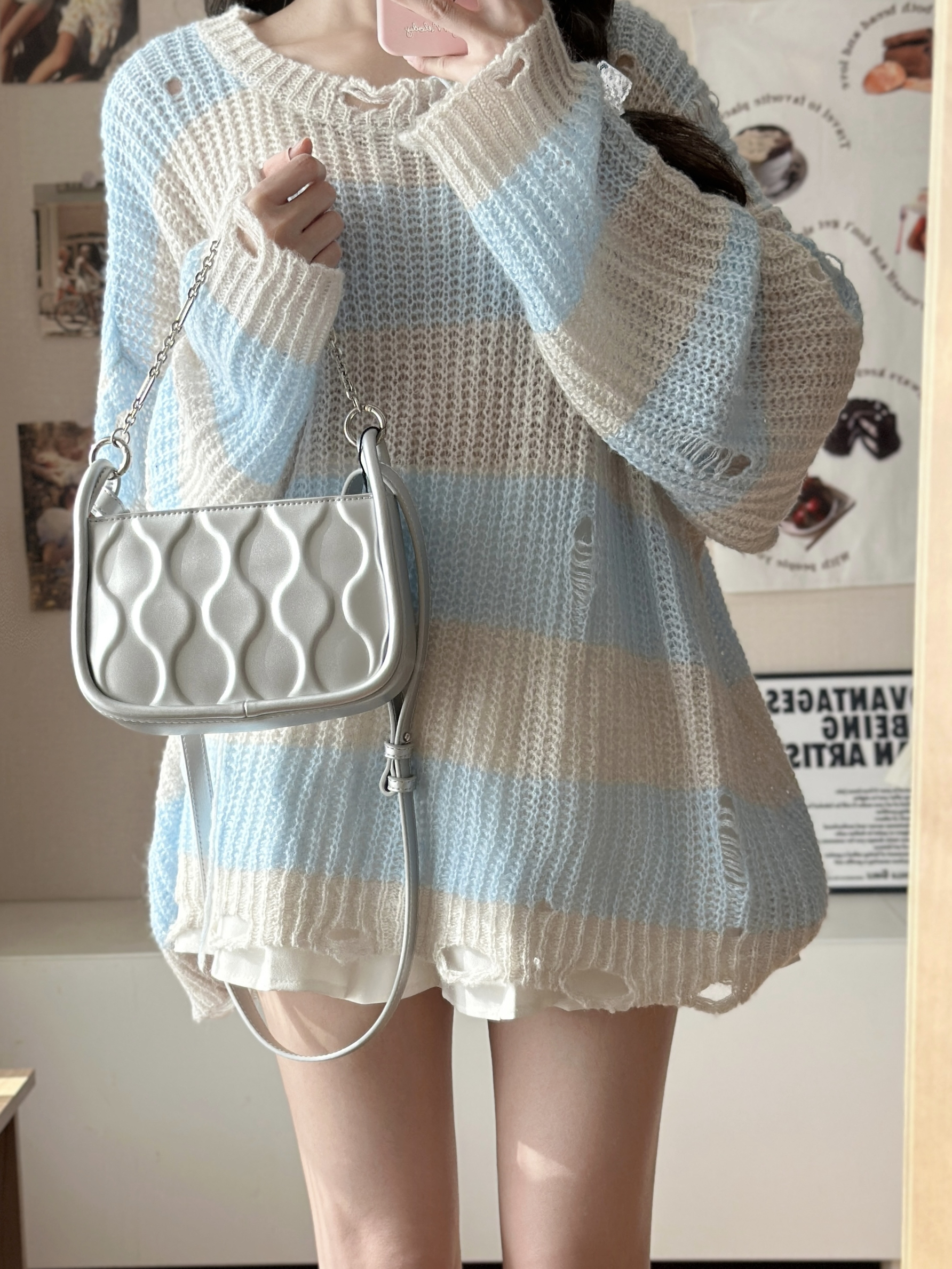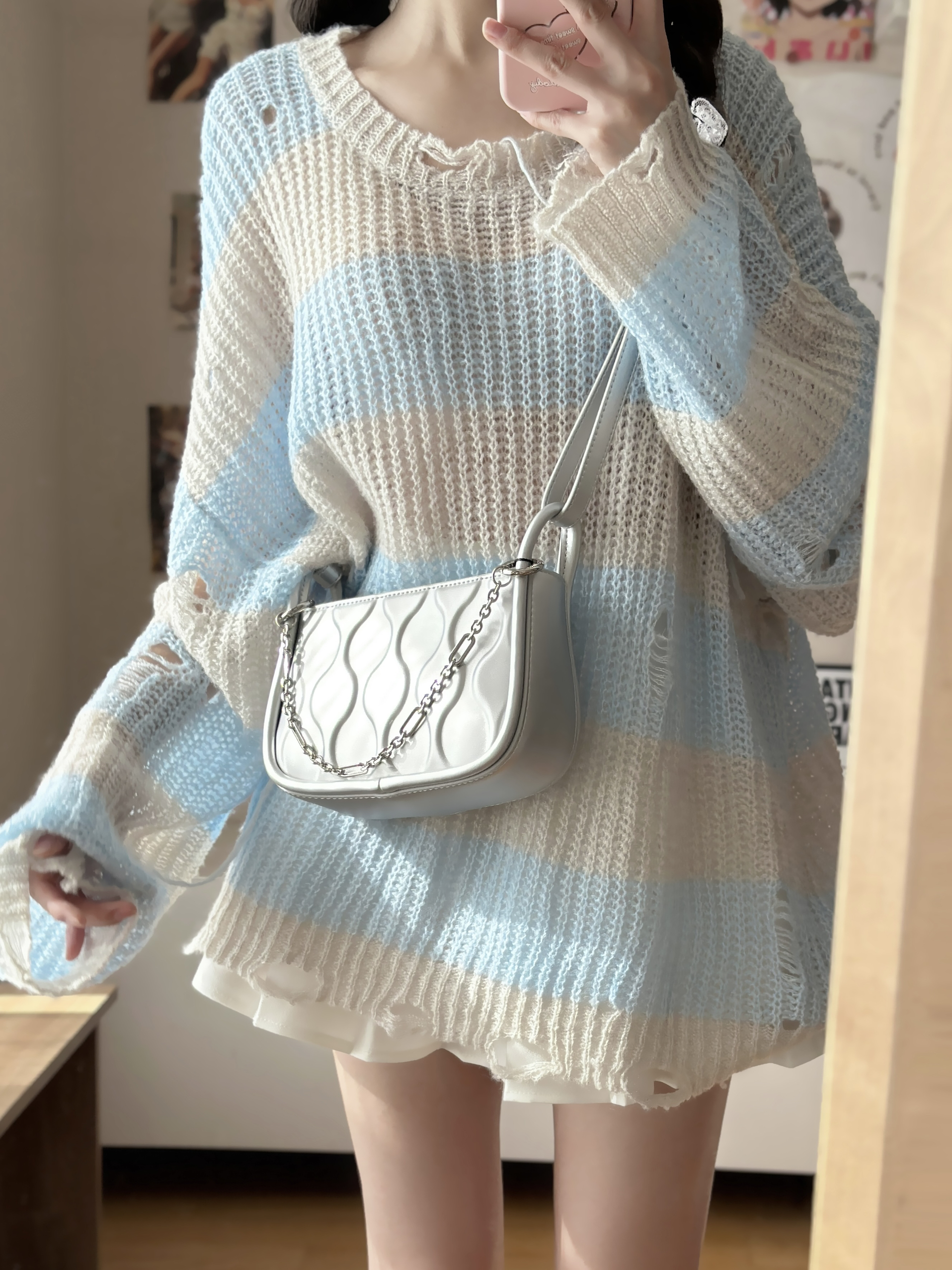 身高|体重:164-42 🧍♂️ 穿搭风格:早春针织穿搭 👔 上衣:蓝色针织毛衣 👖 下装:小白裙 👟 鞋子:aj312北卡蓝 🎒配饰:银色包包 一整套慵懒干净的感觉~