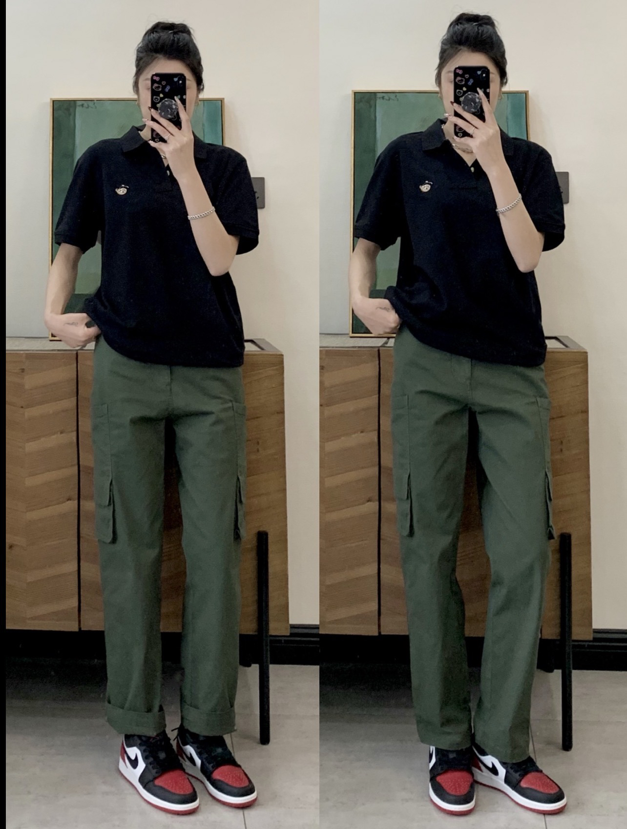 今日份穿搭来啦今天是男朋友风 戴的ARSIS的配饰他家款式不挑风格hin小众的设计今天中性风搭配的古巴项链复古风yyds闪钻的手链也是好看滴礼盒包装送人也是不错滴 、 TWM的polo衫T恤初春少不了哇黑色经典款简单的小熊刺绣最近一直在搭配的军绿工装裤 164/88上衣裤子s女孩子小码就好啦搭aj.1