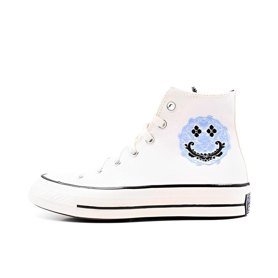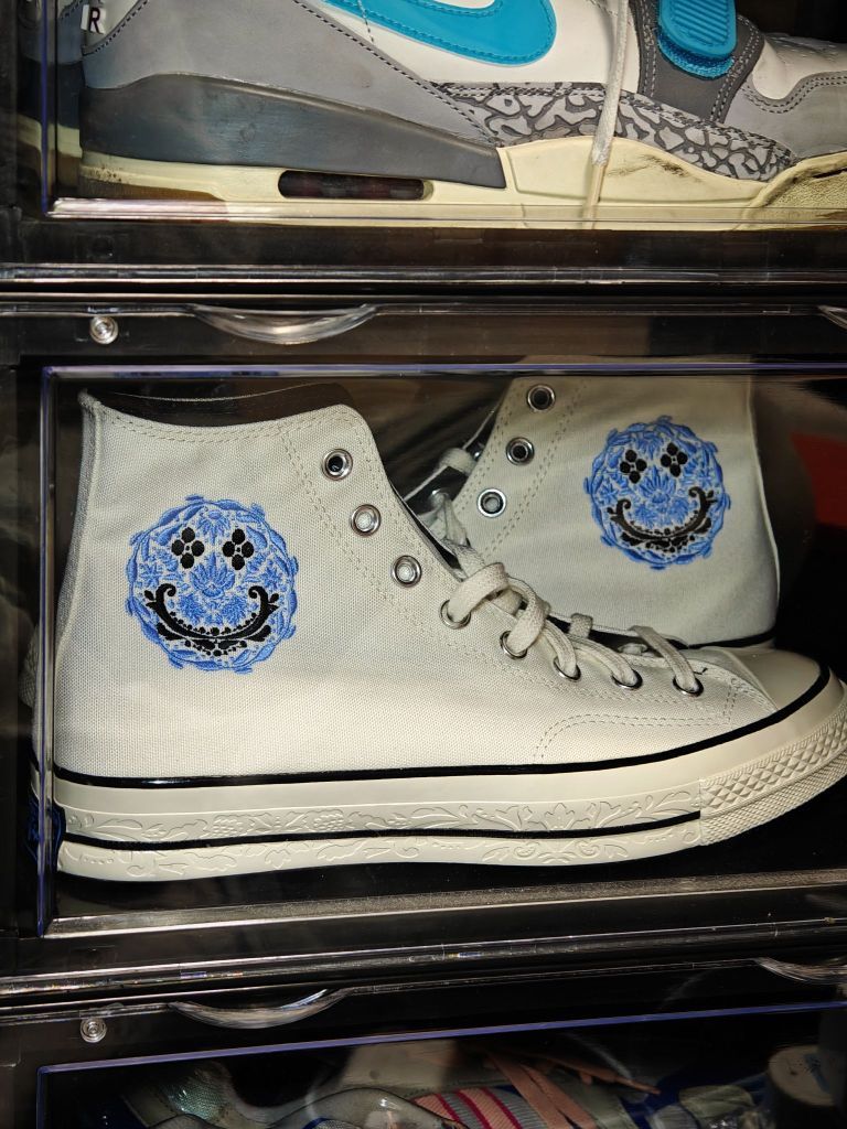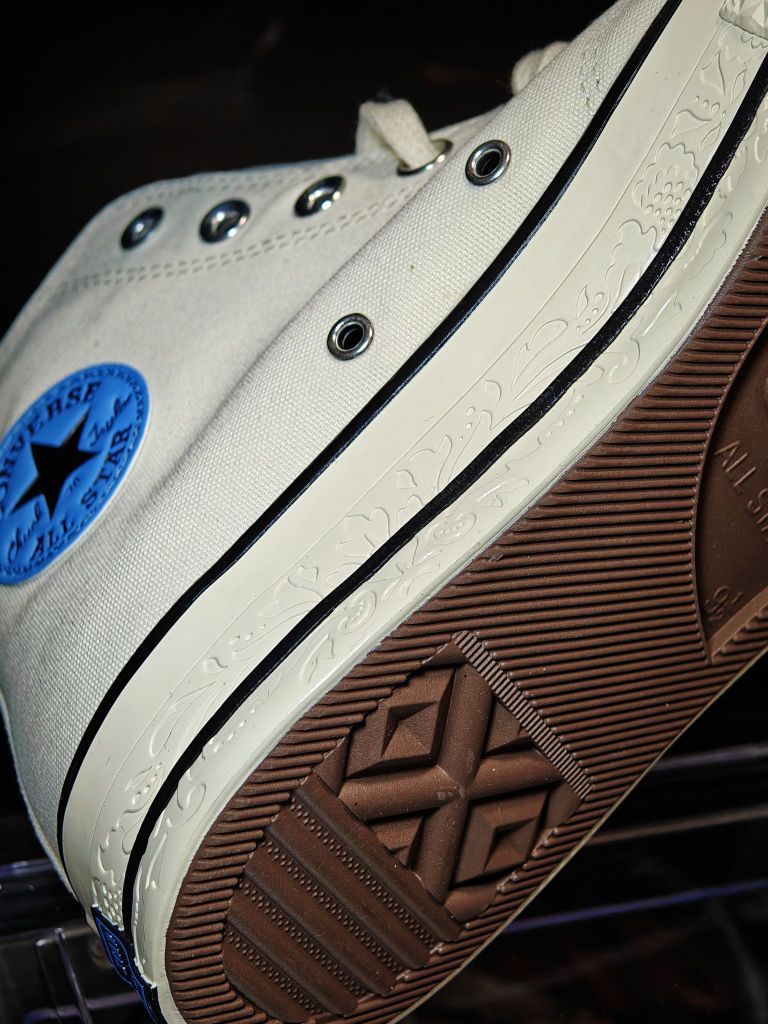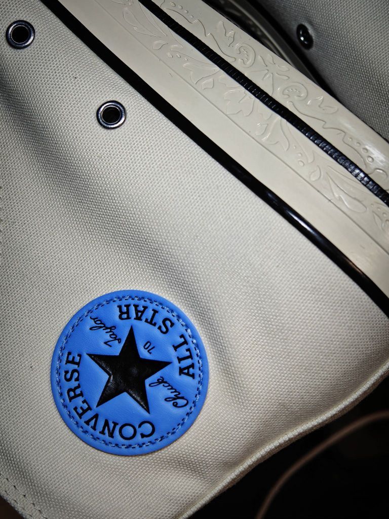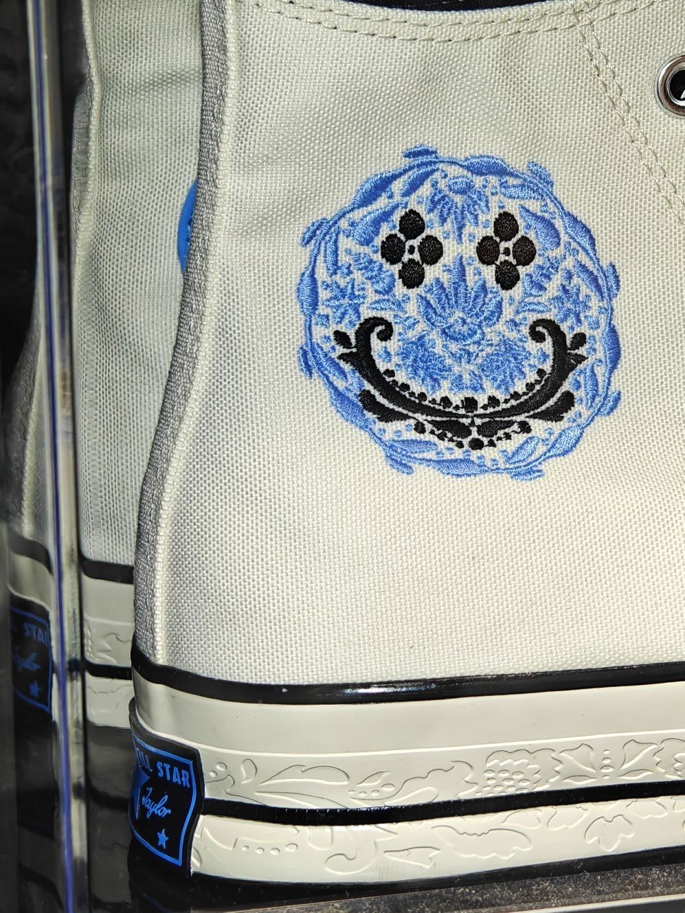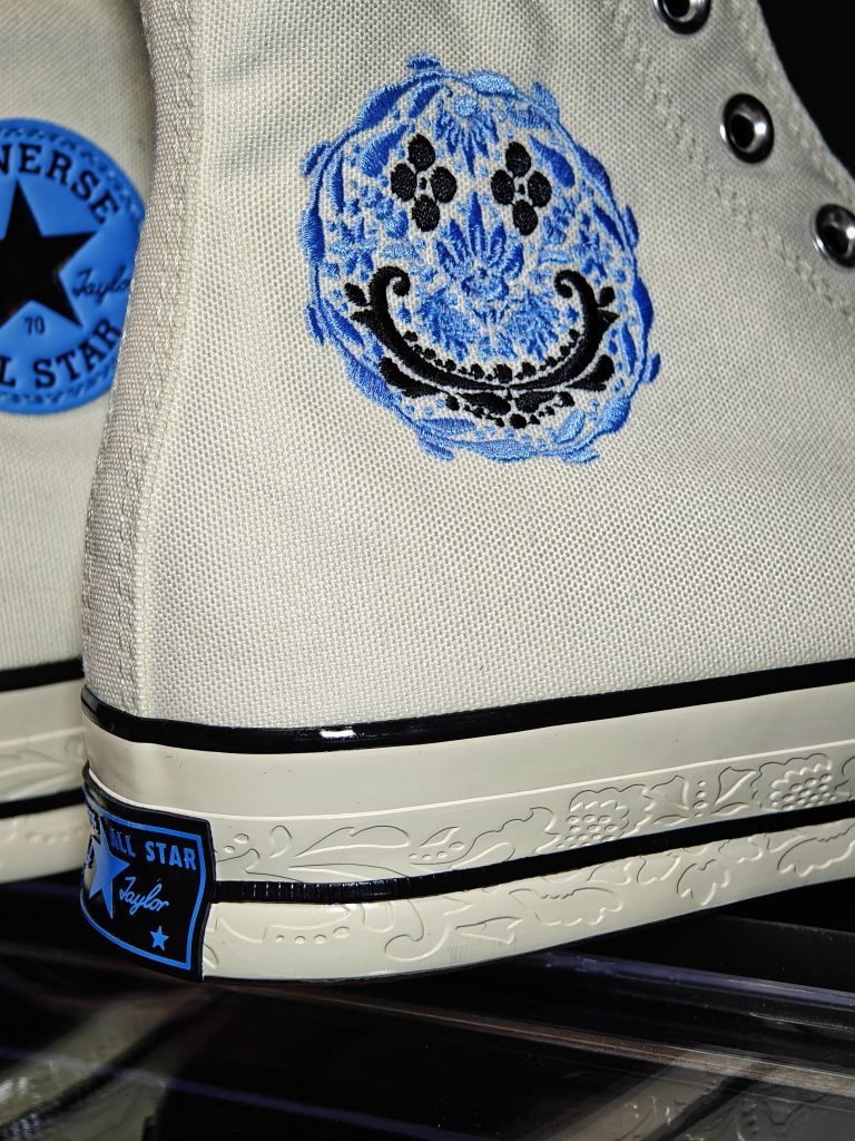 这双匡威整体配色还是很清爽的 米白的鞋面加上蓝色的logo和笑脸花卉刺绣 后跟的标也是黑篮 中底还细节的做了浮雕处理 相比基础款的1970s这款的质感要更好些