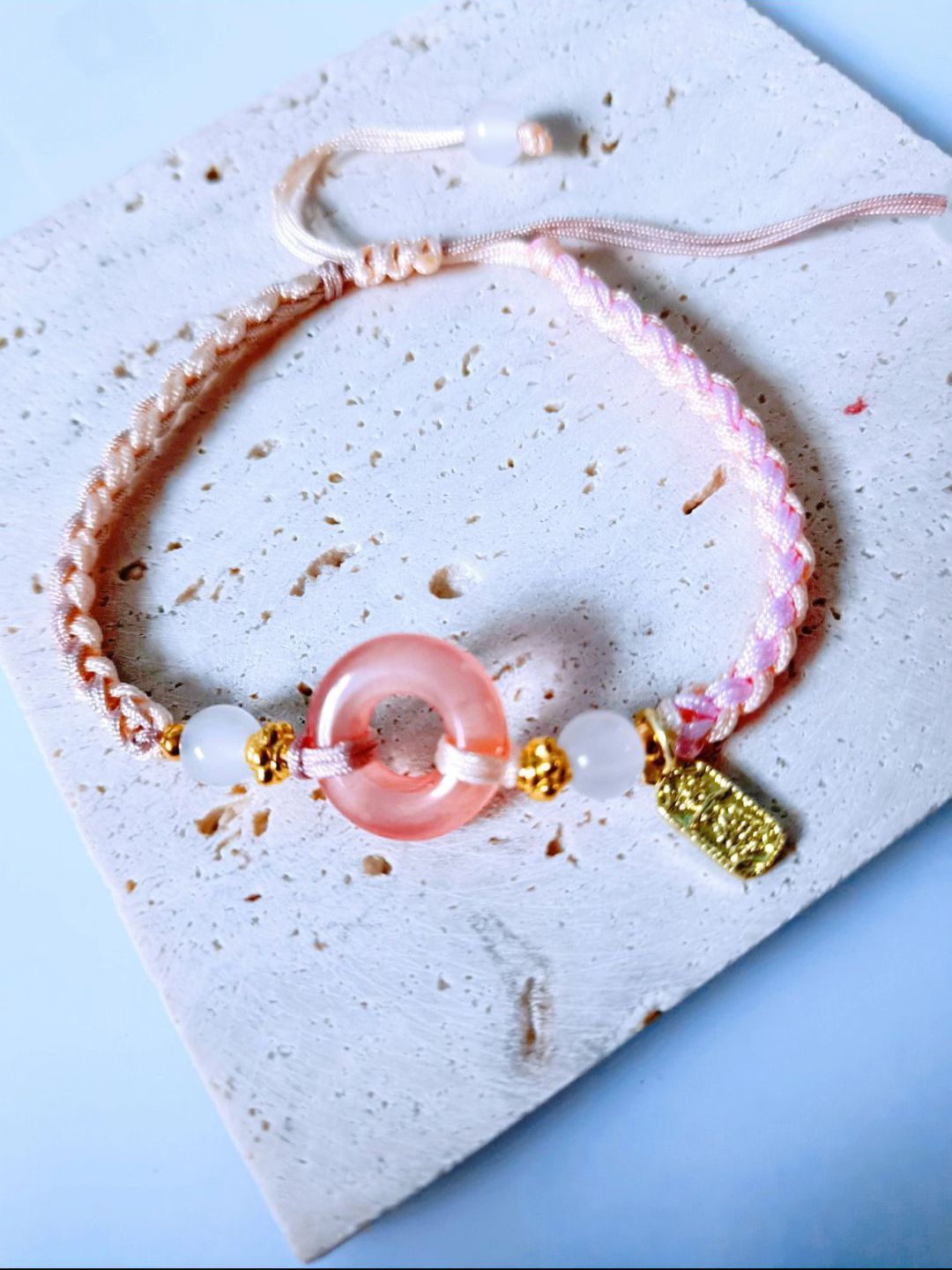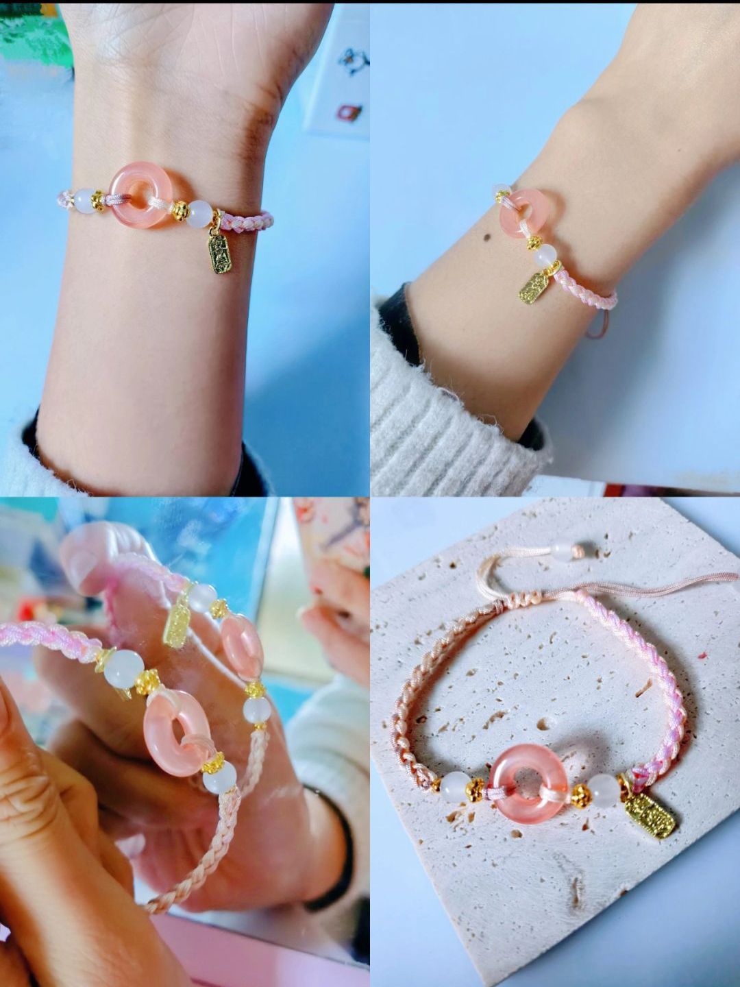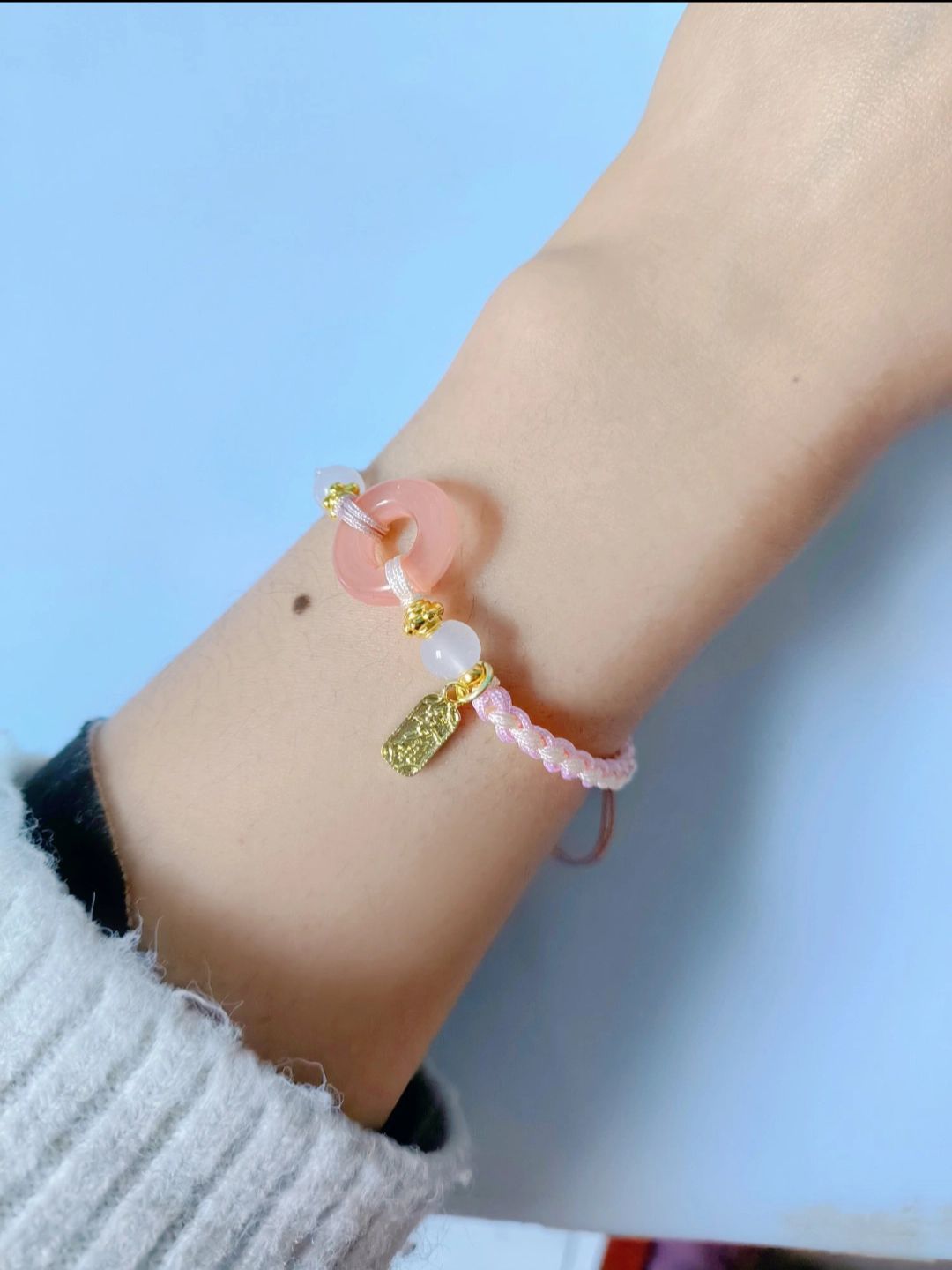 平安扣手串 粉嫩嫩的小确幸谁不喜欢啊! 好喜欢我的平安扣编织手绳~ 少女心满满的粉色,金色平安小牌,戴上去好可爱呀 寓意也很好,很吉祥喔 一起平平安安过龙年~万事如意