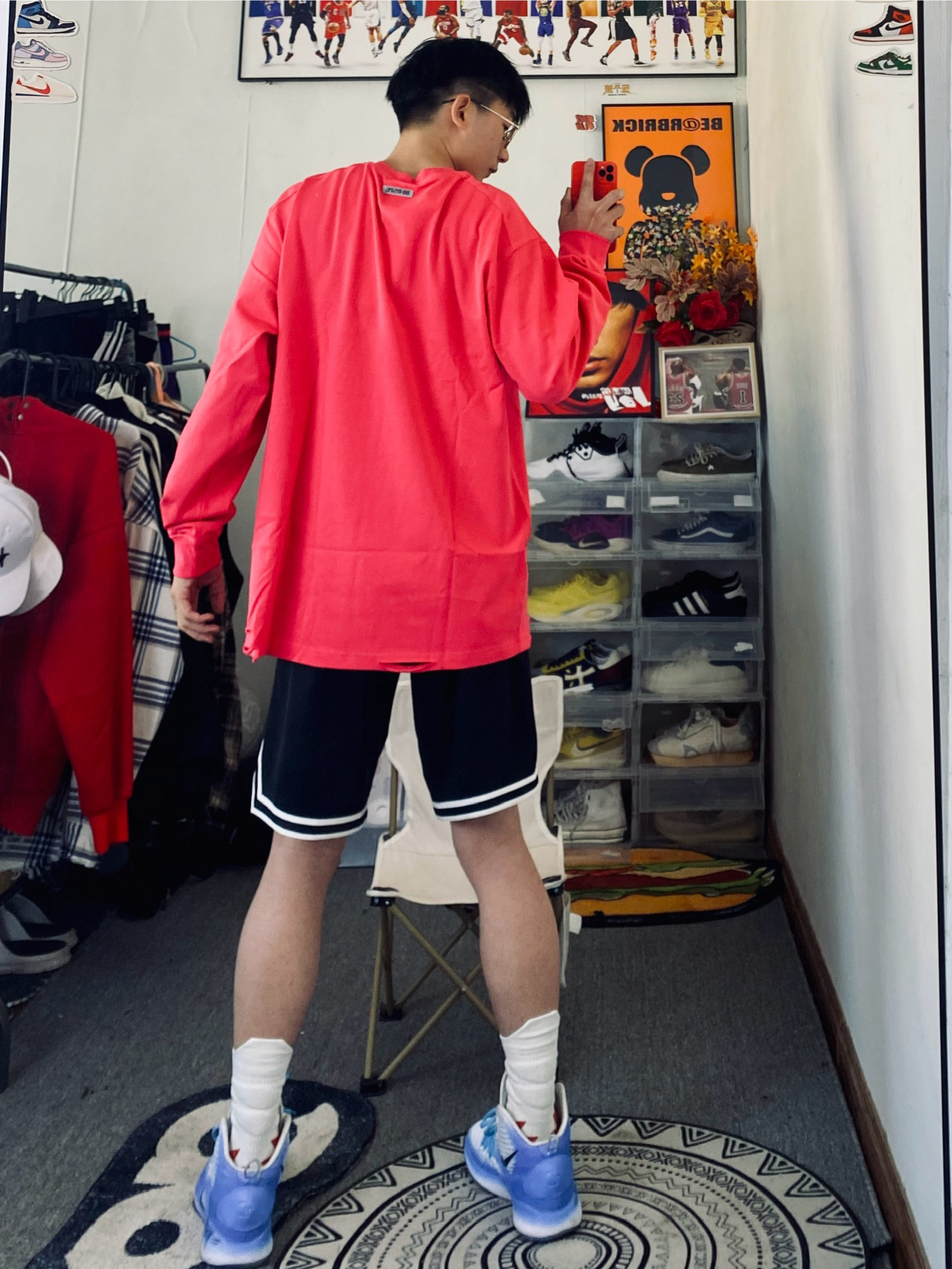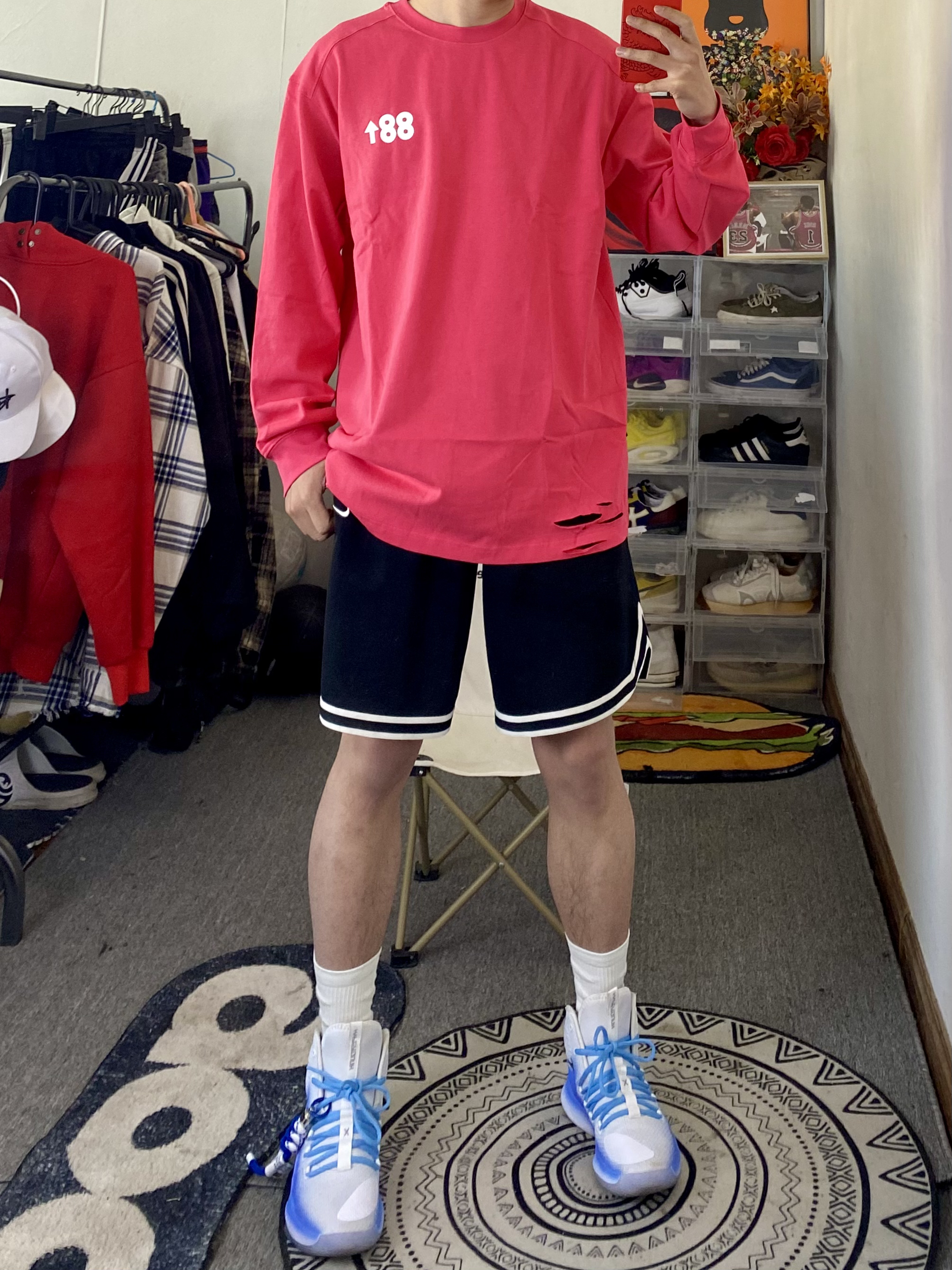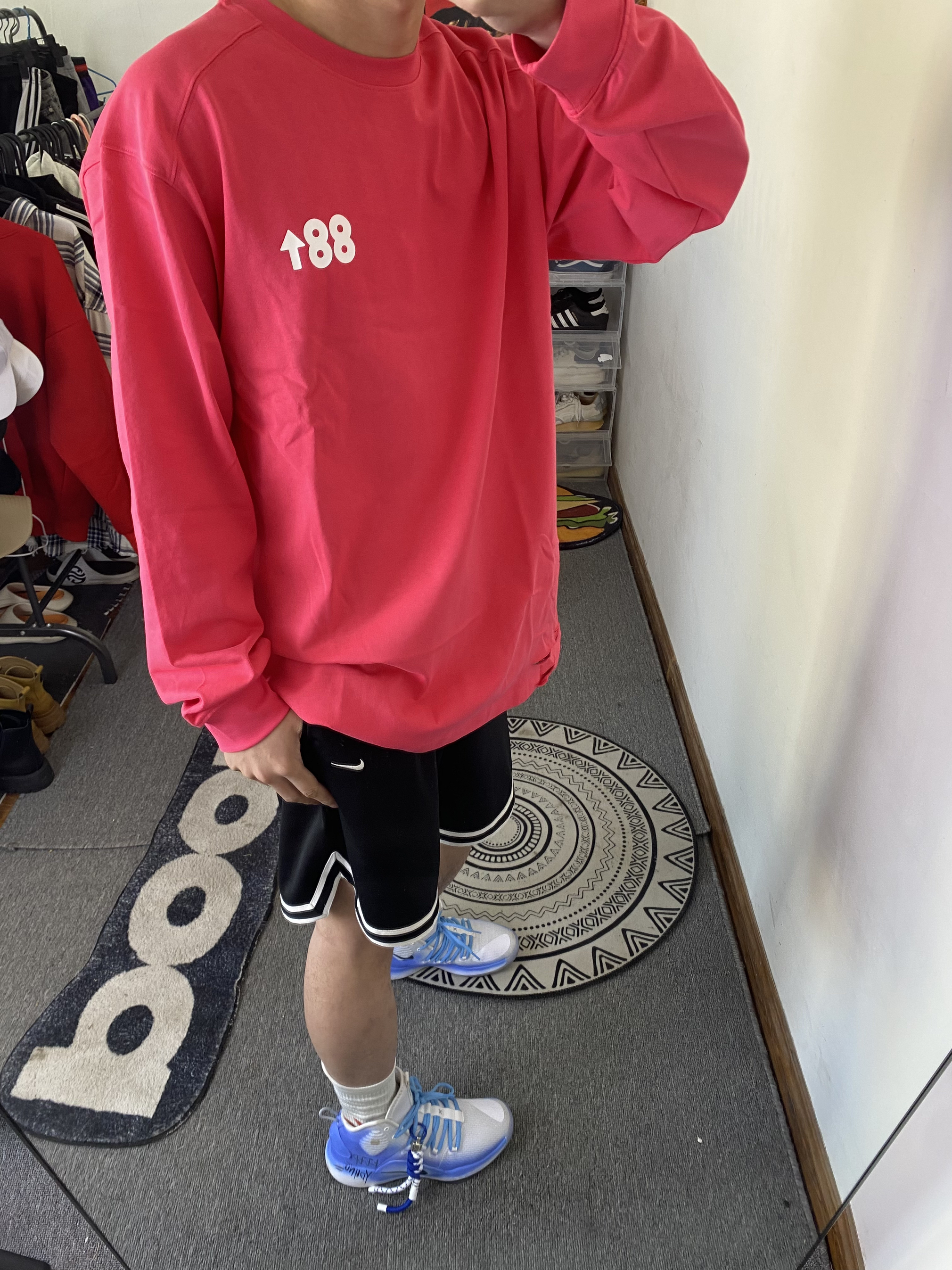 冰美式今日穿搭 👔衣服穿了一件基础款字母长袖 颜色选择了玖红色 这个配色真的显白 基础款的款式百搭又耐看🛰️ — 👖裤子是一条耐克篮球短裤🩳 网眼设计 透气性拉满 黑色款穿搭不容易出错😘 — 👟鞋子是一双hyperdunk2018高帮定制篮球鞋🐝 — 尺码推荐:本人身高178体重130斤 衣服裤子选择的都是xl 这是我的上身效果 大家可以参考一下