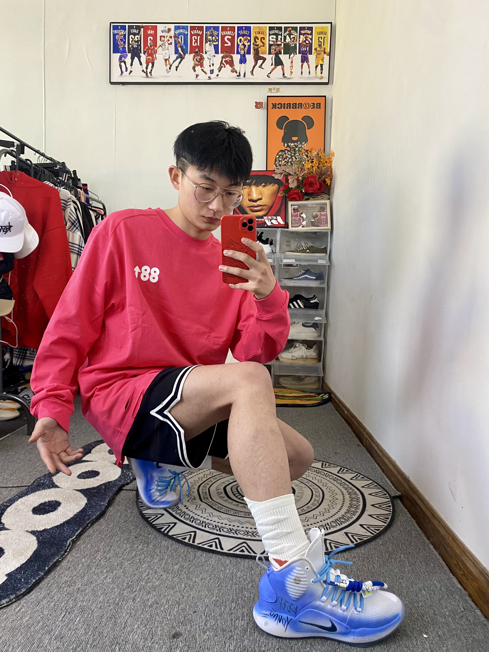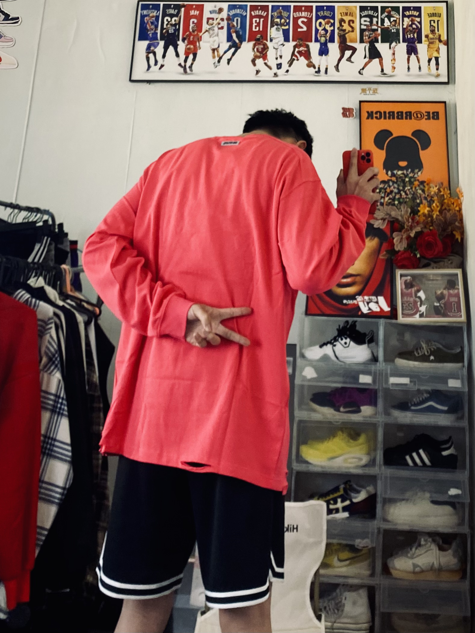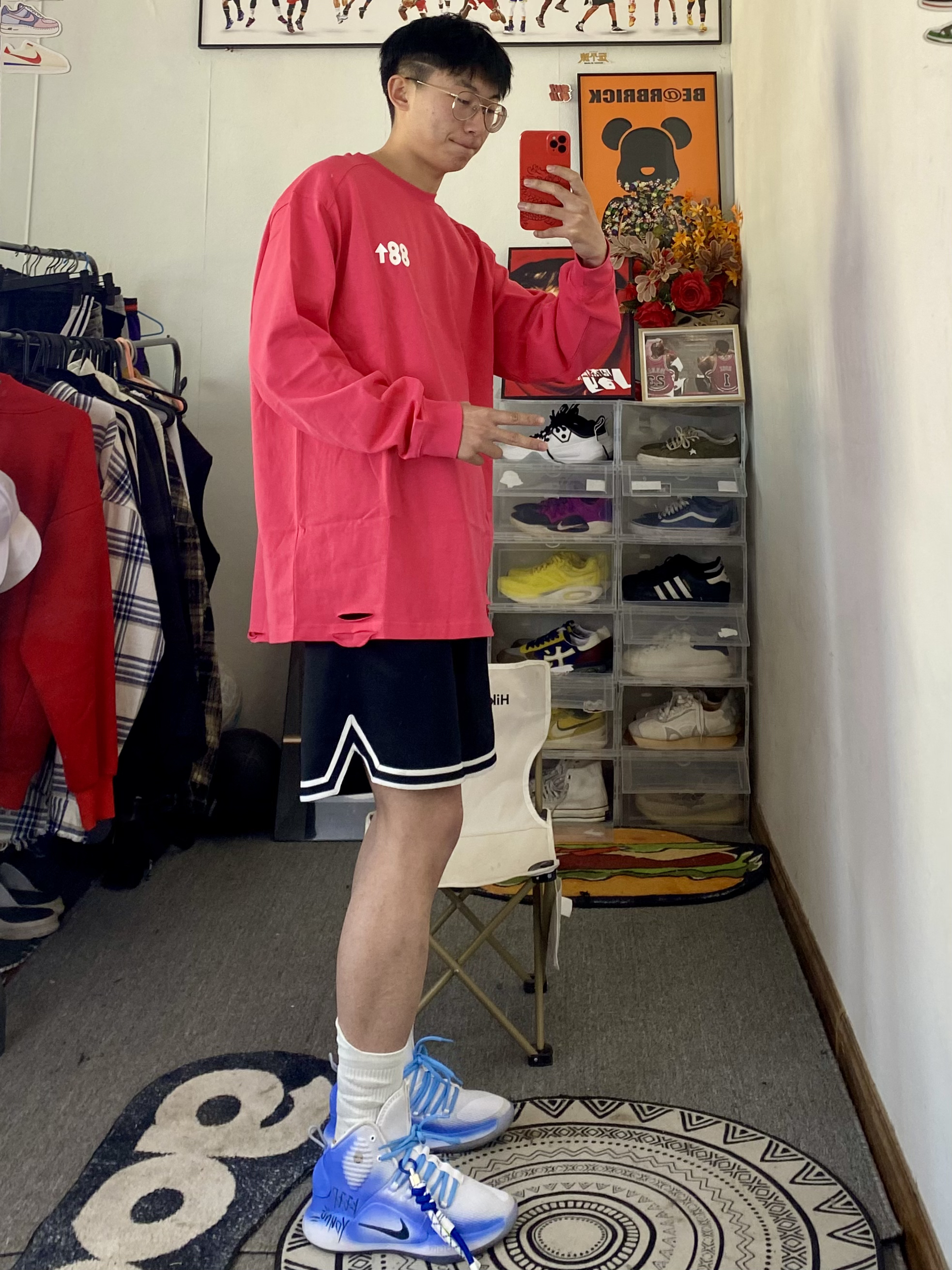 冰美式今日穿搭 👔衣服穿了一件基础款字母长袖 颜色选择了玖红色 这个配色真的显白 基础款的款式百搭又耐看🛰️ — 👖裤子是一条耐克篮球短裤🩳 网眼设计 透气性拉满 黑色款穿搭不容易出错😘 — 👟鞋子是一双hyperdunk2018高帮定制篮球鞋🐝 — 尺码推荐:本人身高178体重130斤 衣服裤子选择的都是xl 这是我的上身效果 大家可以参考一下
