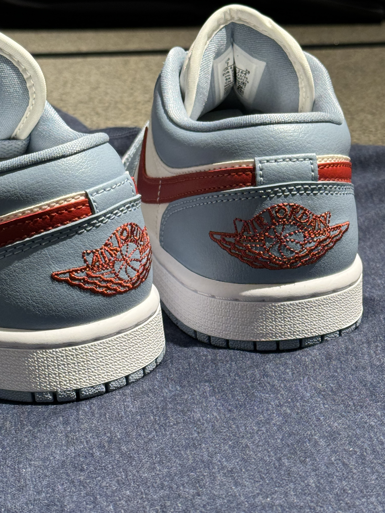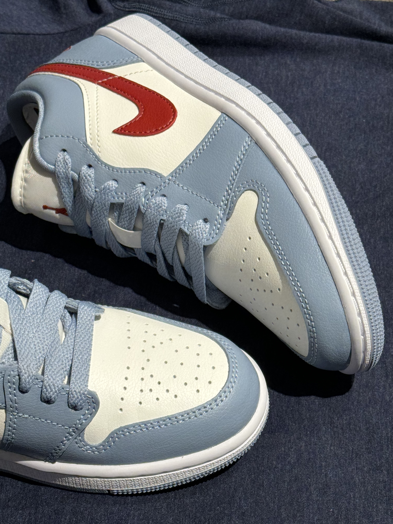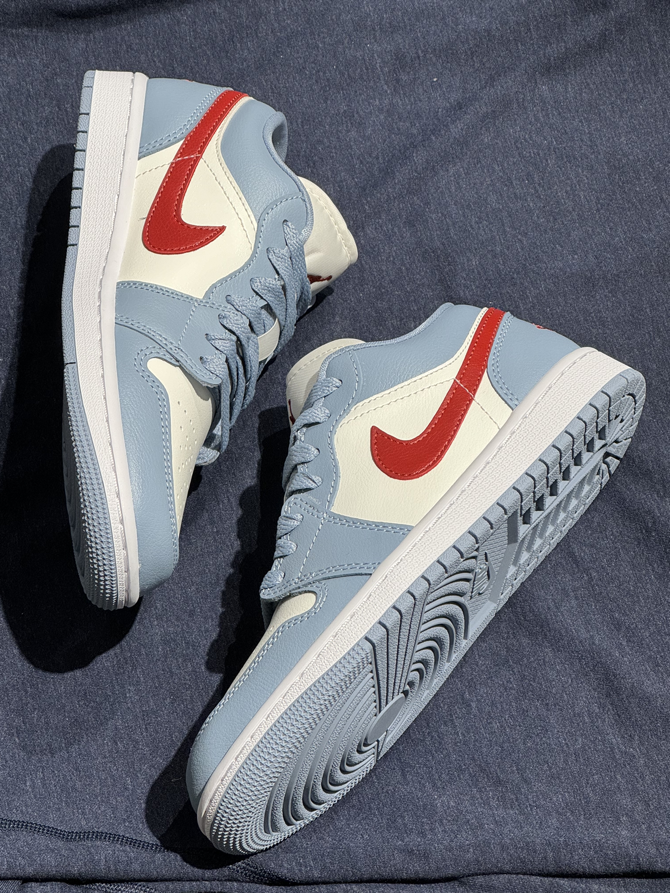 ✈️✈️Air Jordan 1 Low 蓝红配色 经典的乔丹一代的鞋型加上质感的皮革表面,同时在球鞋的后跟处也是融入到了飞翼LOGO元素,通过刺绣的形式在球鞋的后提处进行到的展现。那么作为一个浅浅色系的北卡蓝加上了火焰红会是你喜欢的球鞋嘛!
