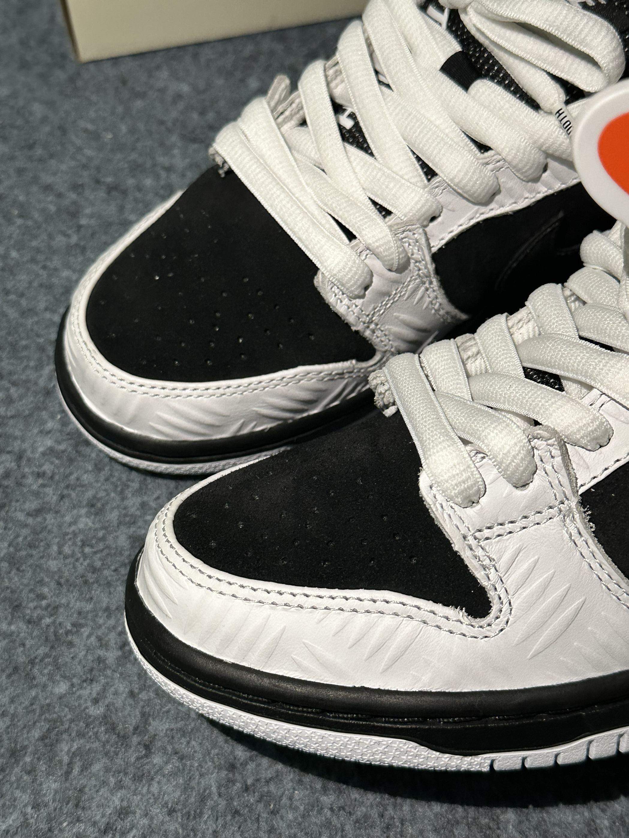 Hello 大家好,这里是41码先森 ,今天给大家开箱的是TIGHTBOOTH x Nike Dunk SB Low Pro "Black and White" 鞋面鞋身以白色为主色调,采用反转熊猫配色,侧面swoosh更是采用反光材料并用标收尾,彰显联名身份。 鞋身材质以白色皮革搭配黑色麂皮组成,并且白色鞋身皮质配有钢筋螺纹纹路呈现出户外机能风的感觉! 搭配方面,对于黑白配色的大家无论是休...