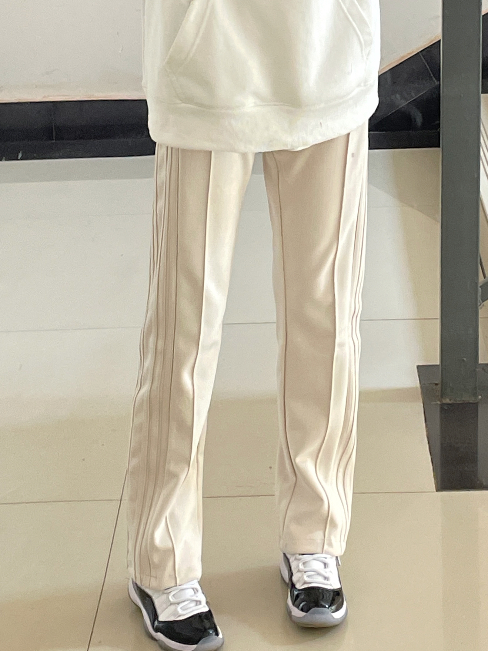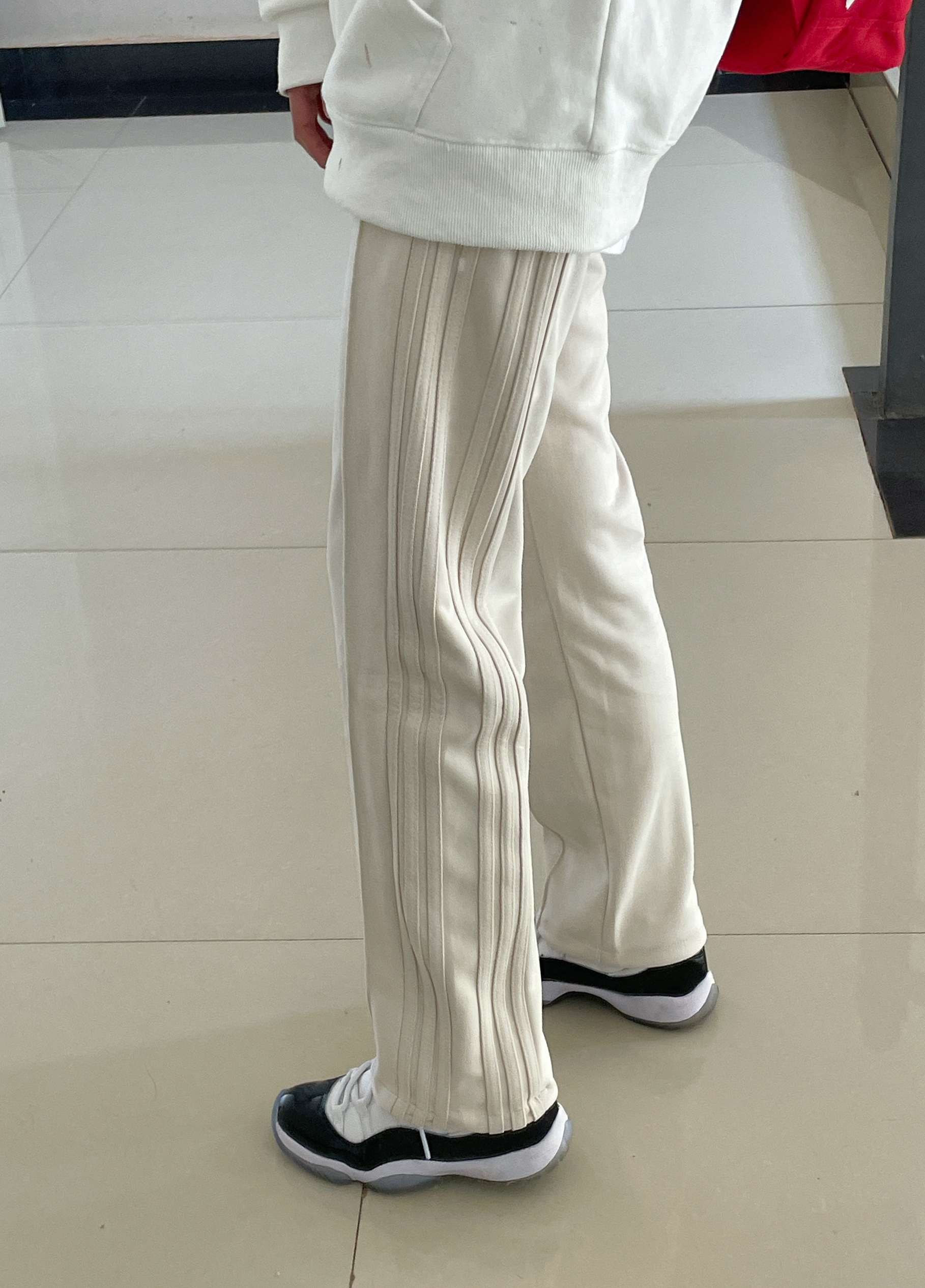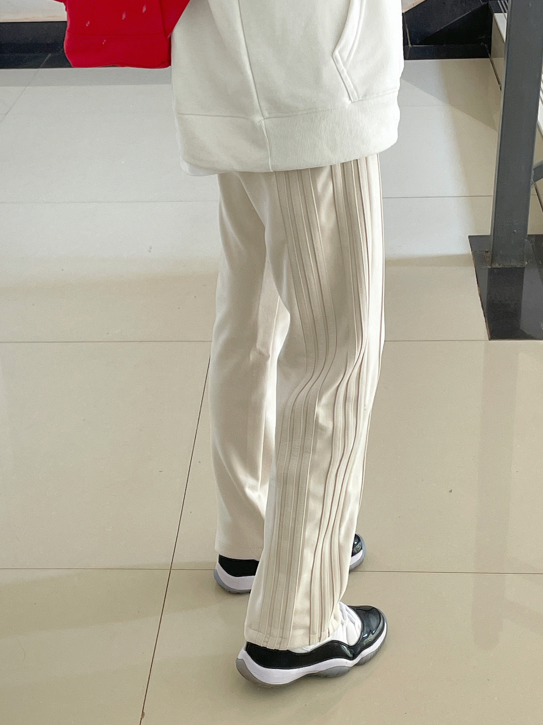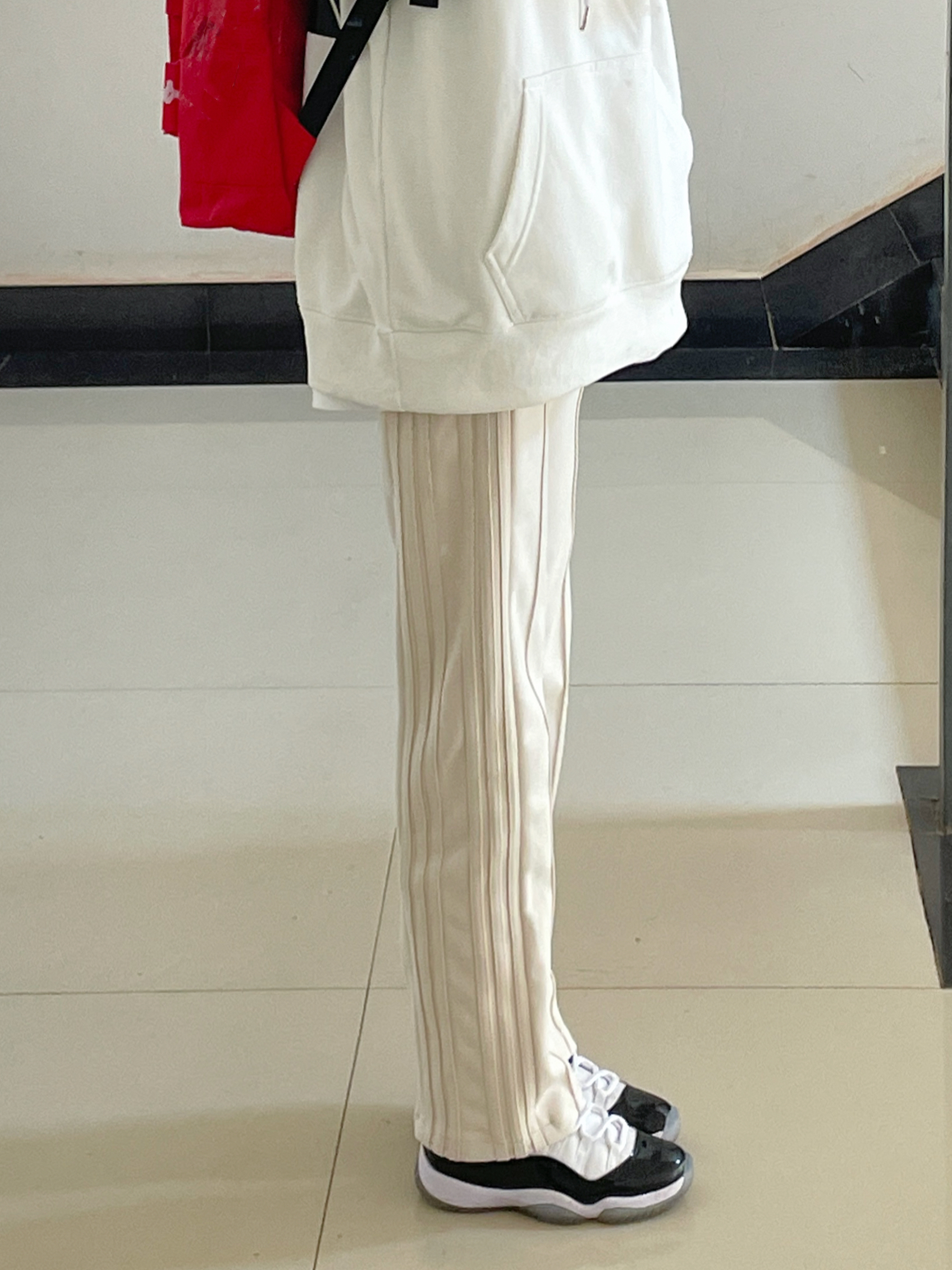 👔 :palace 白色卫衣 👖 :coldstone麂皮休闲裤 质感材质都很好 直筒版型 穿上真的很显腿直 🎒 :kappa红色双肩包 👟 :aj11黑白康扣