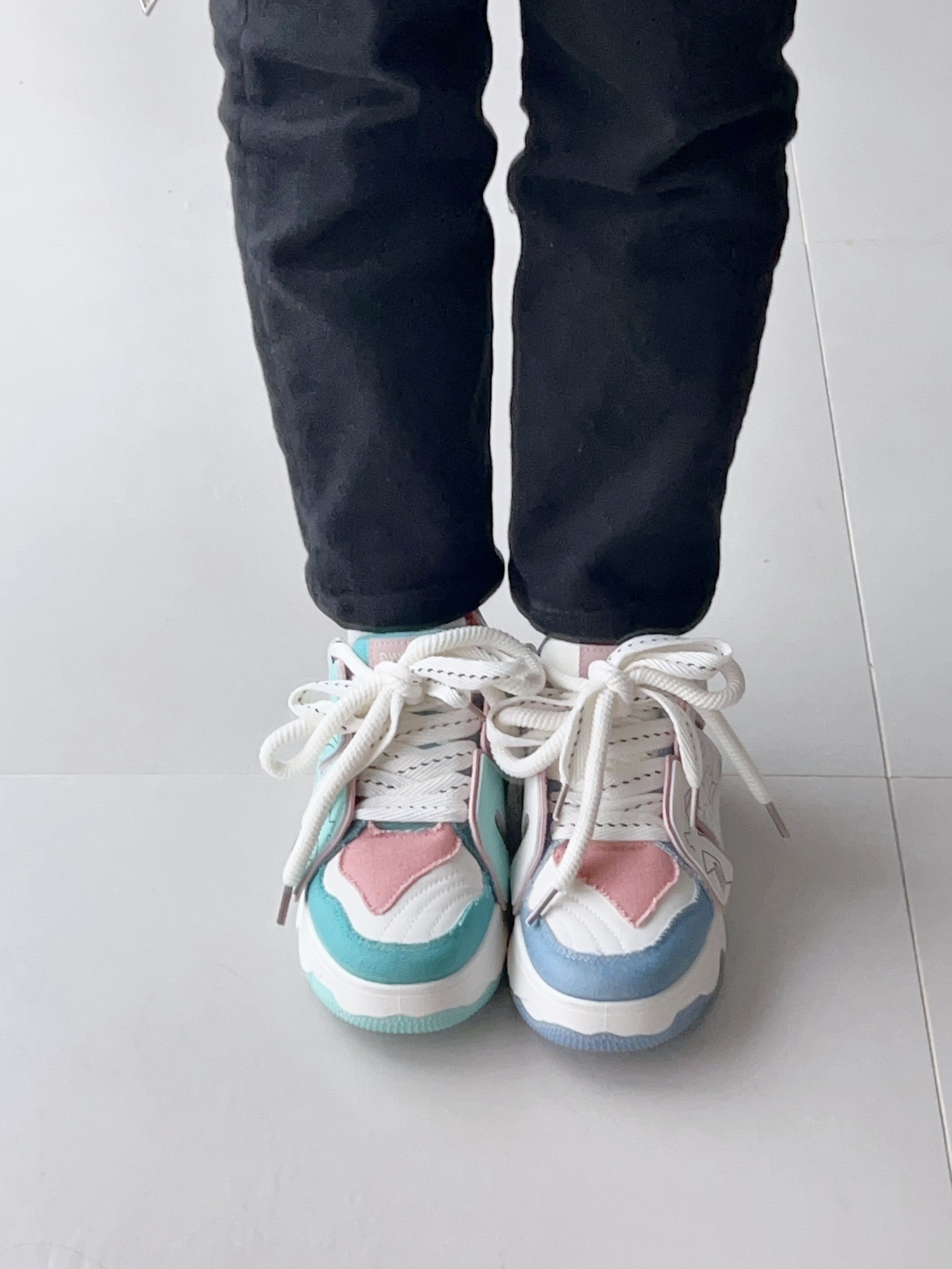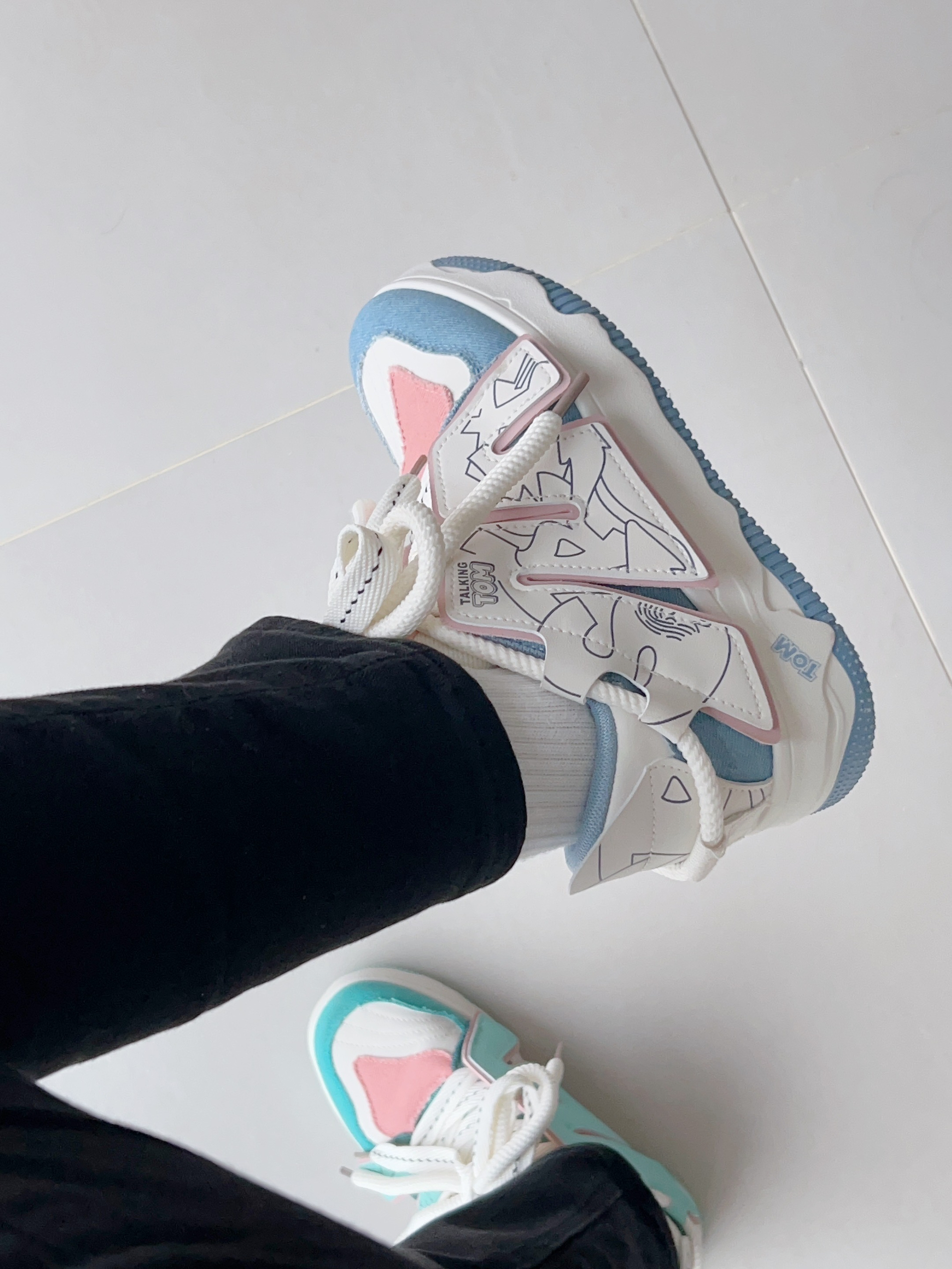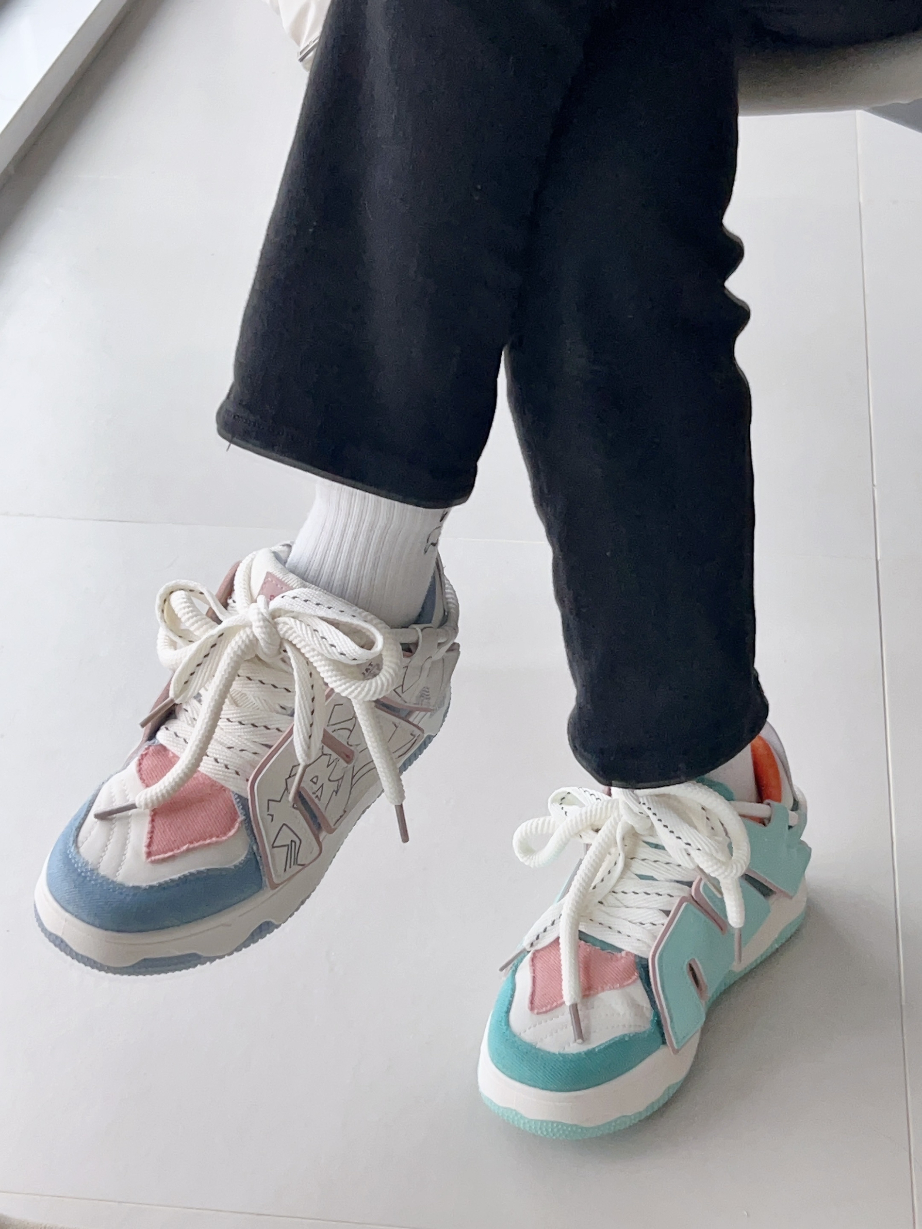 头一次尝试鸳鸯板鞋 我以前就觉得一只脚一个颜色挺奇怪的 但尝试之后…真香 出乎意料的好搭配 jiao感舒服,走路不会打脚 我喜欢鞋两边的字母设计 既有个性又好看
