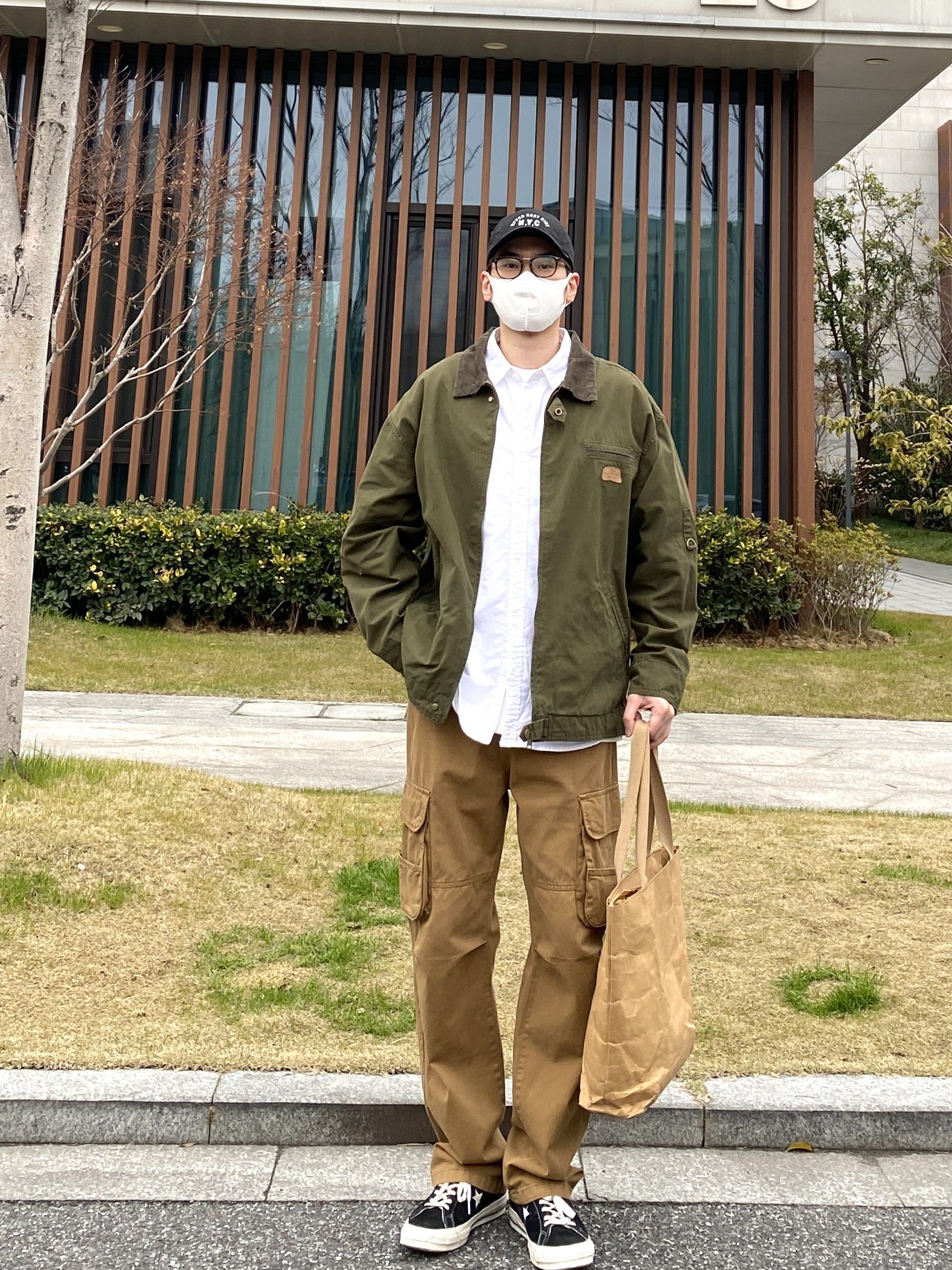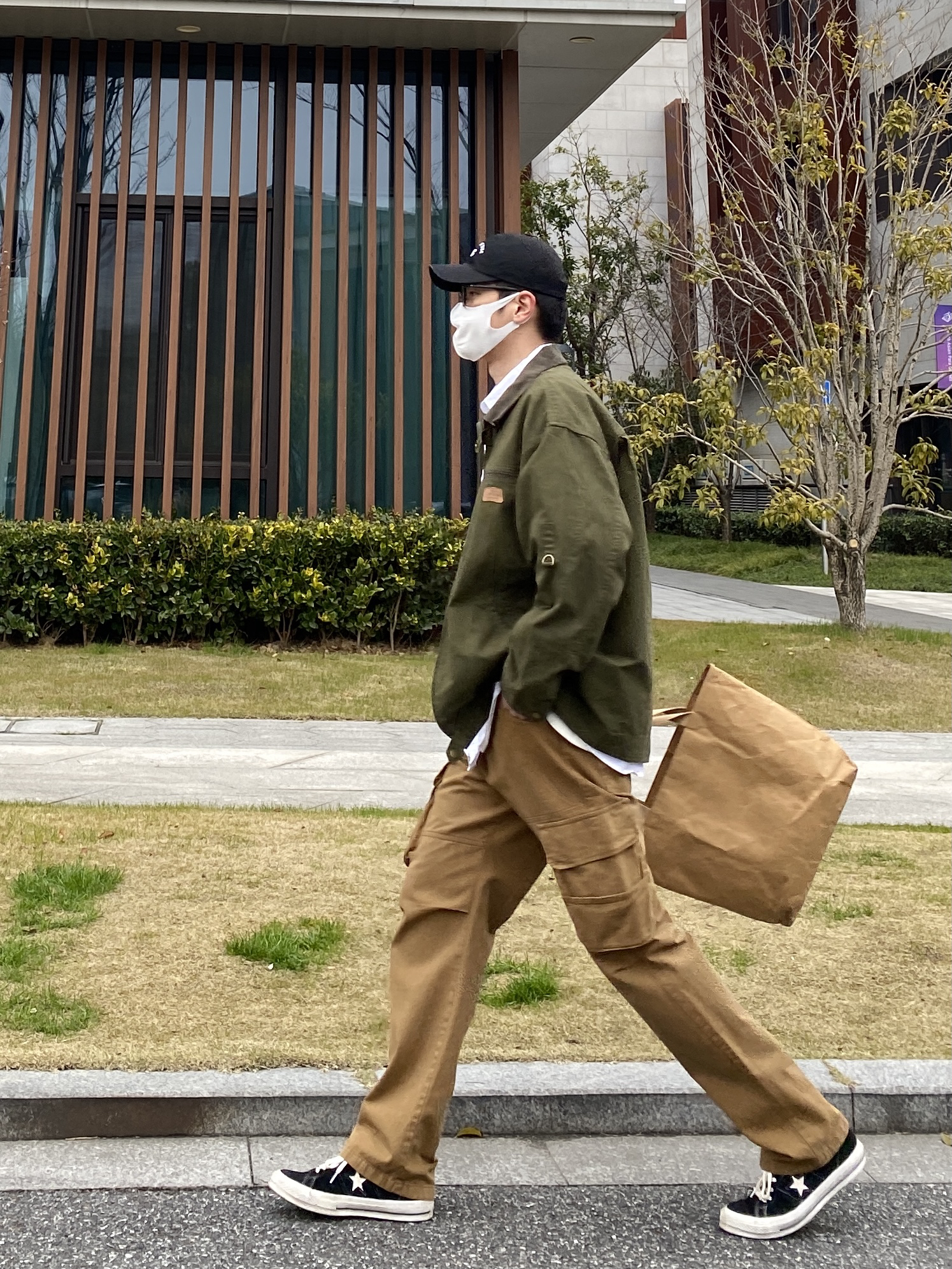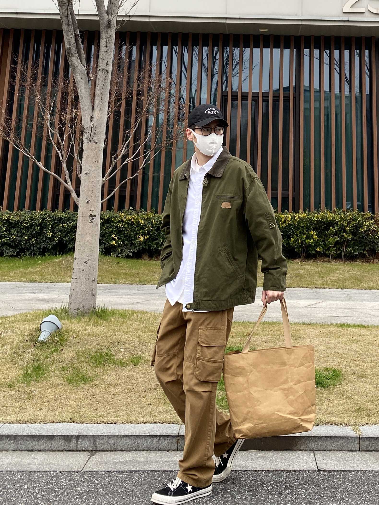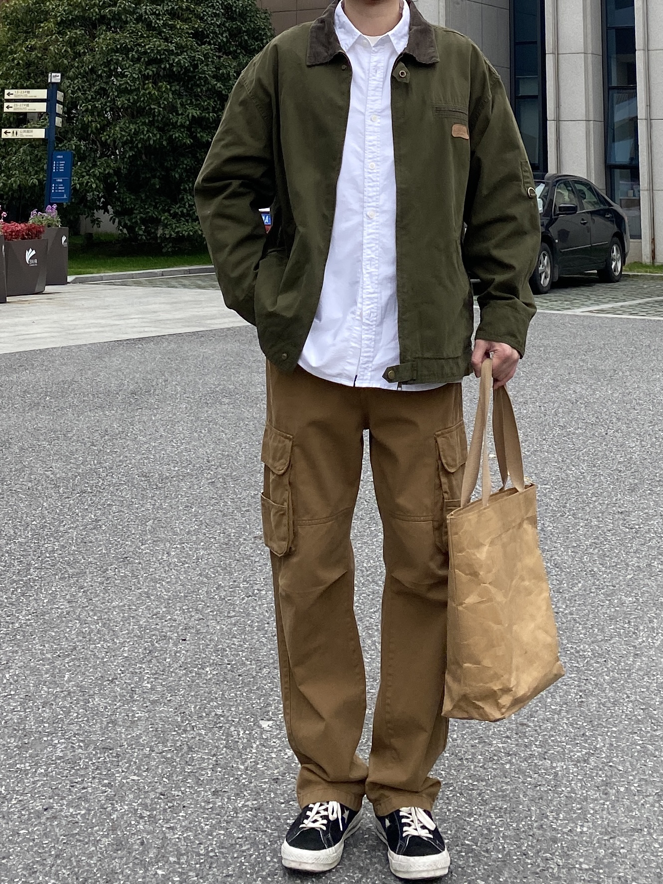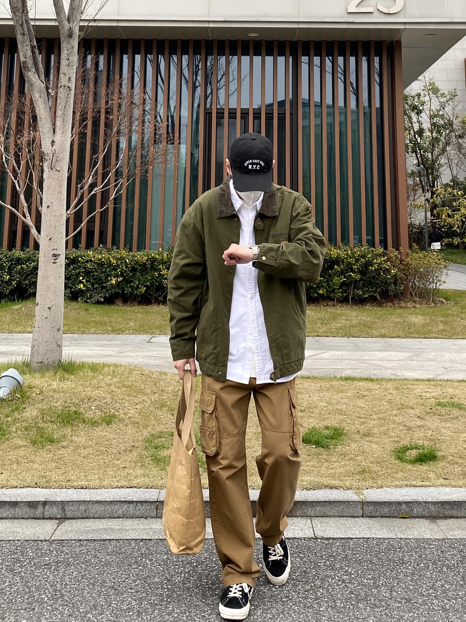 今天这套先用清爽干净的白衬衫做内搭,裤子选择不挑腿型的卡其色直筒做旧多口袋工装裤,鞋子上脚经典百搭的匡威one star,接着套上军绿色宽松阔版重磅复古翻领工装夹克,最后背一个油蜡帆布托特包,OK,出门看看搭配效果吧! - 今日穿搭 衣服裤子:NICE LILI 鞋子:匡威one star