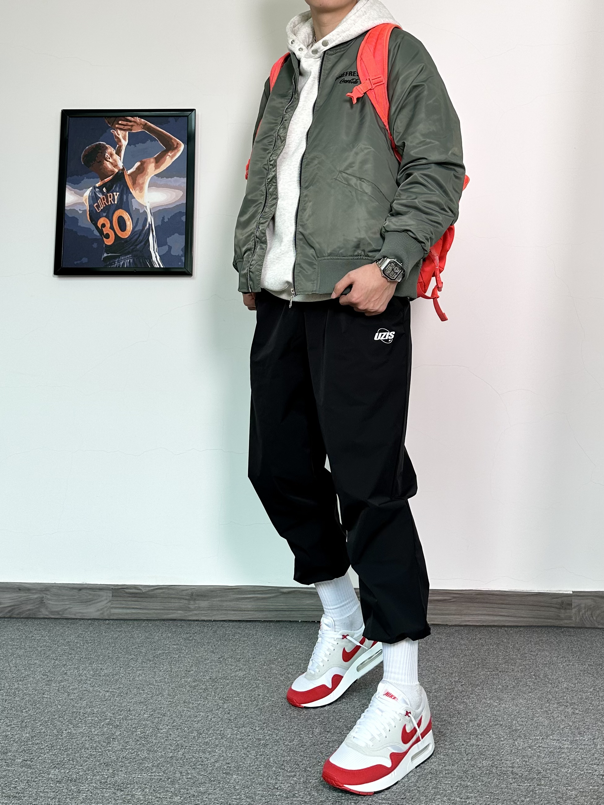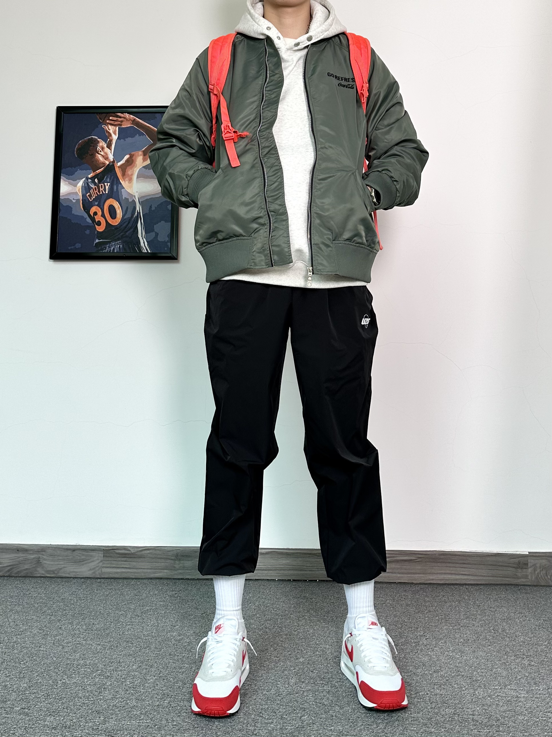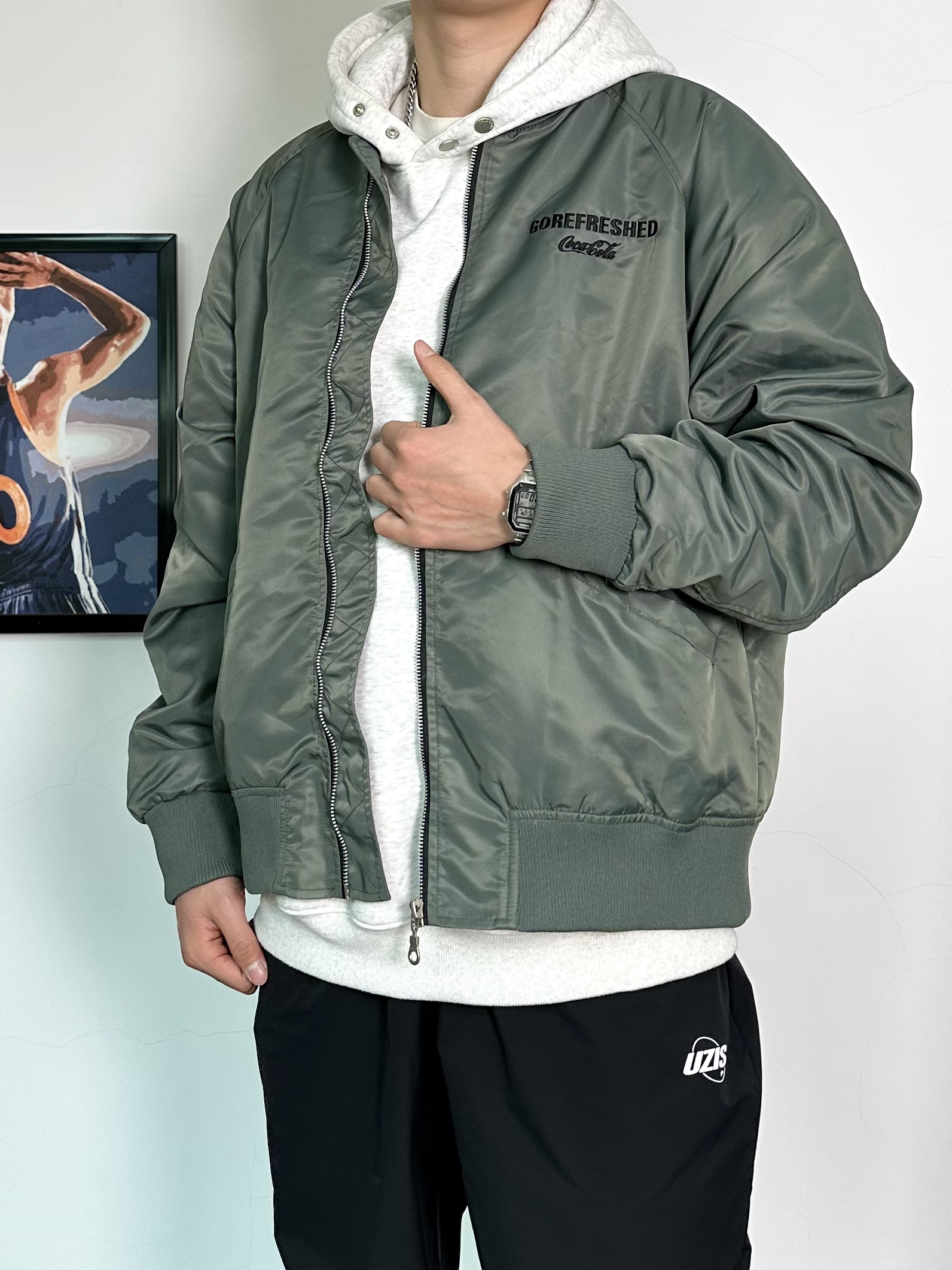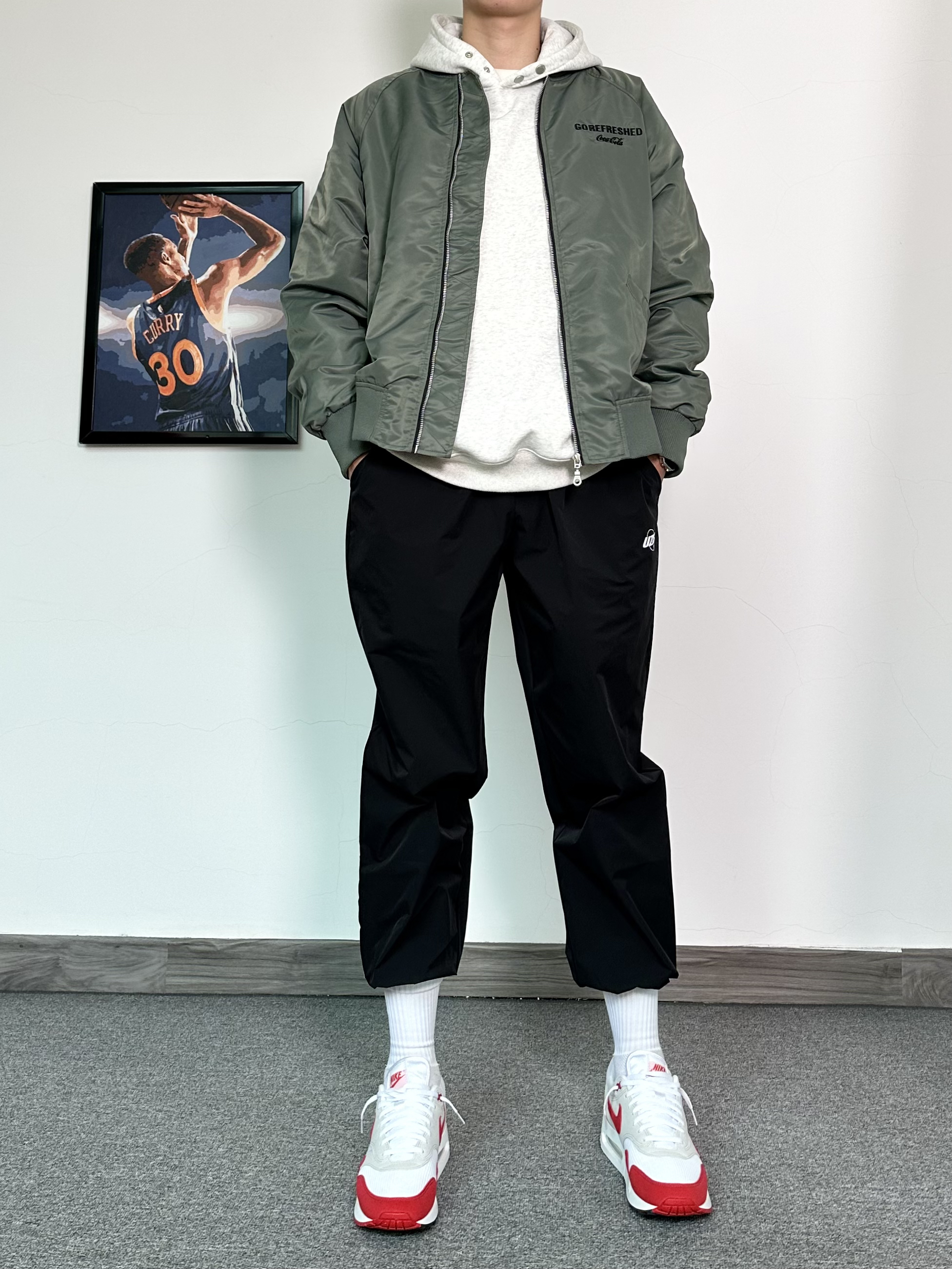 春季穿搭安排上! 上身一件军绿色的飞行夹克 内搭花灰色质感卫衣 黑色束脚卫裤安排上,运动风十足 最后再穿上一双白色配色复古运动鞋 这个配色很适合春季穿 整体穿搭层次感满满!