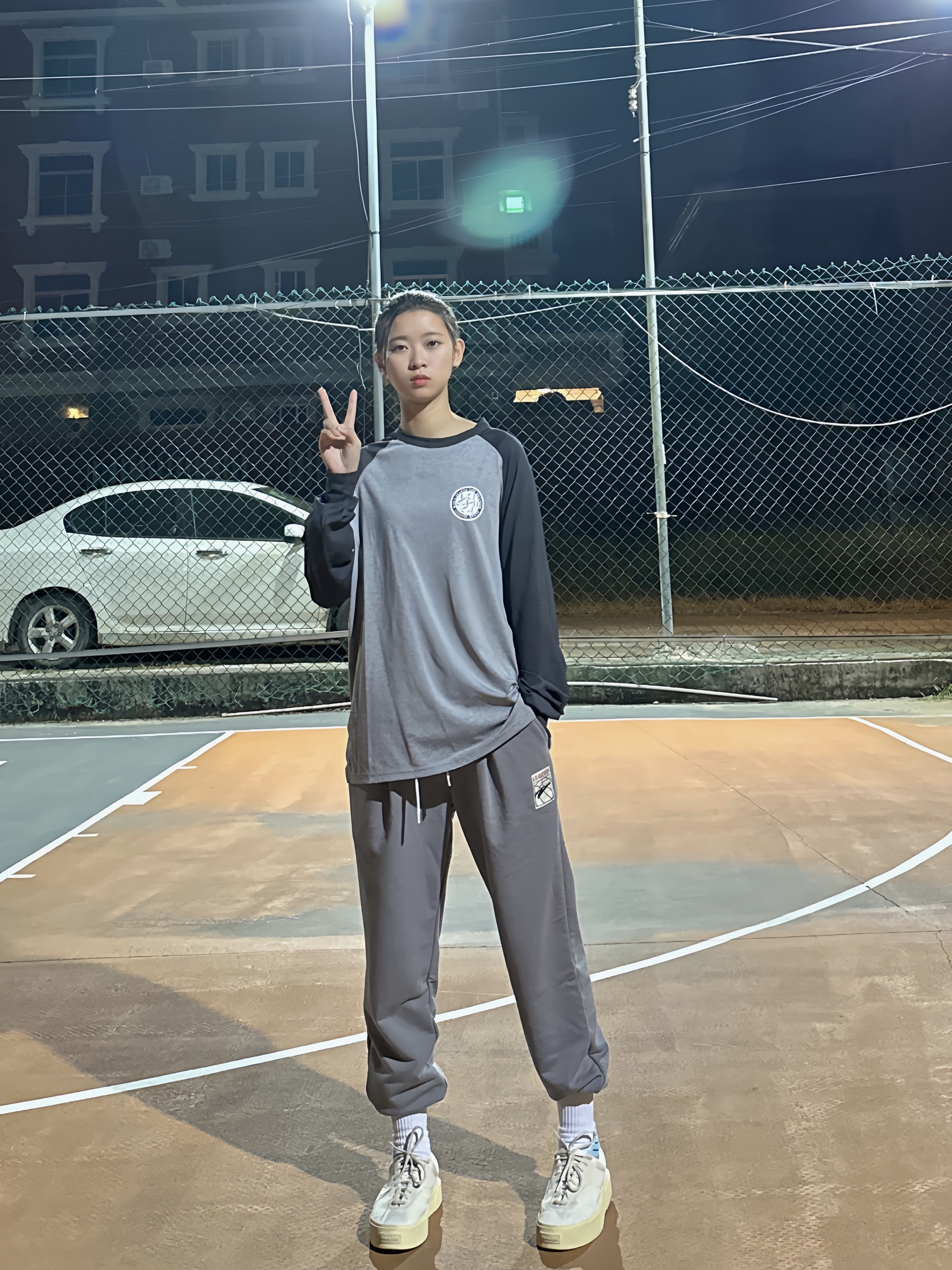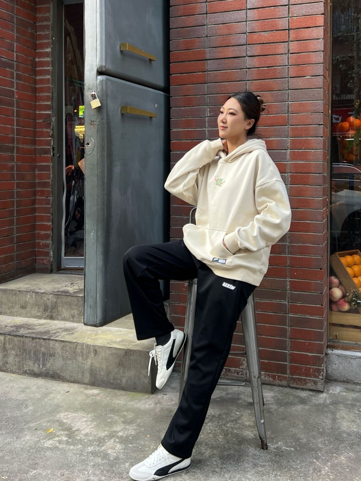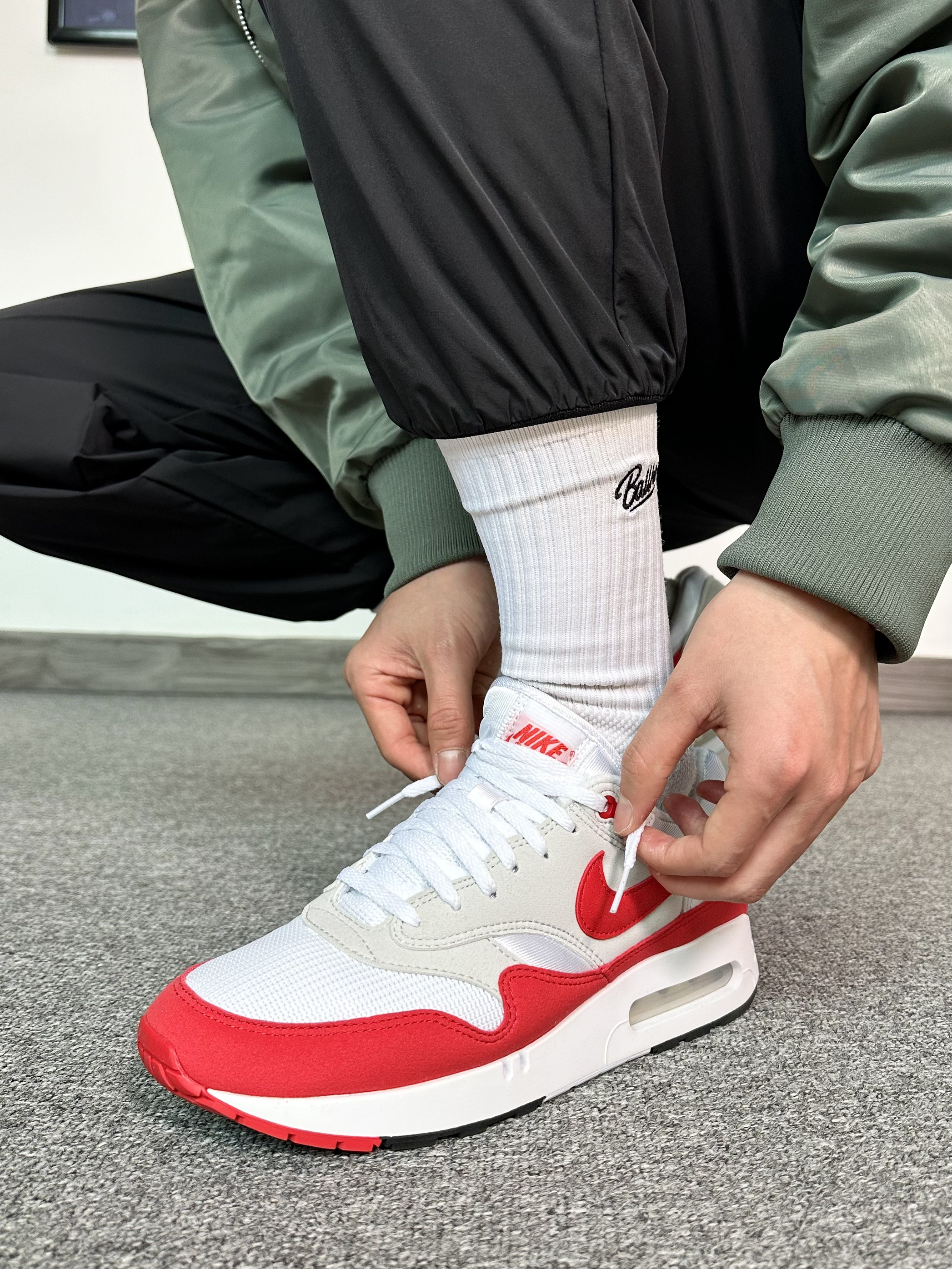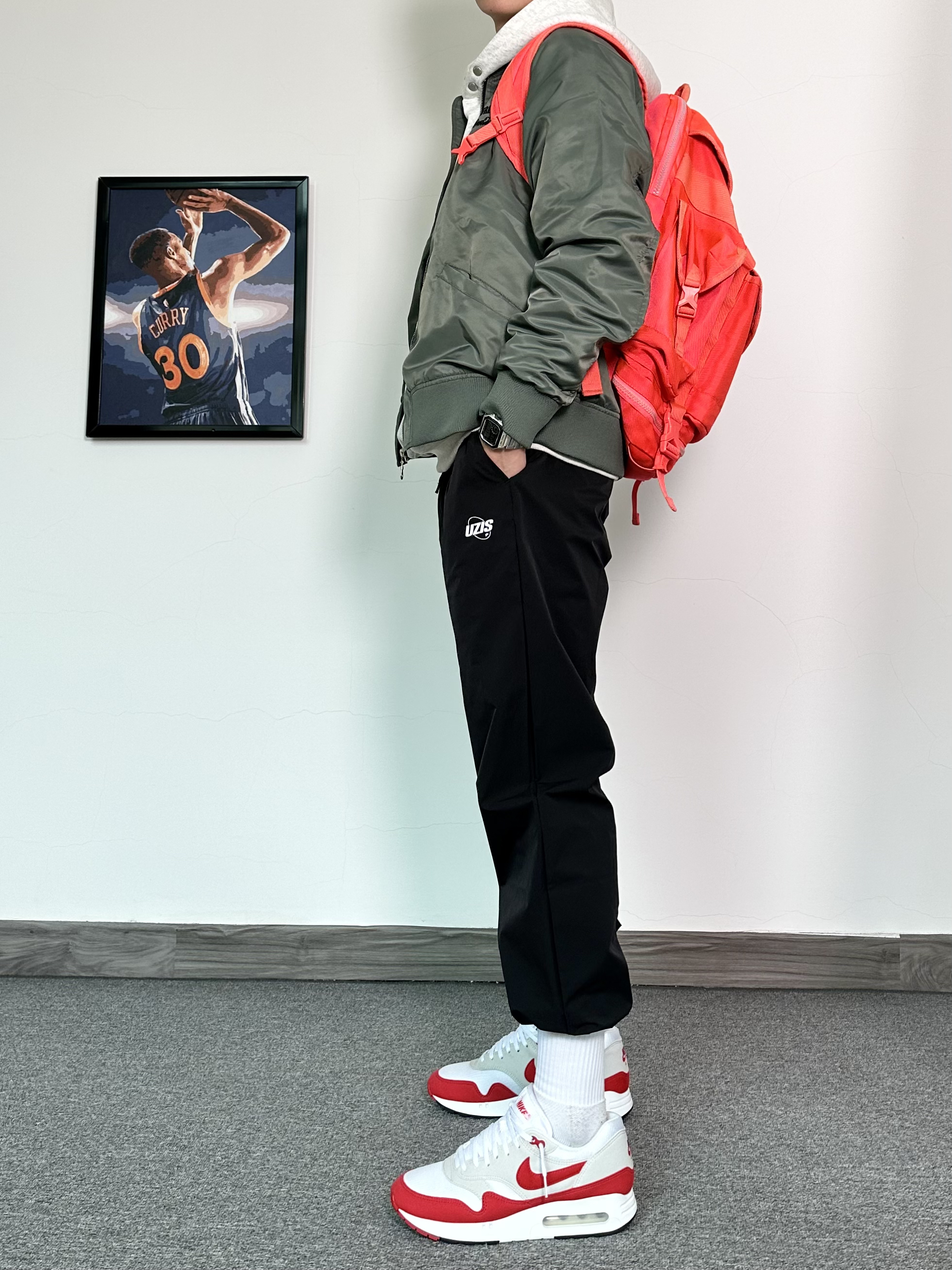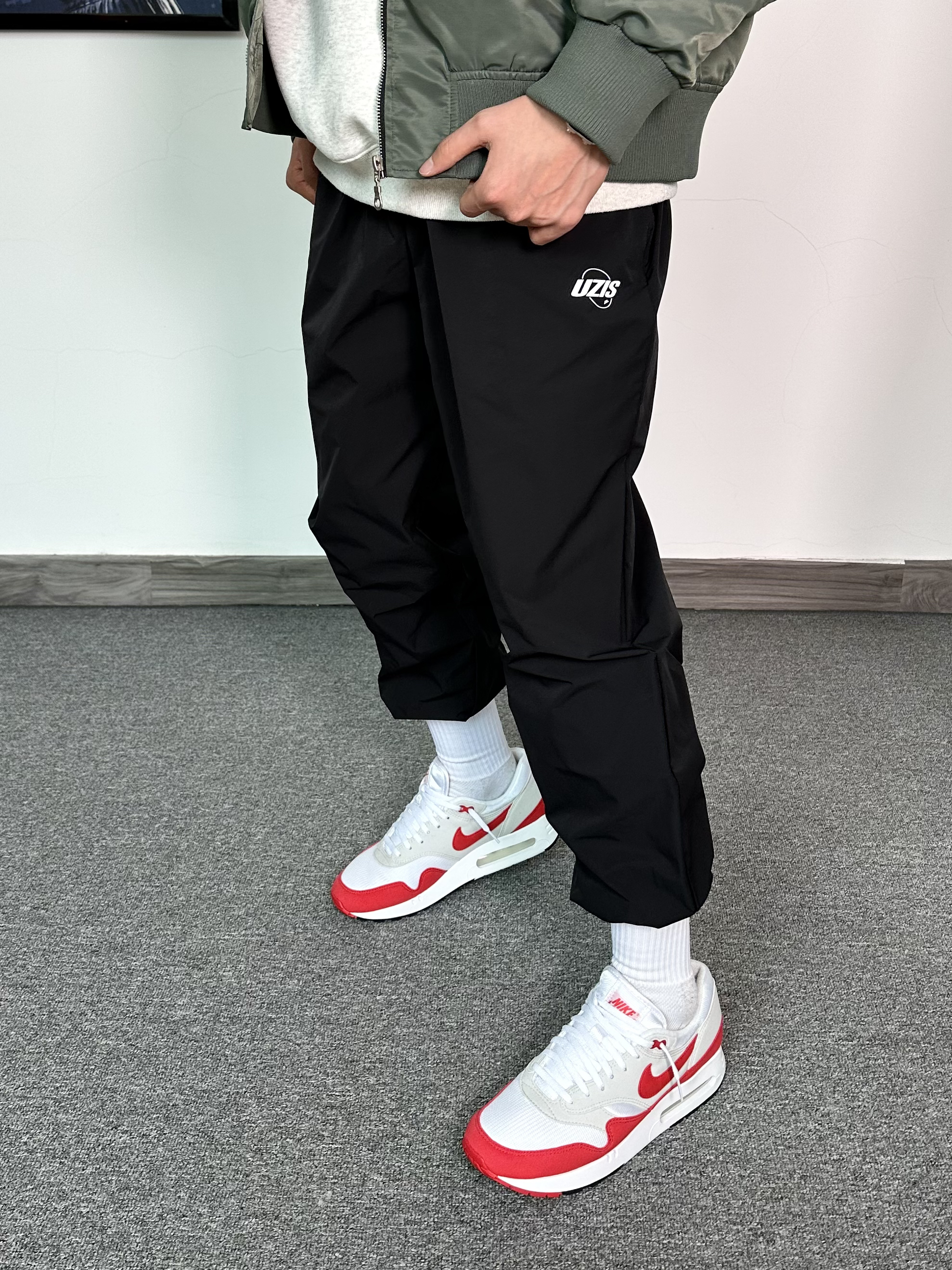春季穿搭安排上! 上身一件军绿色的飞行夹克 内搭花灰色质感卫衣 黑色束脚卫裤安排上,运动风十足 最后再穿上一双白色配色复古运动鞋 这个配色很适合春季穿 整体穿搭层次感满满!