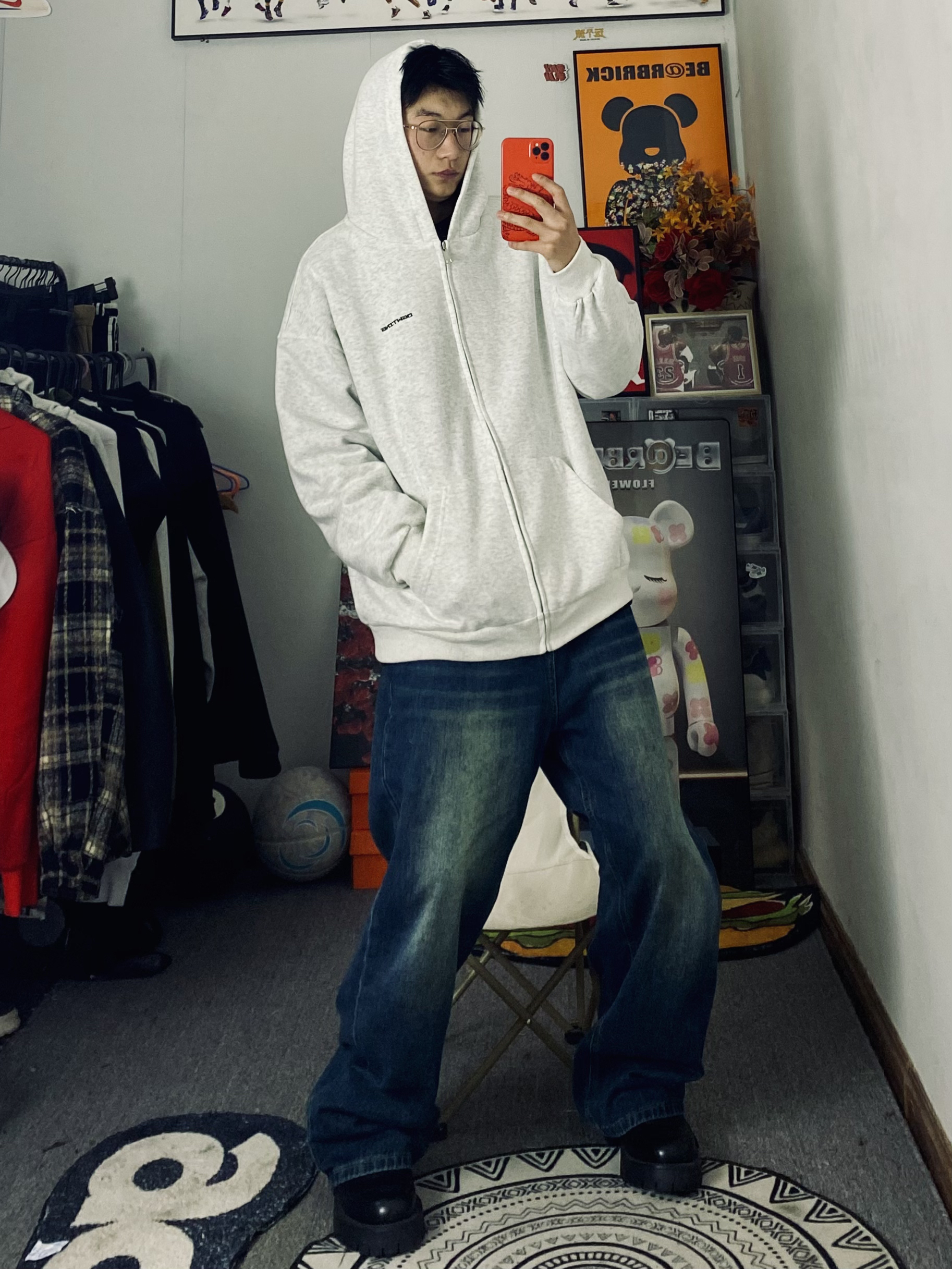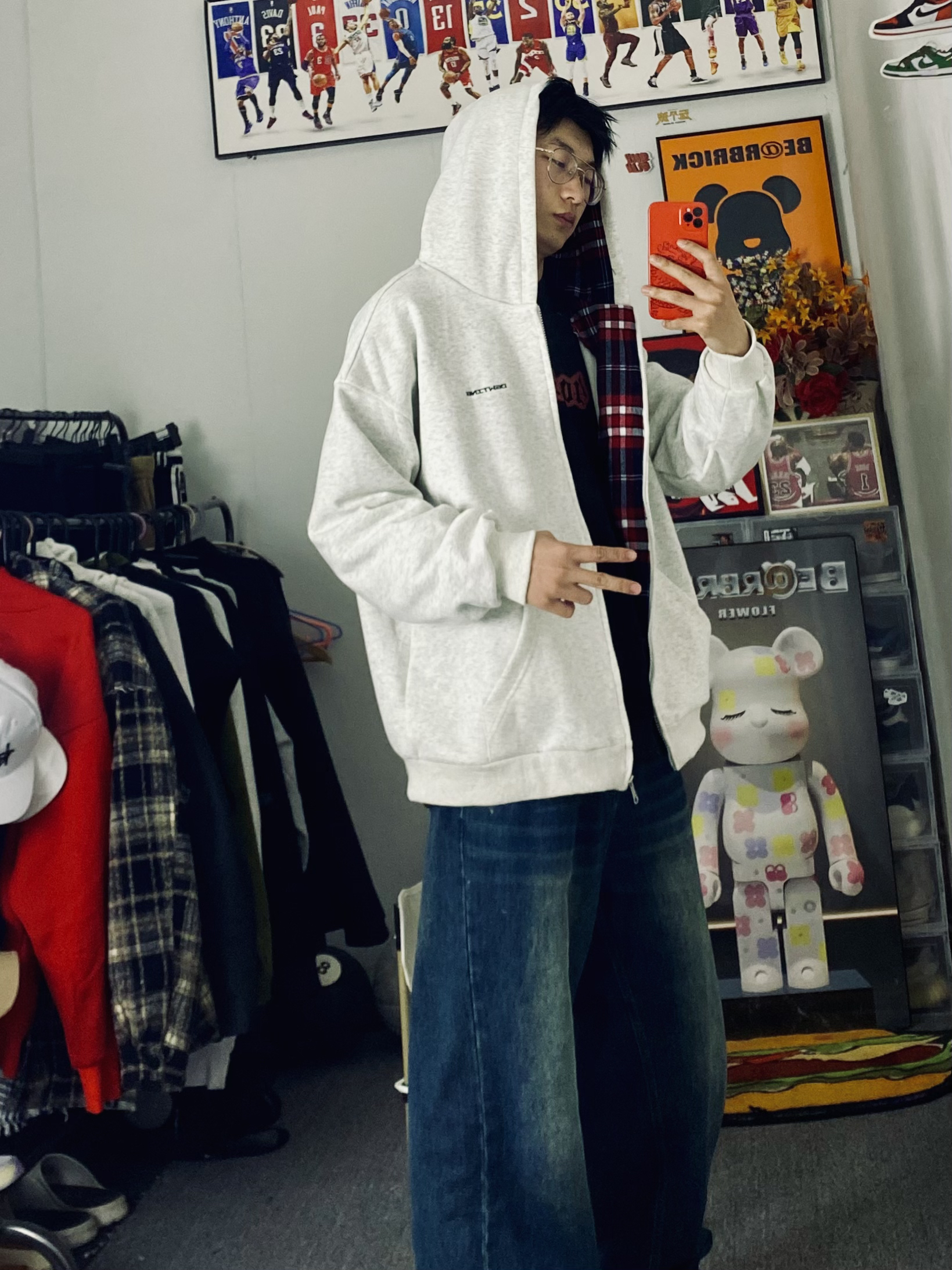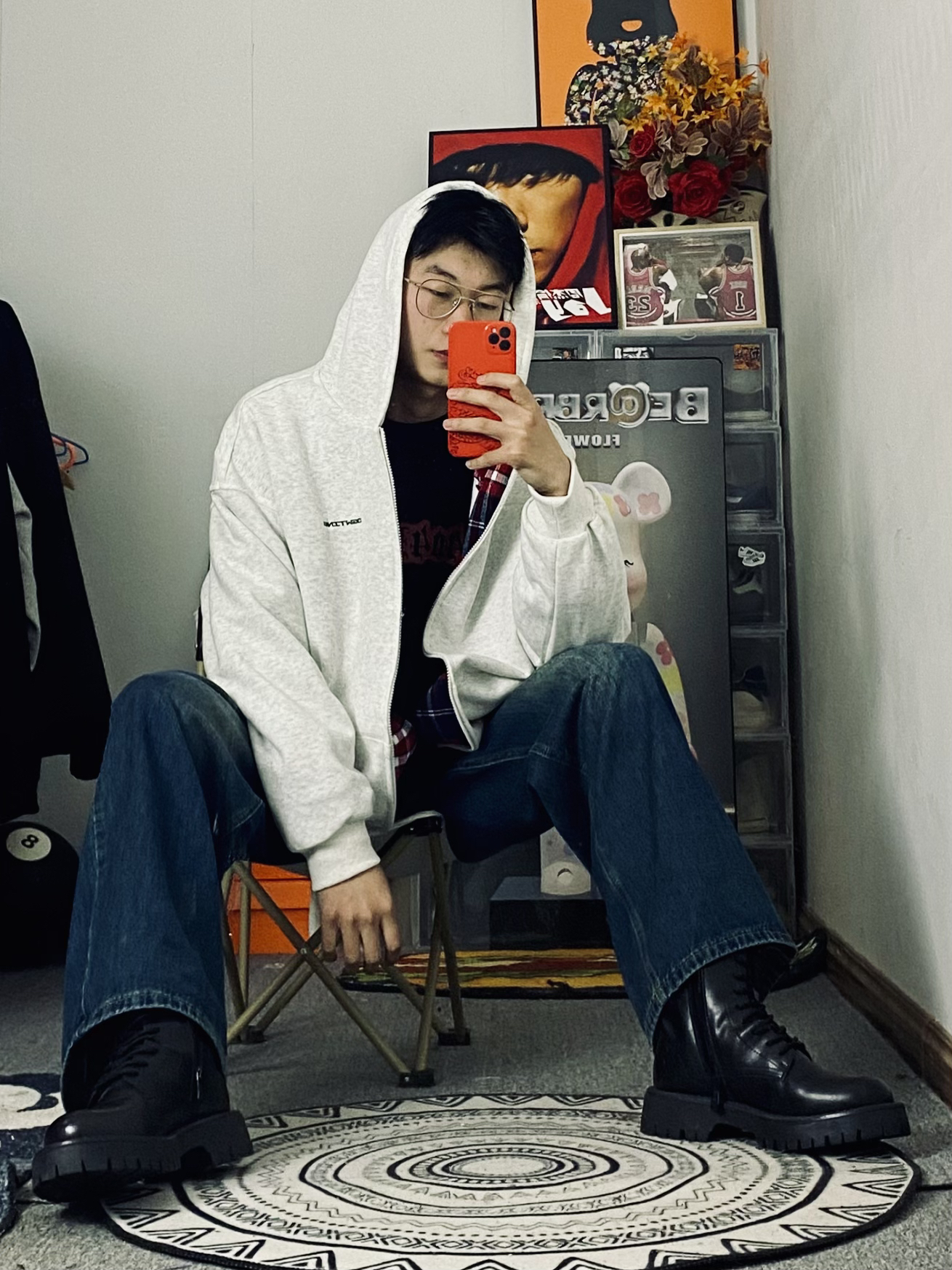 冰今日穿搭‼️ 👔衣服穿了一件偏日式复古风的开衫卫衣 中性设计 宽松的版型 风格偏慵懒 🐝 面料整体摸起来也比较舒适💤 — 👖裤子是一条宽松直筒牛仔裤😊‼️ 宽松的版型对腿型会起到一个很好的修饰作用 — 👟鞋子就是搭配了一双黑色高帮马丁靴 经典耐看😍 — 身高178体重130斤 衣服裤子选择的都是xl