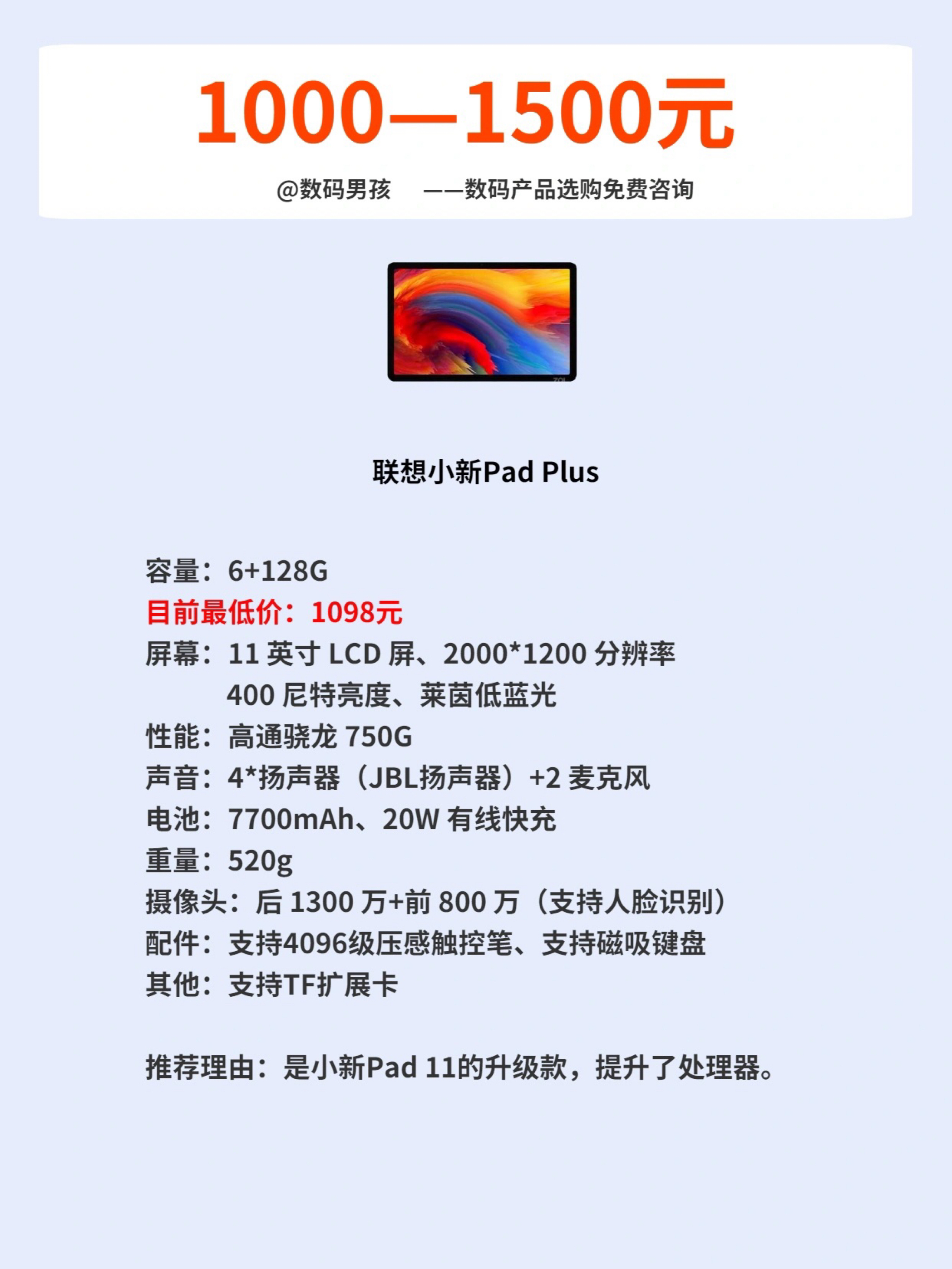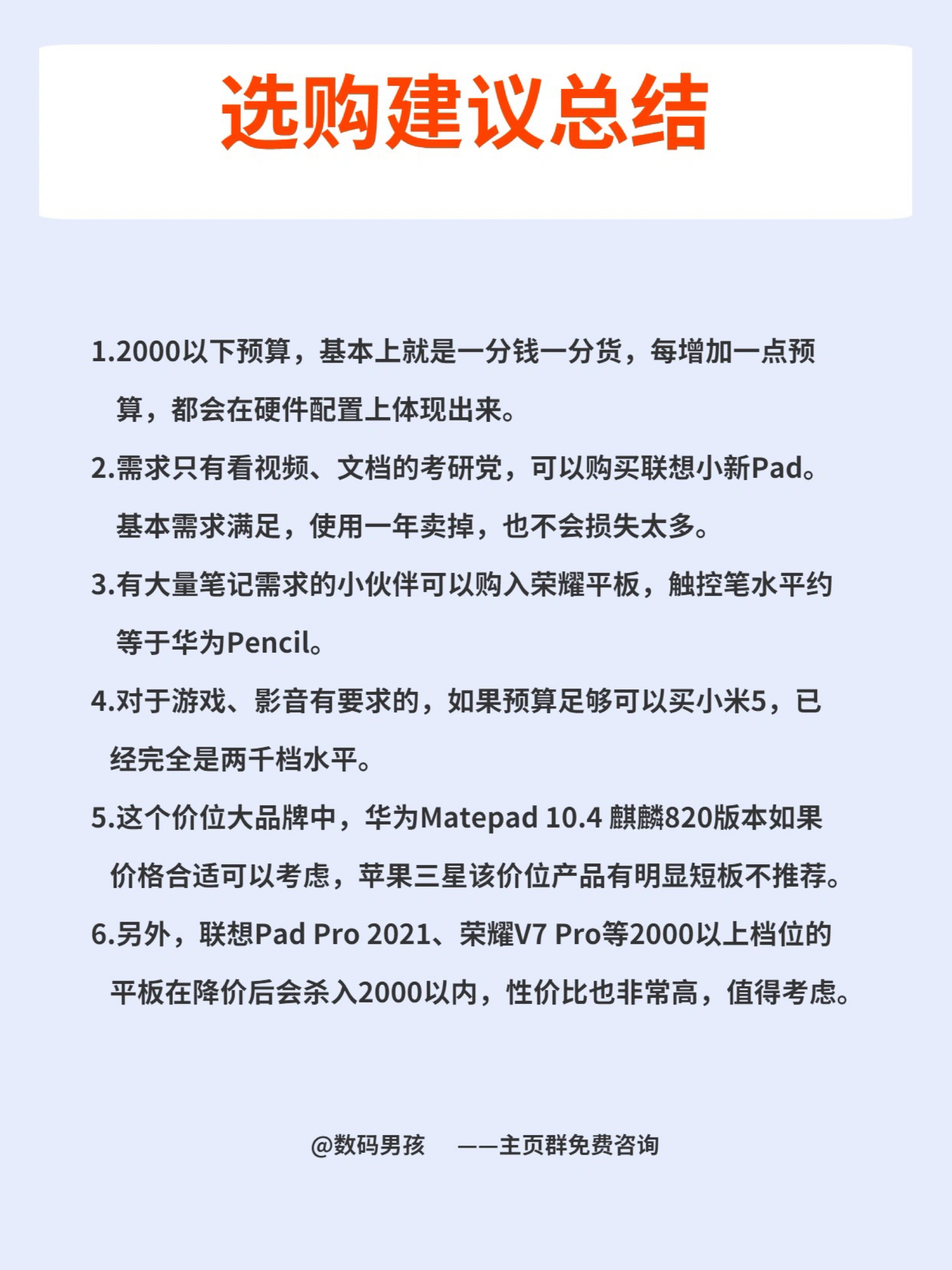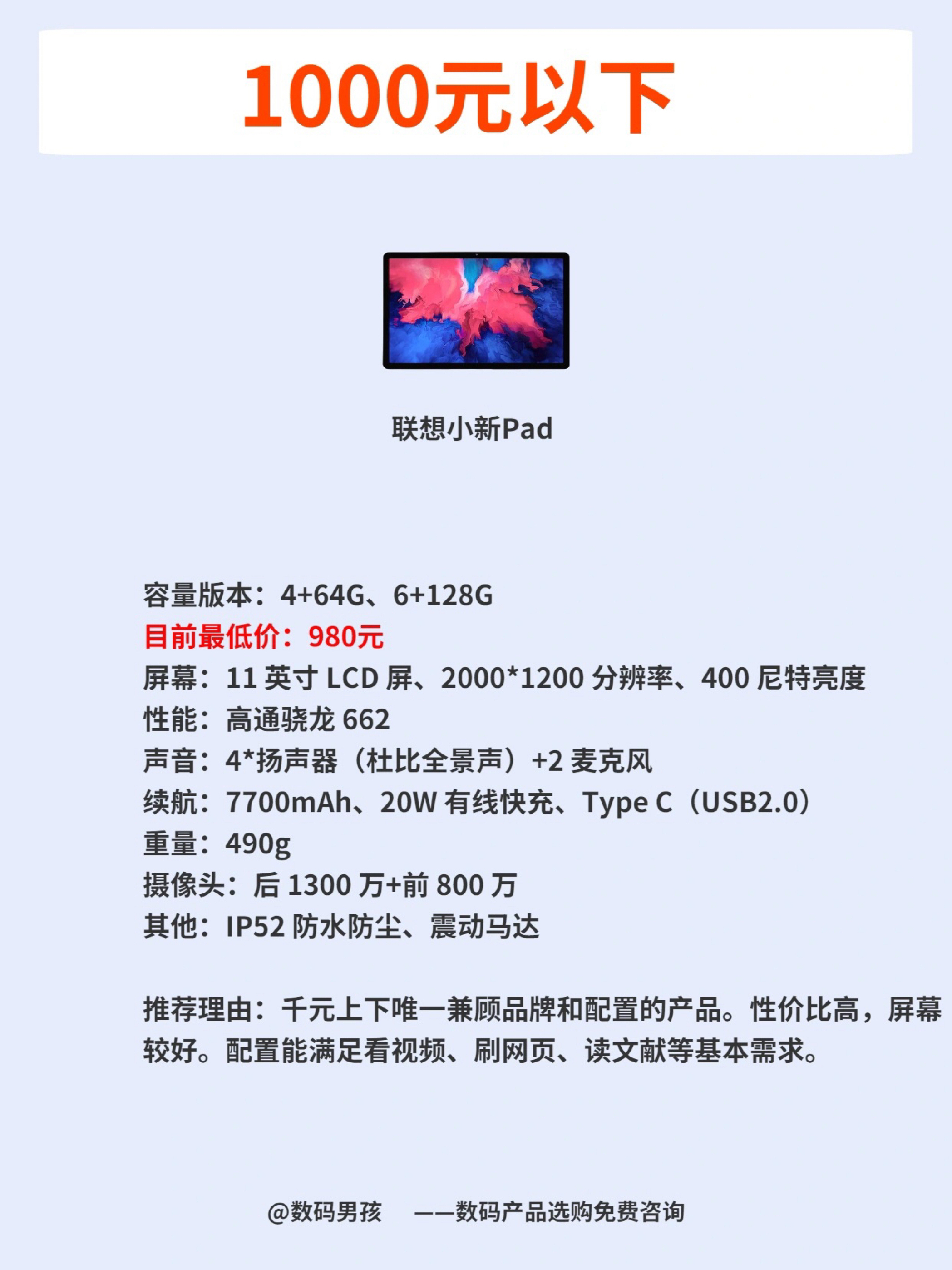 随着各家厂商加入平板电脑的竞争, 平板的选择也越来越多。 目前看1000到3000价位平板的竞争是最激烈的, 上一期我们讲了2000到3000价位,今天我来给大家推荐一下2000一下的。 这个价位的平板基本上都是一分钱一分货,适合价格预算有限的便宜购买,大家可以根据自己的实际需求选择。 具体介绍可以看图片。 我是数码男孩,一个10年数码迷,可以给大家解答数码产品选购
