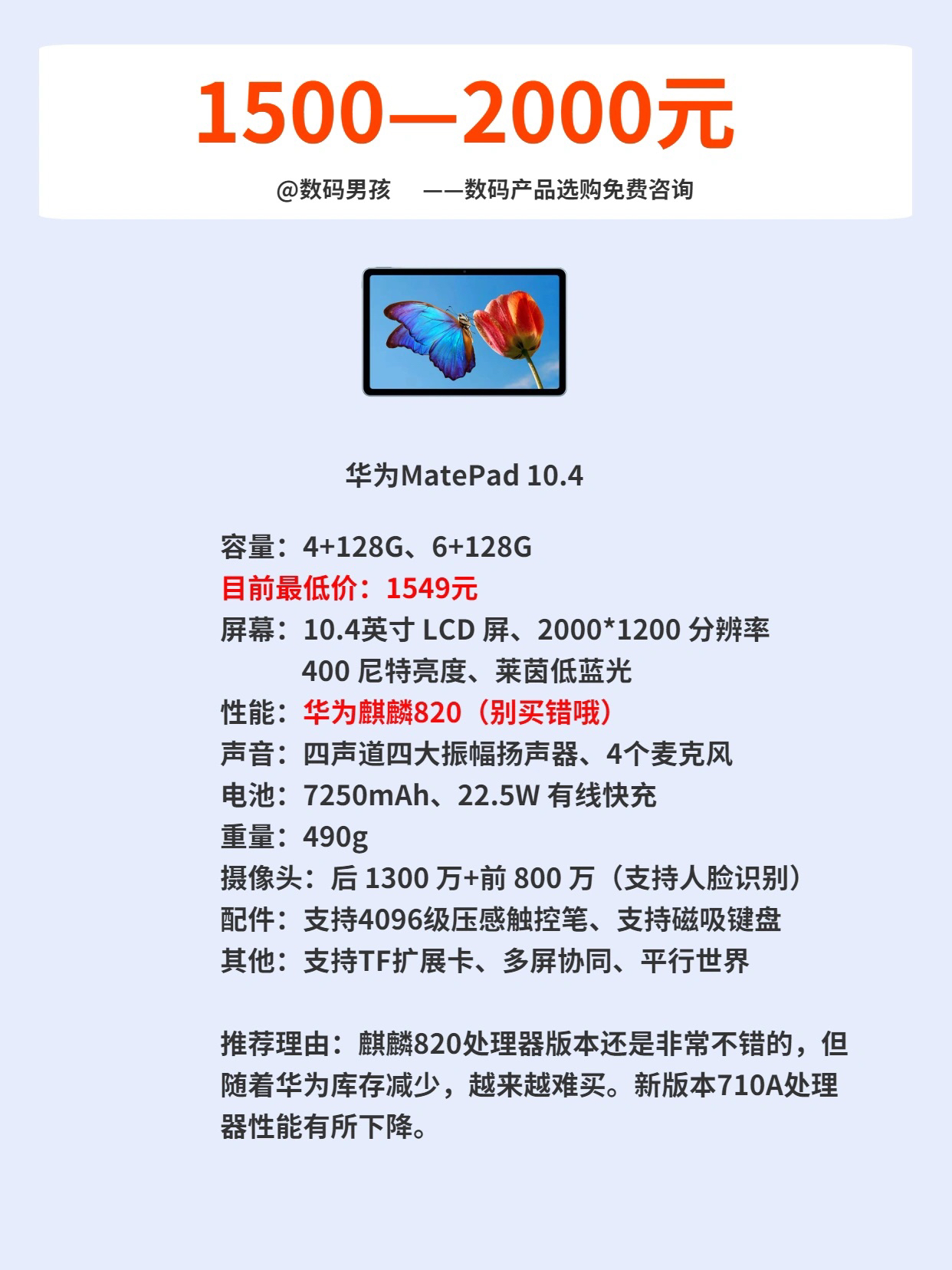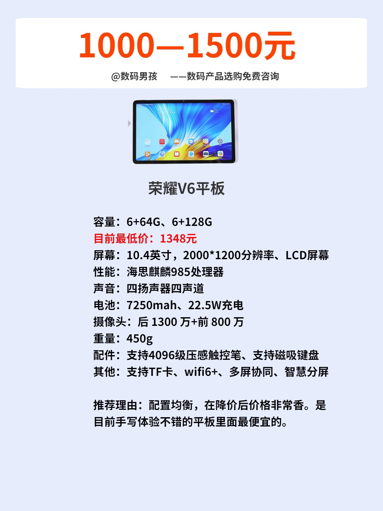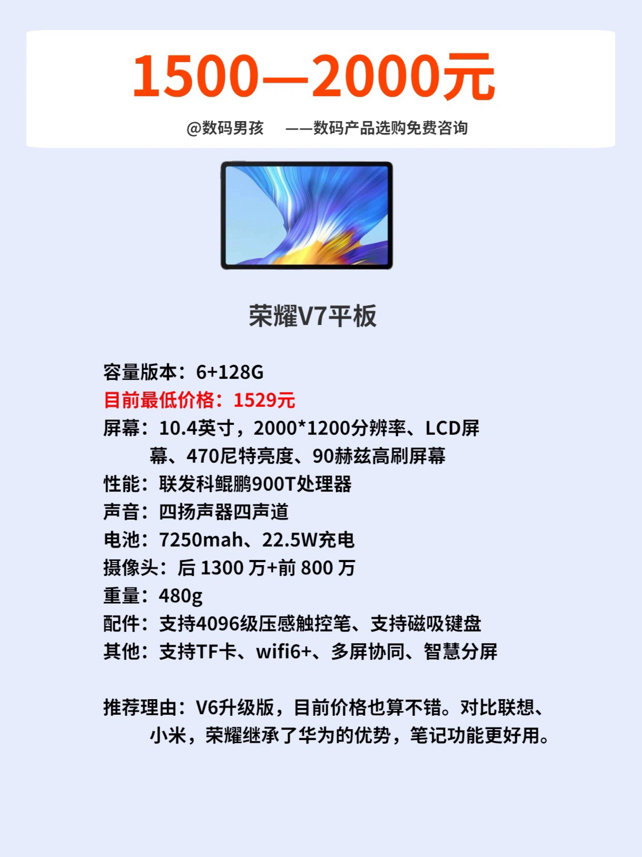 随着各家厂商加入平板电脑的竞争, 平板的选择也越来越多。 目前看1000到3000价位平板的竞争是最激烈的, 上一期我们讲了2000到3000价位,今天我来给大家推荐一下2000一下的。 这个价位的平板基本上都是一分钱一分货,适合价格预算有限的便宜购买,大家可以根据自己的实际需求选择。 具体介绍可以看图片。 我是数码男孩,一个10年数码迷,可以给大家解答数码产品选购