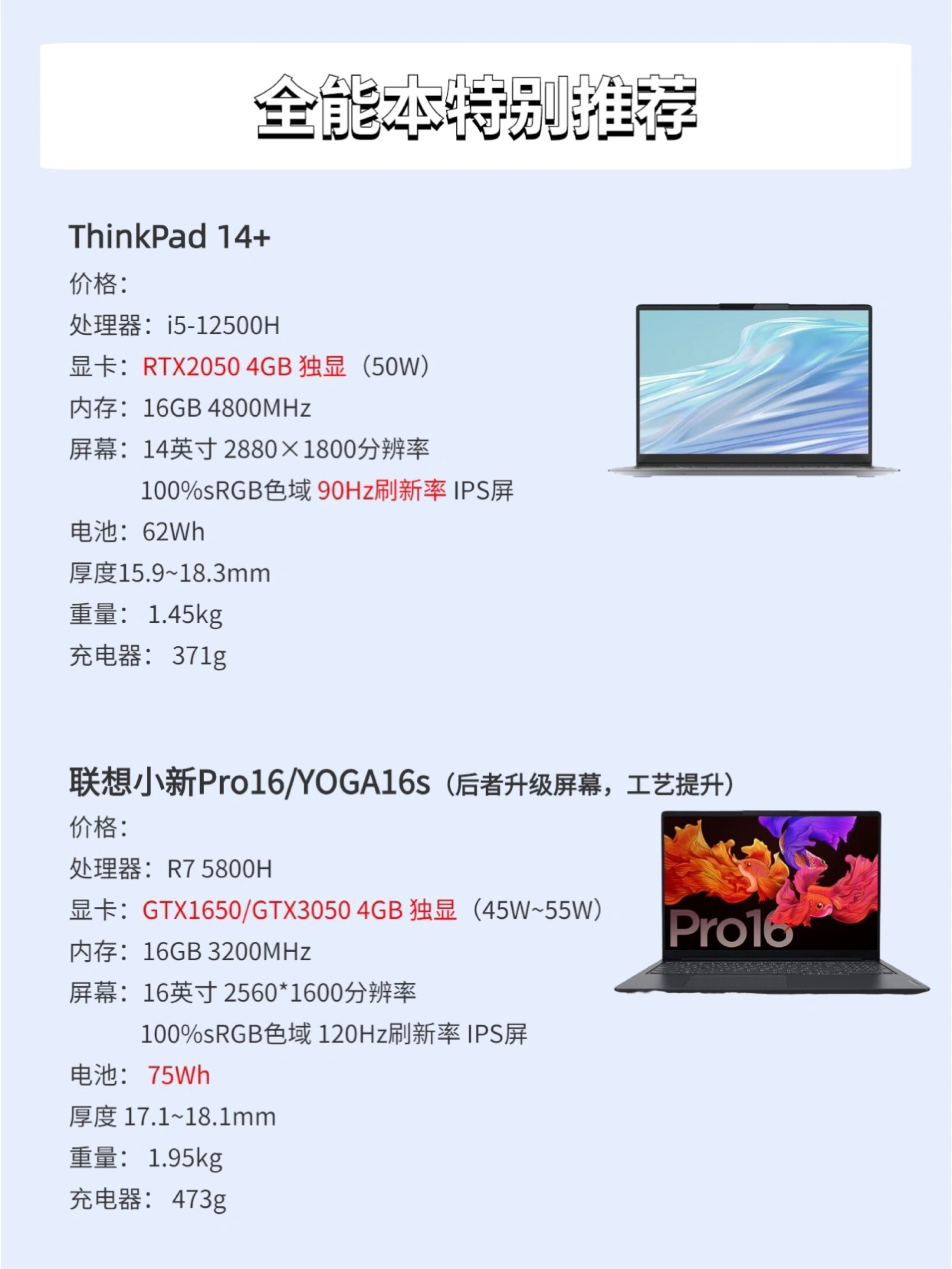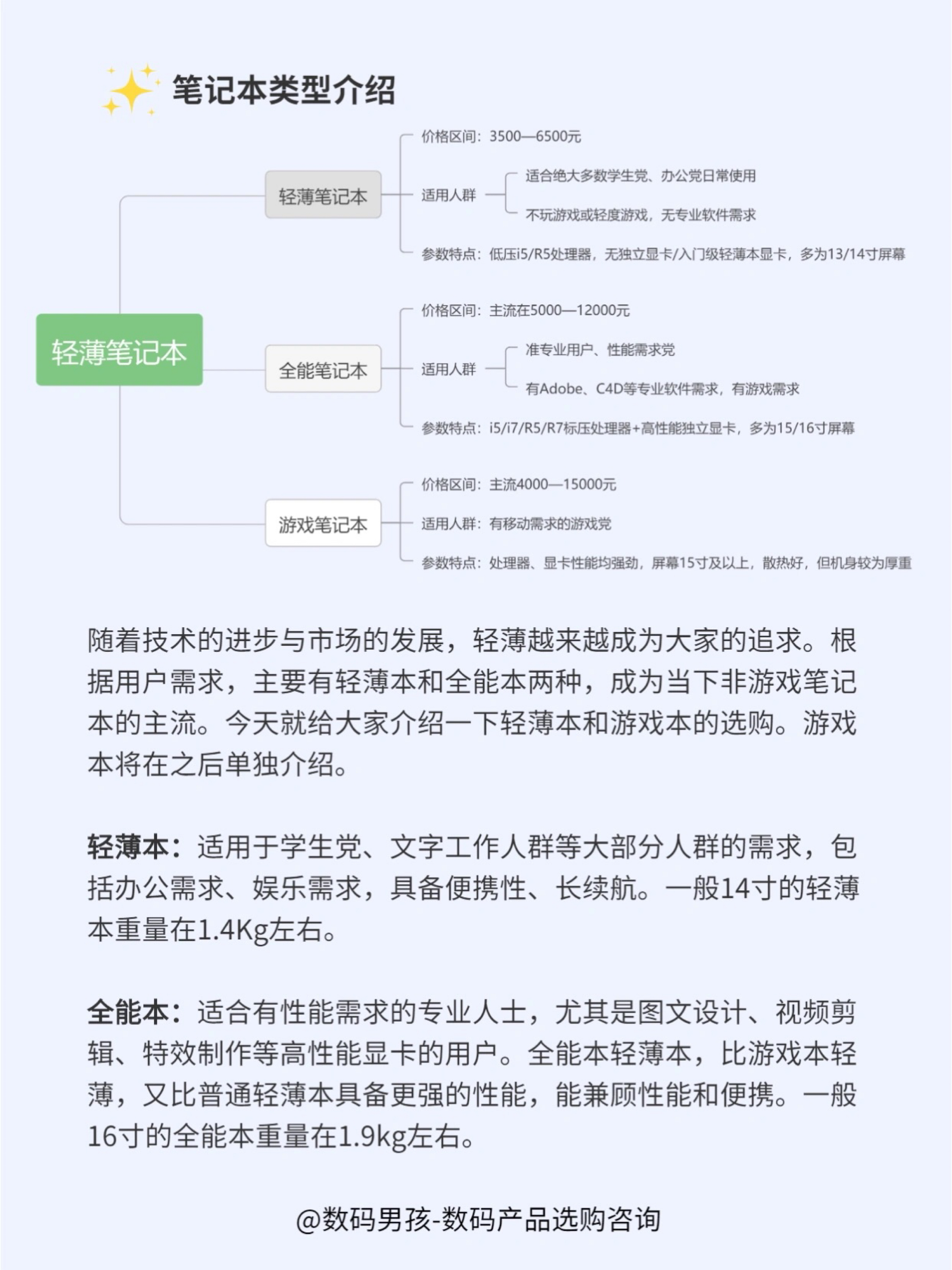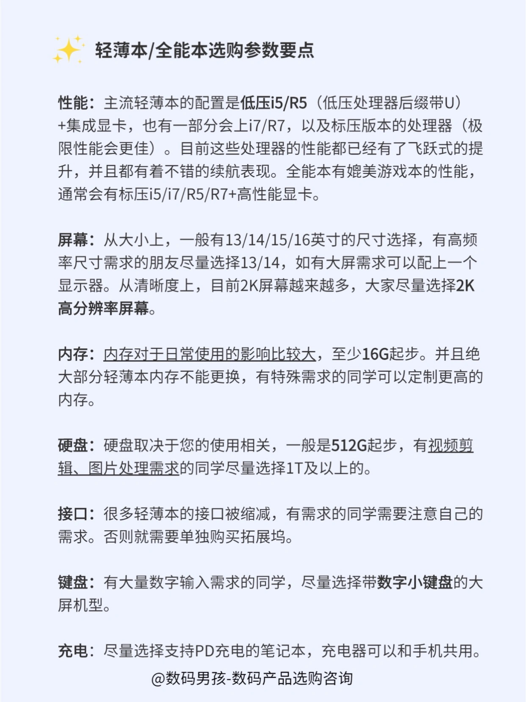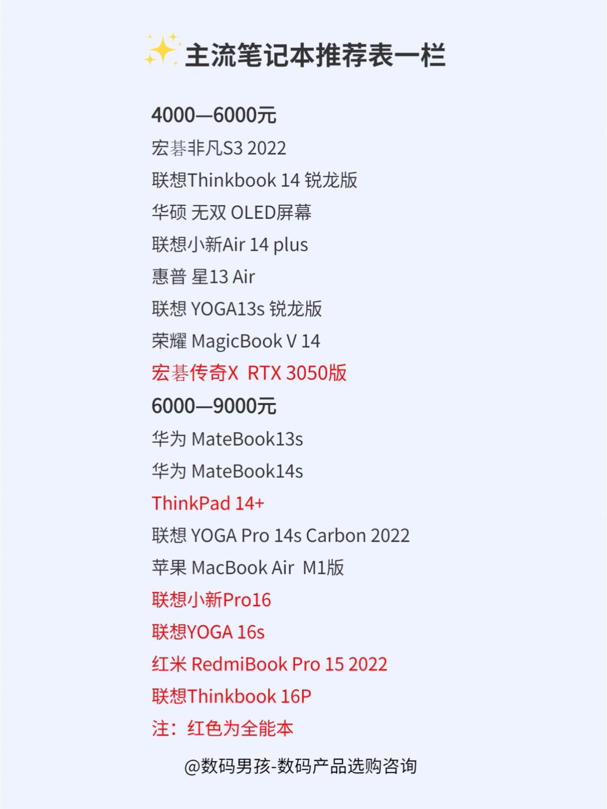 大家好这里是数码男孩,一个10年数码控,今天给大家出一篇笔记本(包括轻薄本、全能本),适合90%以上的人群需求。 轻薄本:轻薄便携,性能满足日常使用,续航强,颜值高。适合学生党、办公党、出差党。 全能本:在兼顾满足专业性能的基础上,比游戏本更轻薄、好看。适合视频剪辑、特效制作、3d建模等专业需求用户。 ✨✨ 具体推荐可以看图,大家有什么问题也可以随时问。