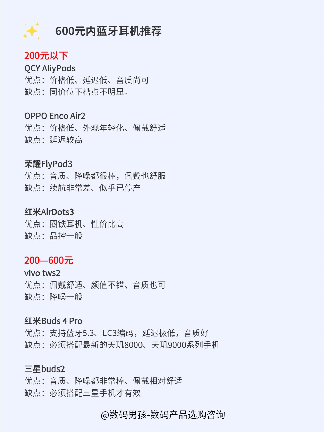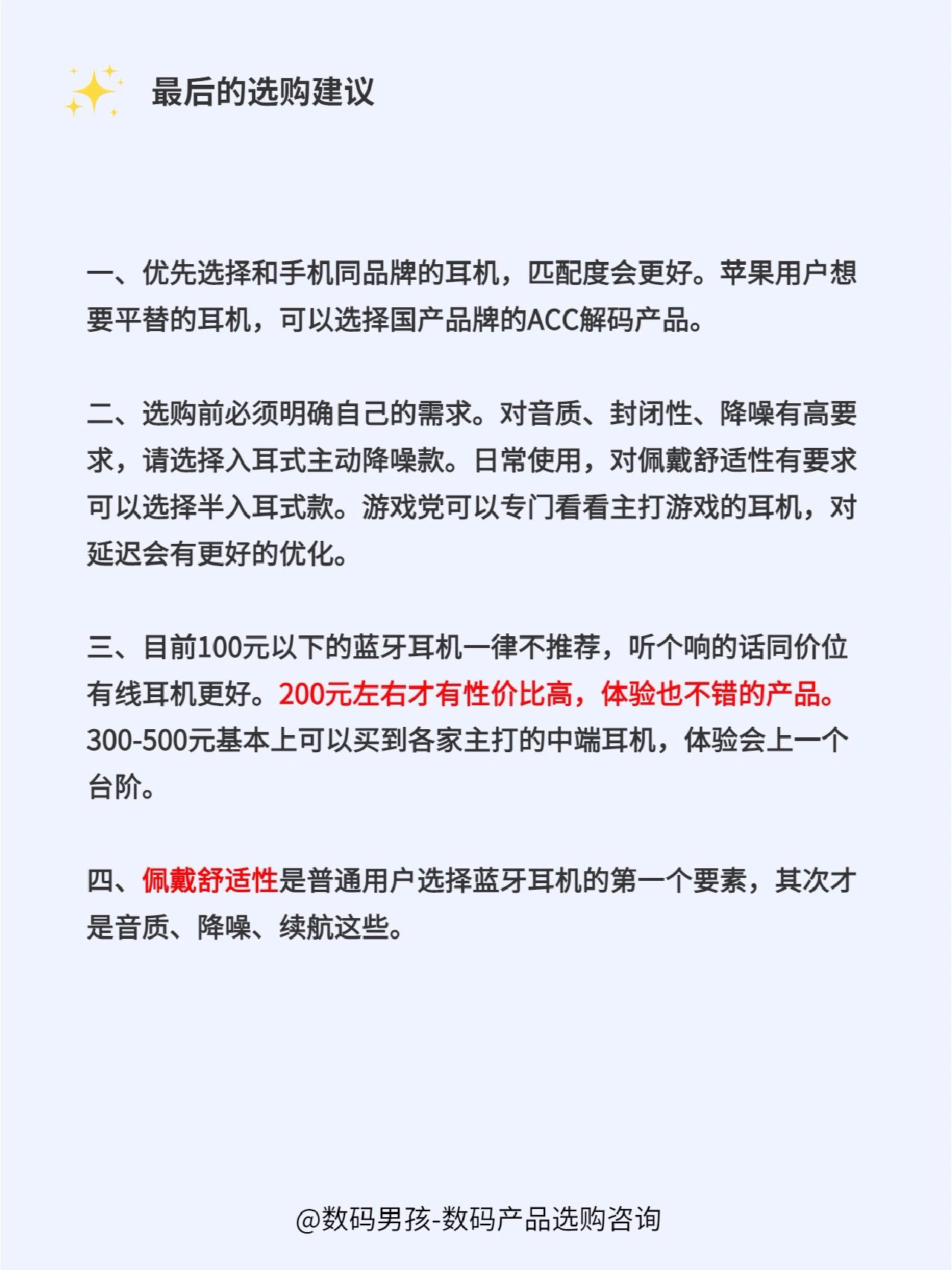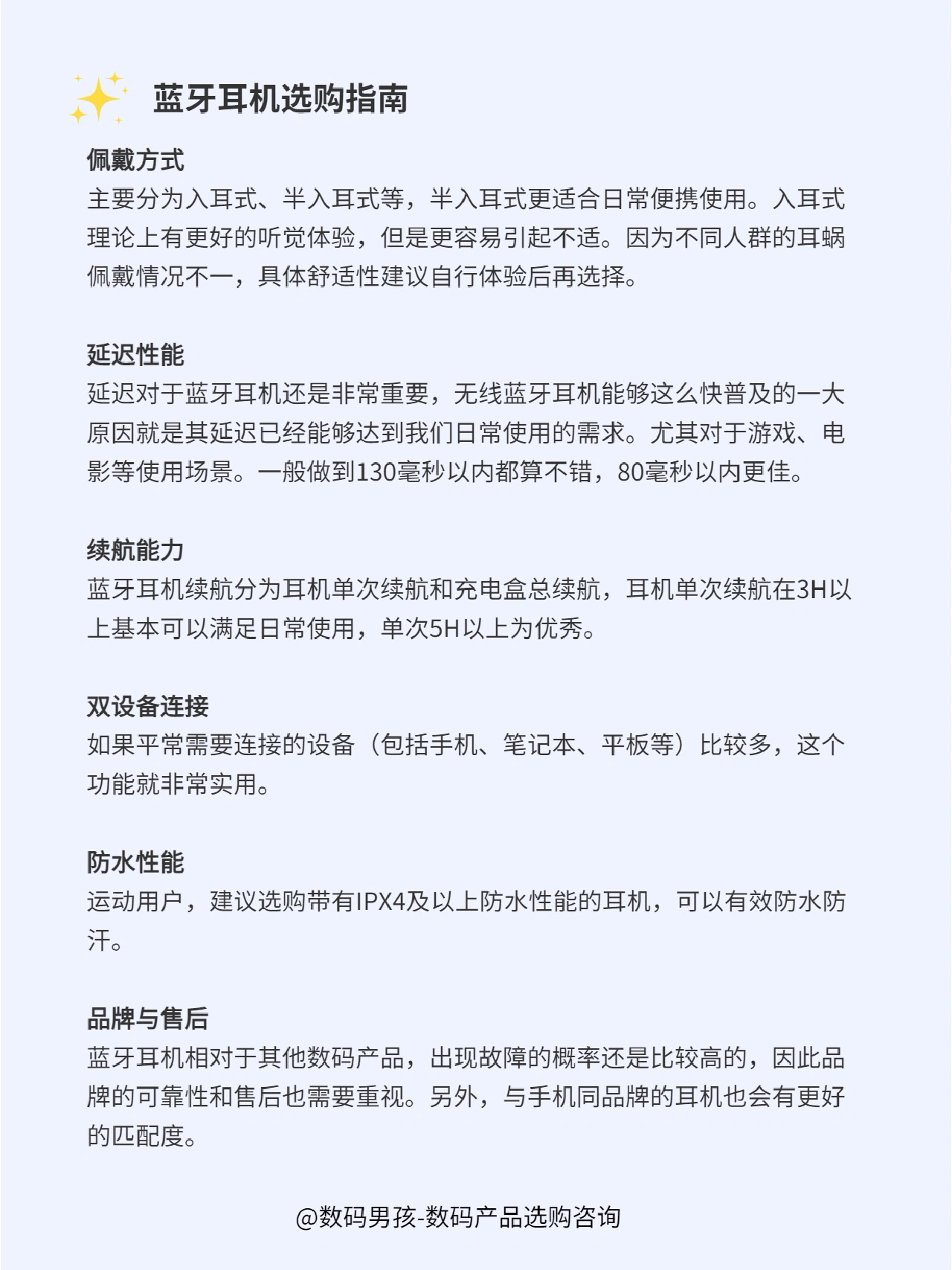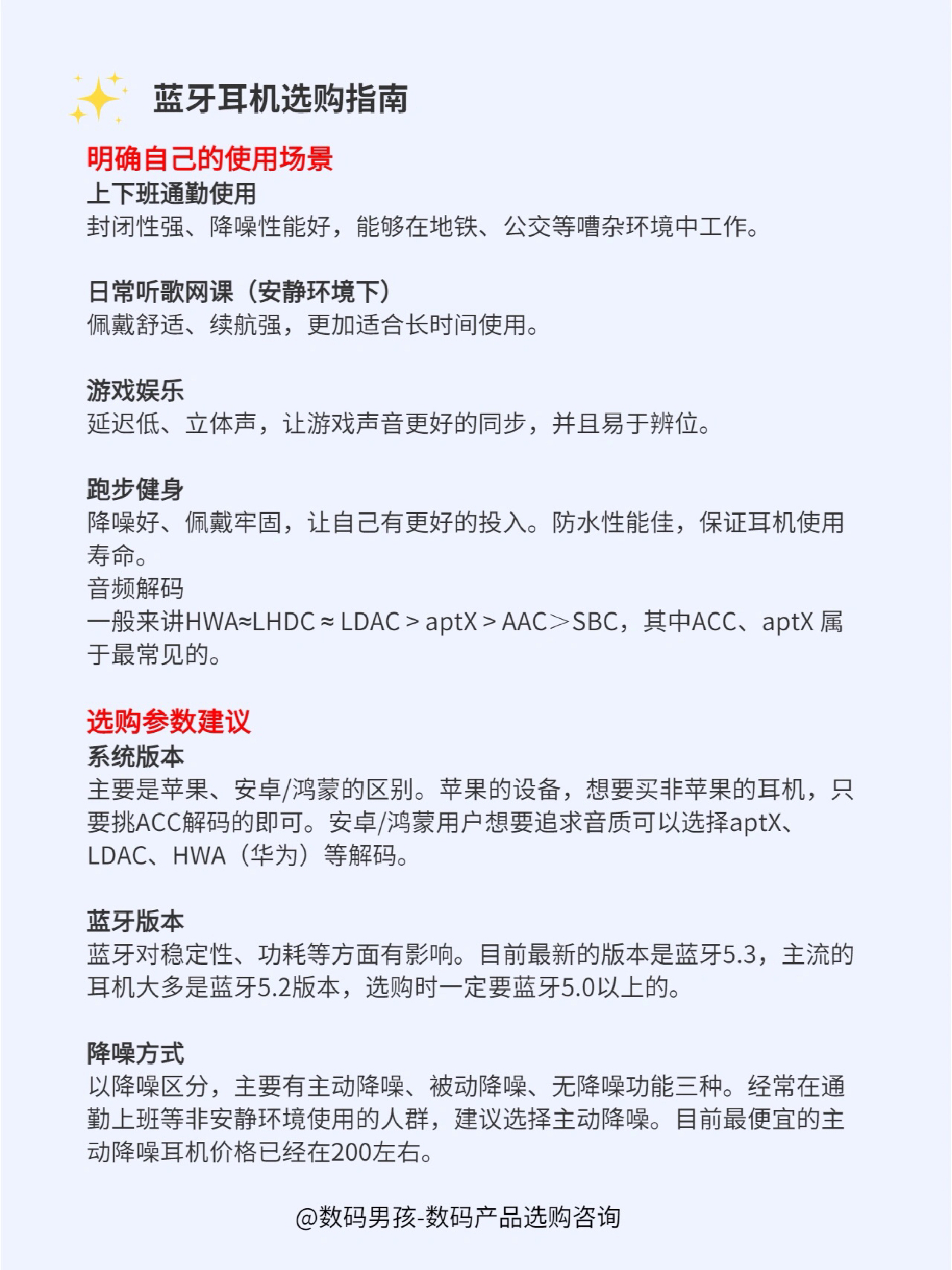 大家好,这里是数码男孩,一个10年数码控。 真无线蓝牙耳机这几年的普及率已经非常高,价格也已经可以做到非常平价。 今天我就给大家来整理一下值得购买的性价比蓝牙耳机。 根据使用场景划分,主要有日常使用、通勤、运动、游戏等,不同场景有不同的侧重要求。 选购的主要有参数有:蓝牙版本、降噪方式、佩戴方式、延迟性能、续航能力等,具体可以看图。 关于蓝牙耳机的选购,就分享这些。 大家有问题可以问。