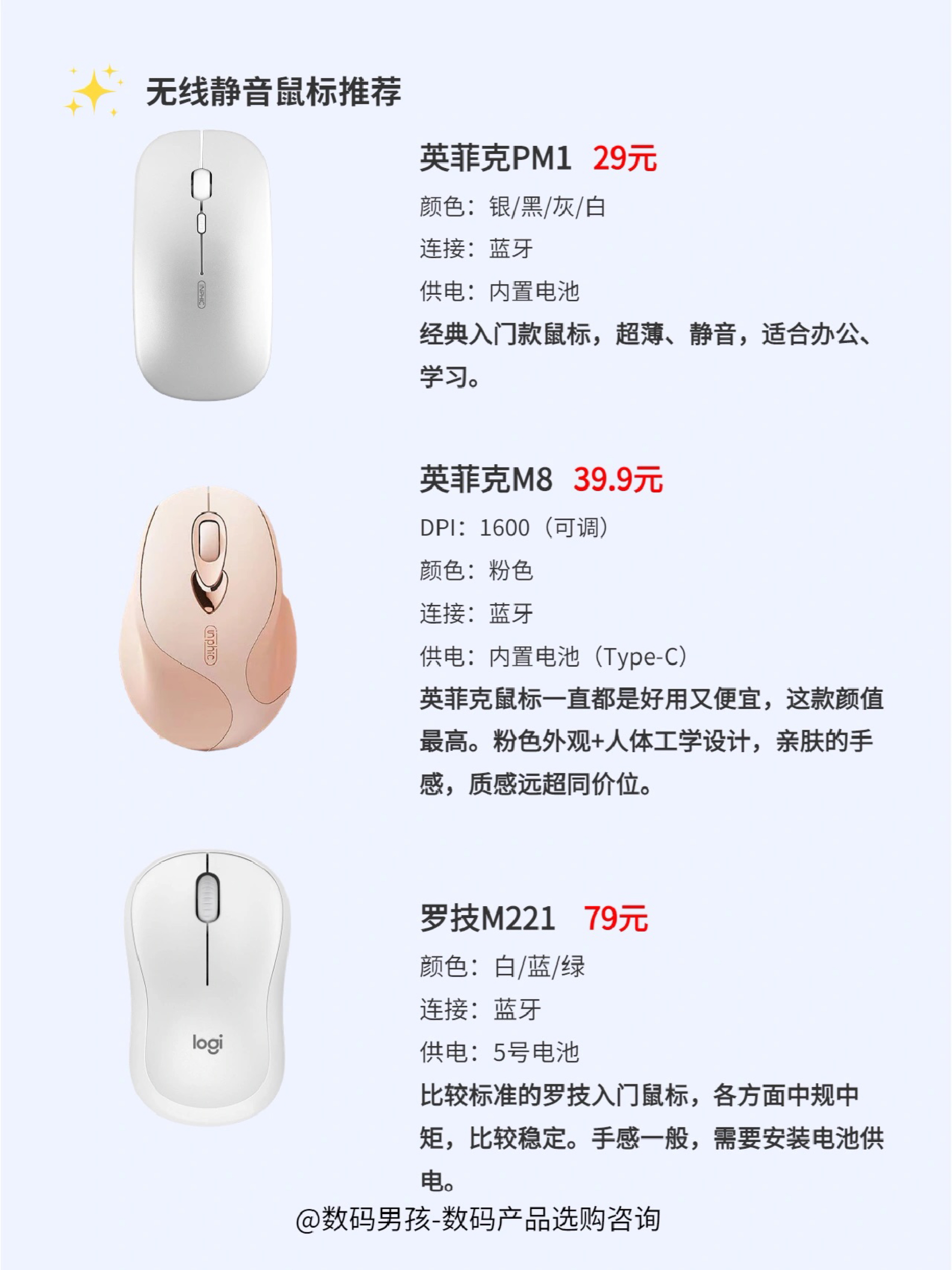 本篇笔记关联了inphic/英菲克 PM1 无线三模鼠标 静音 可充电式 无声办公 蓝牙 按键 电量显示 太空银、Logitech/罗技 M221 无线鼠标 静音 办公 轻音 小巧对称 即插即用 低延迟 安静 茱萸粉、inphic/英菲克 M8 无线 鼠标 超长待机 静音 可充电无声 办公 适用联想华硕笔记本电脑 轻音 低噪音 奶茶色等商品,为用户提供真实的使用体验和购买参考。