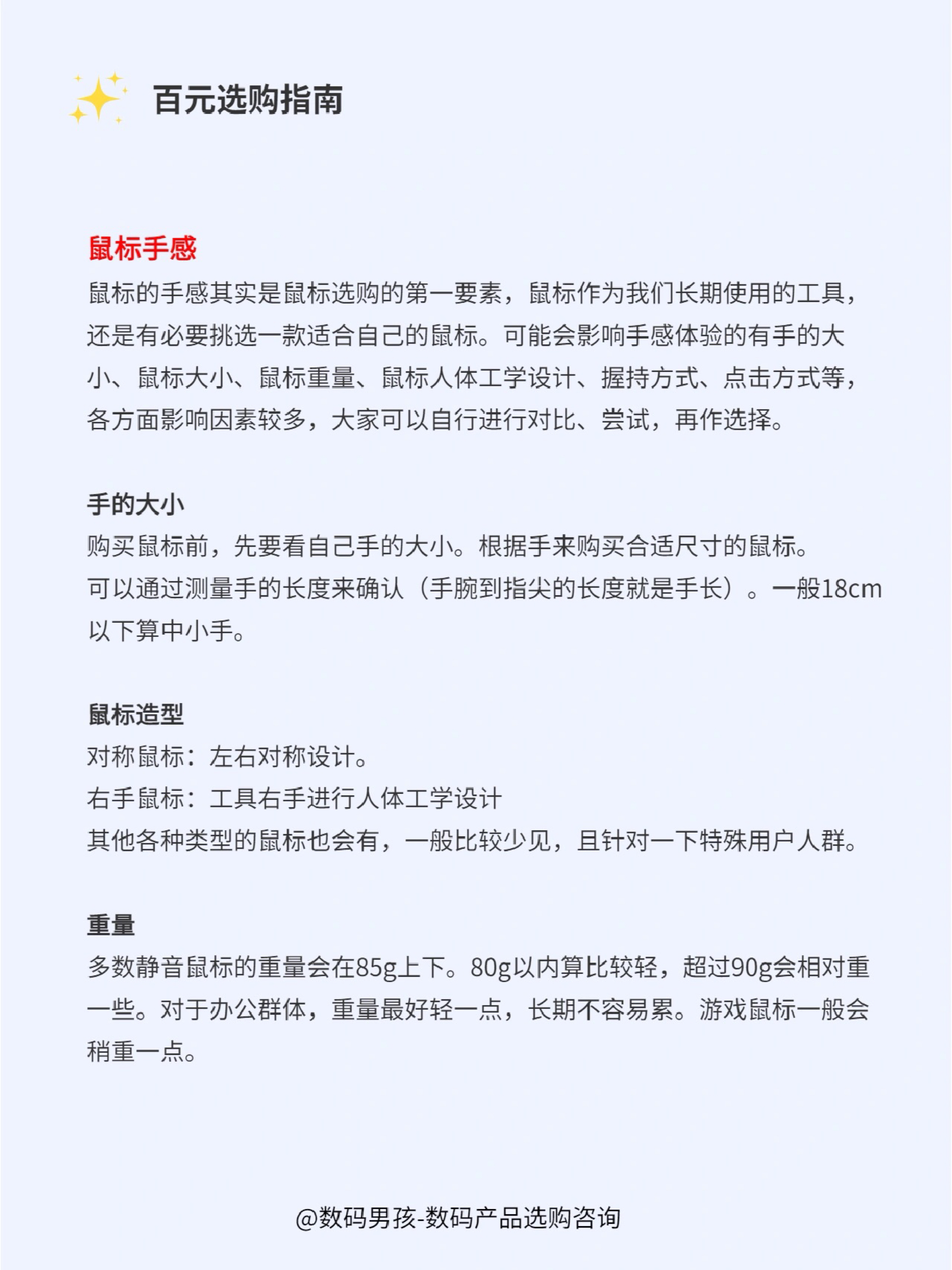 大家好,这里是数码男孩,一个十年数码控。已经有好几个小伙伴找我推荐鼠标了,要求都是好用、好看,还要百元以内。今天我就来给大家推荐一下百元以内最值得买的几款鼠标。 鼠标选择的几项重要参数 手感方面: 1.手型大小,手型大小需要和鼠标大小进行匹配。 2.鼠标造型,如果长期高强度使用,最好选择人体工学设计好一点的鼠标。 3.重量,日常使用轻一点最好。当然也需要兼顾质感,塑料感重的话体验也不好。 性能方面...