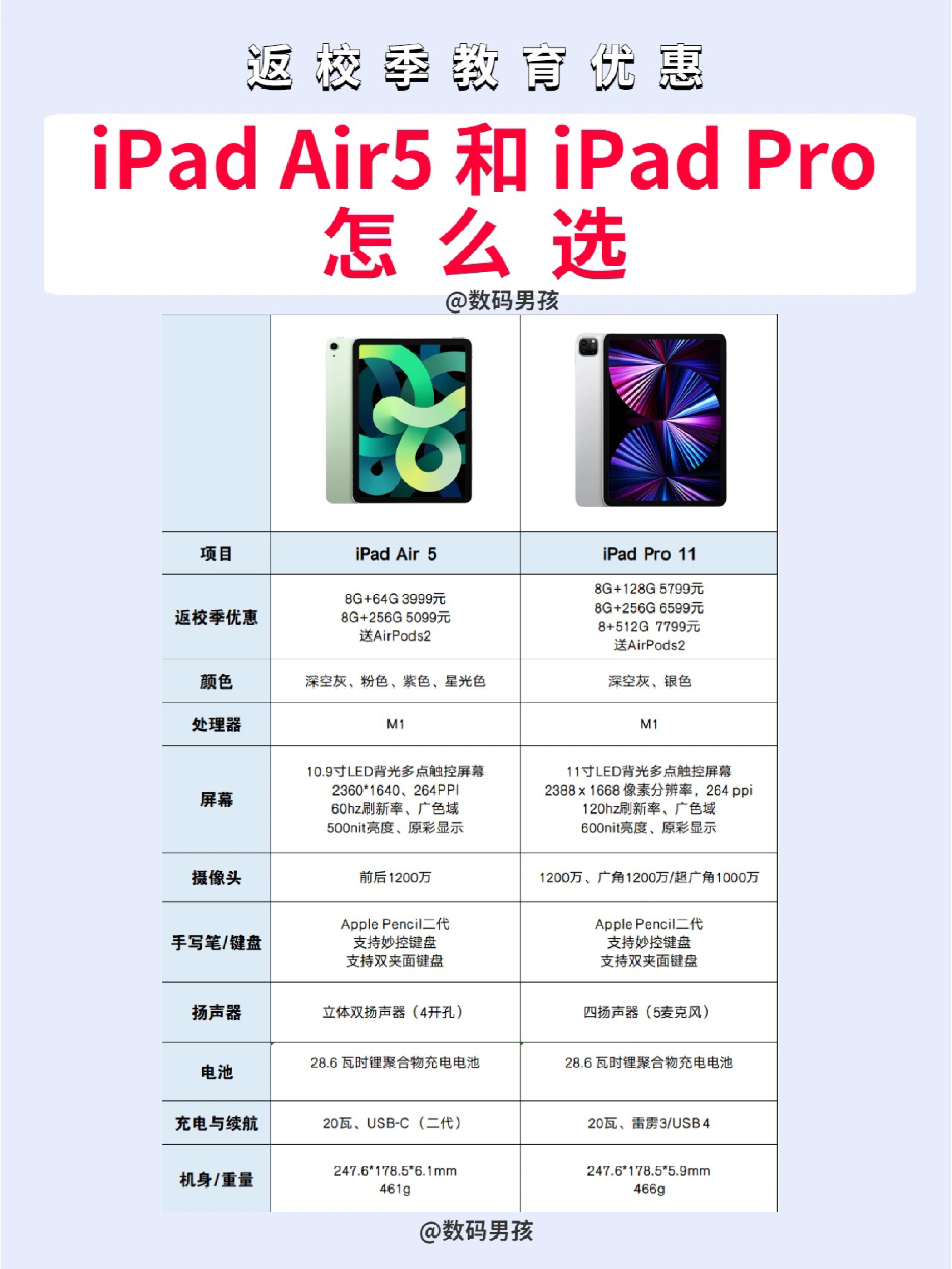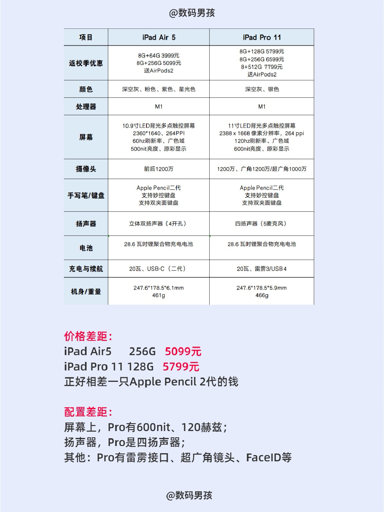大家好,这里是数码男孩,一个10年数码控。 最近返校季优惠,很多小伙伴打算买平板电脑,但是却一直在iPad air5和iPad Pro11之间犹豫。今天就来给大家解析一下‼️‼️ 👉🏻价格差距: iPad Air5 256G 5099元 iPad Pro 11 128G 5799元 正好相差一只Apple Pencil 2代的钱 👉🏻配置差距: 屏幕上,Pro有600nit、12...