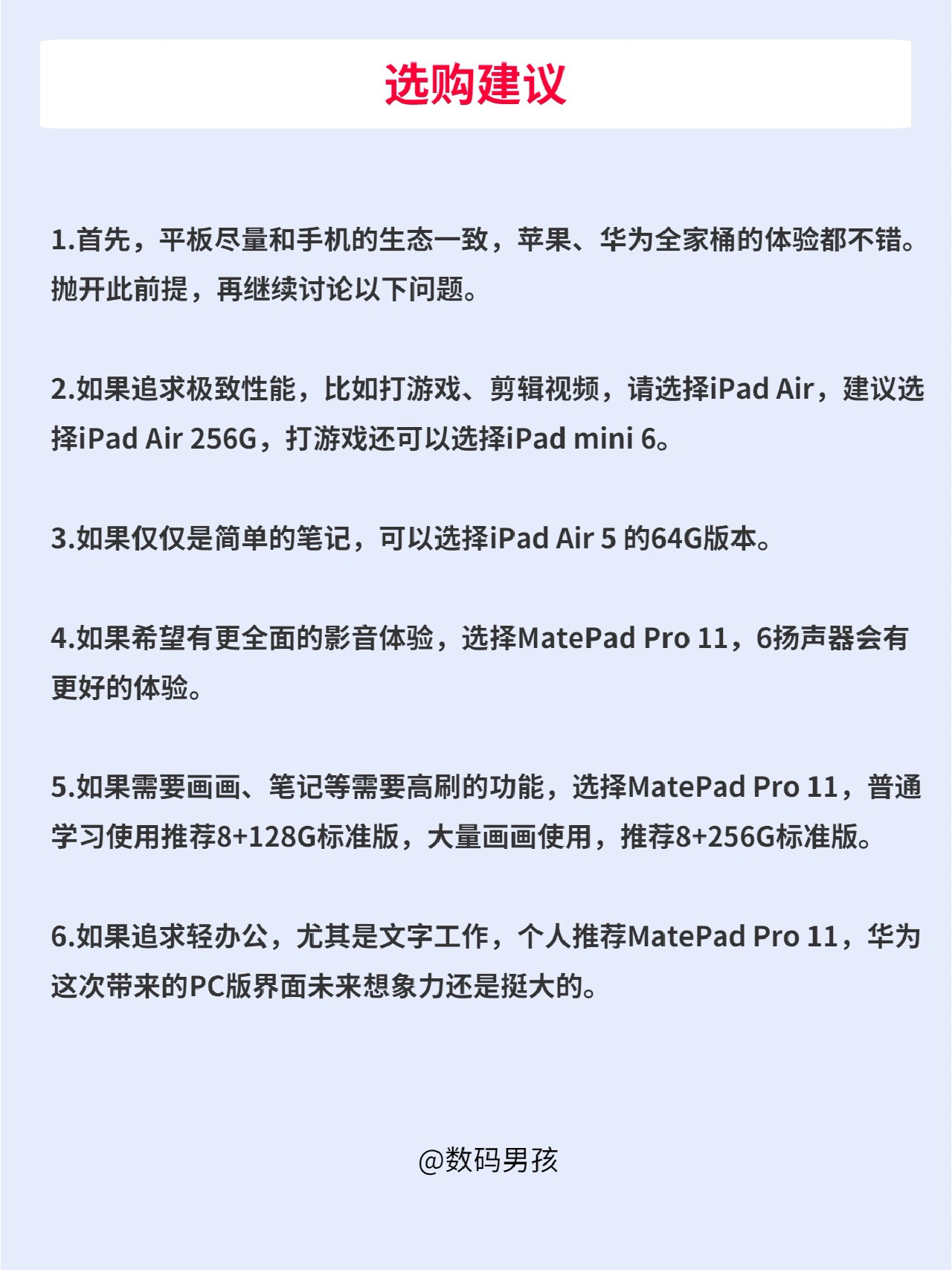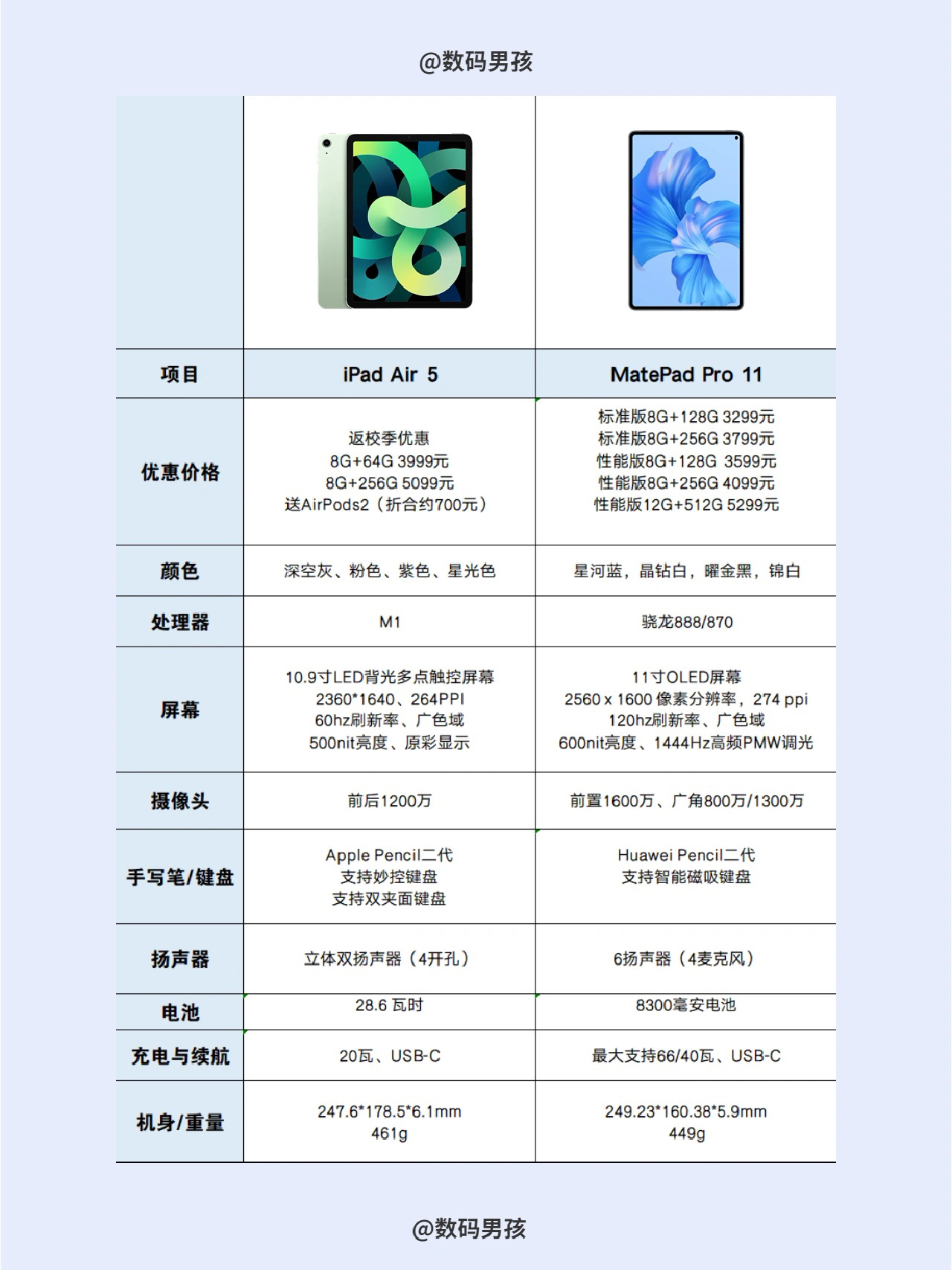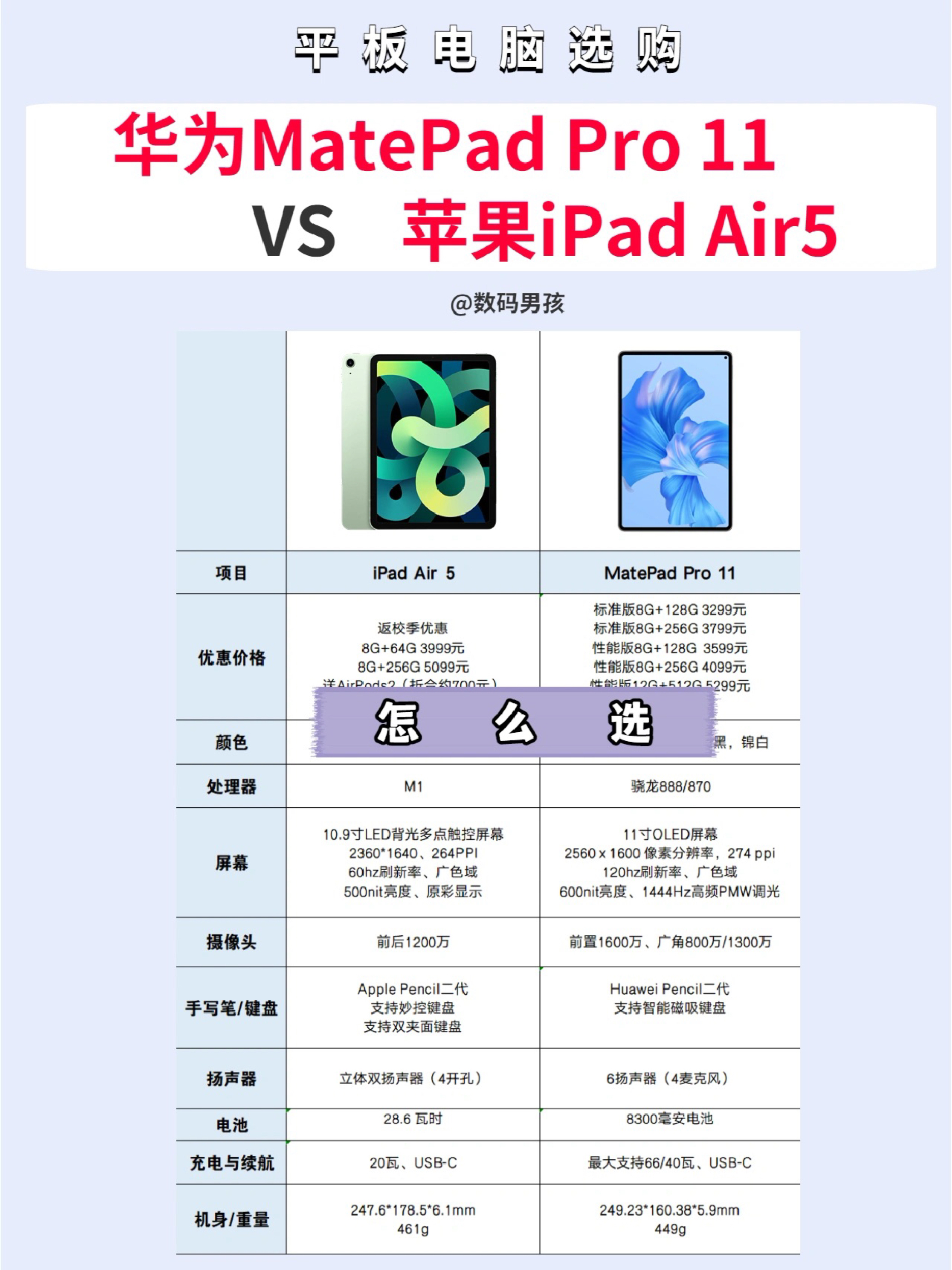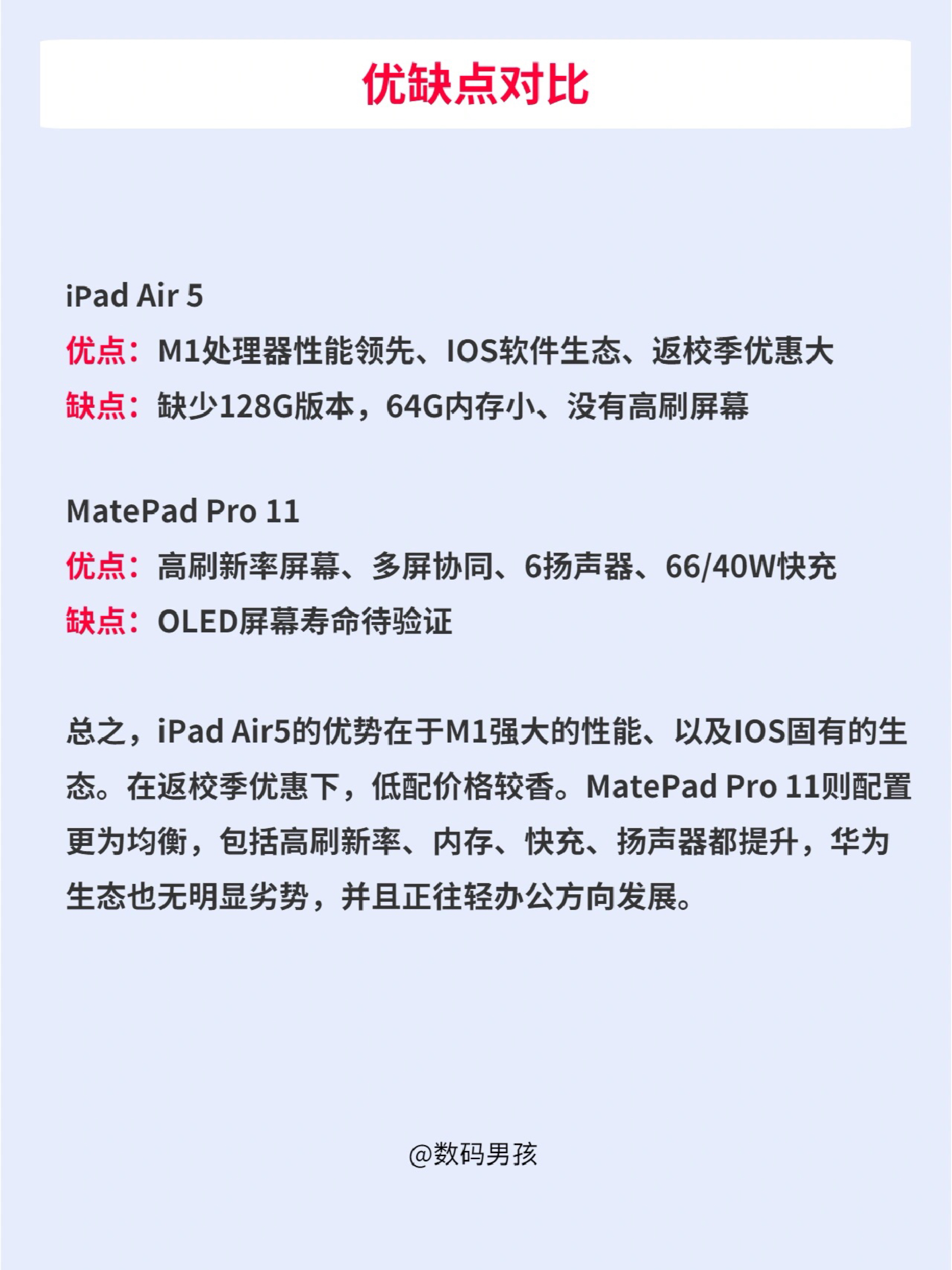 大家好,这里是数码男孩,一个10年数码控。 昨天华为更新了新款华为matepad Pro11,很多小伙伴很纠结正在返校季优惠的iPad Air5,今天就来给大家解析一下。 优缺点对比 iPad Air 5 优点:M1处理器性能领先、IOS软件生态、返校季优惠大 缺点:缺少128G版本,64G内存小、没有高刷屏幕 MatePad Pro 11 优点:高刷新率屏幕、多屏协同、6扬声器、66/40W快充...